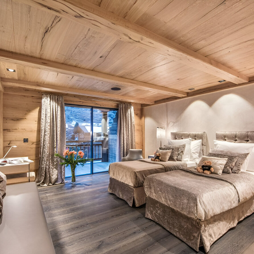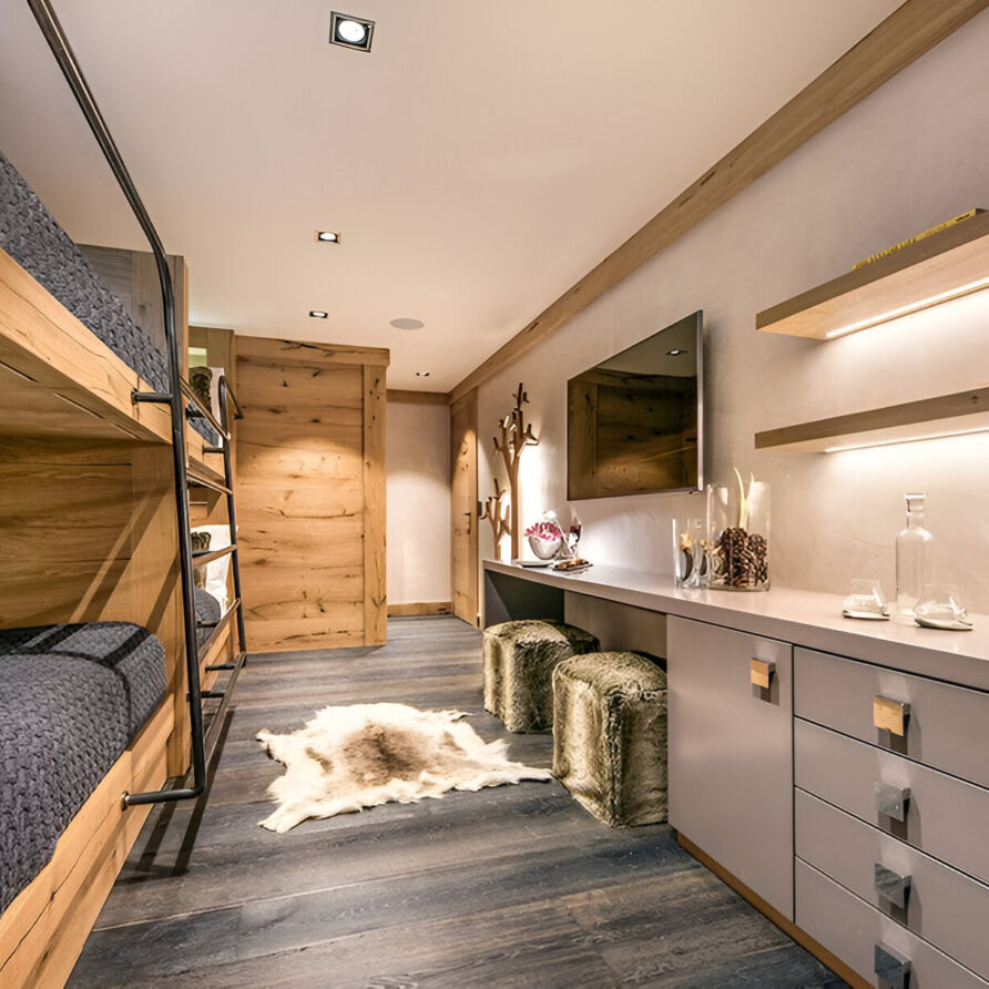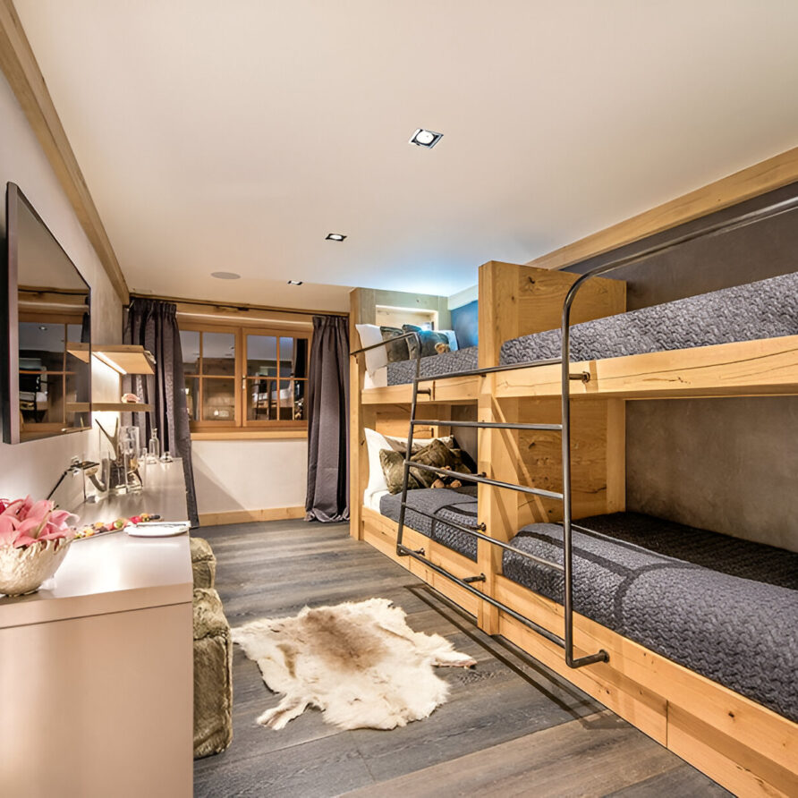 Five bedrooms, each with an en-suite bathroom, provide honeymoon-worthy accommodations for adults and separate, family-friendly spaces that kids will love. There are two bedrooms with king beds that open to balconies, one of which has Matterhorn views, and two bedrooms with twin beds that open to balconies, again including one with Matterhorn views. The children’s room has four bunk beds.