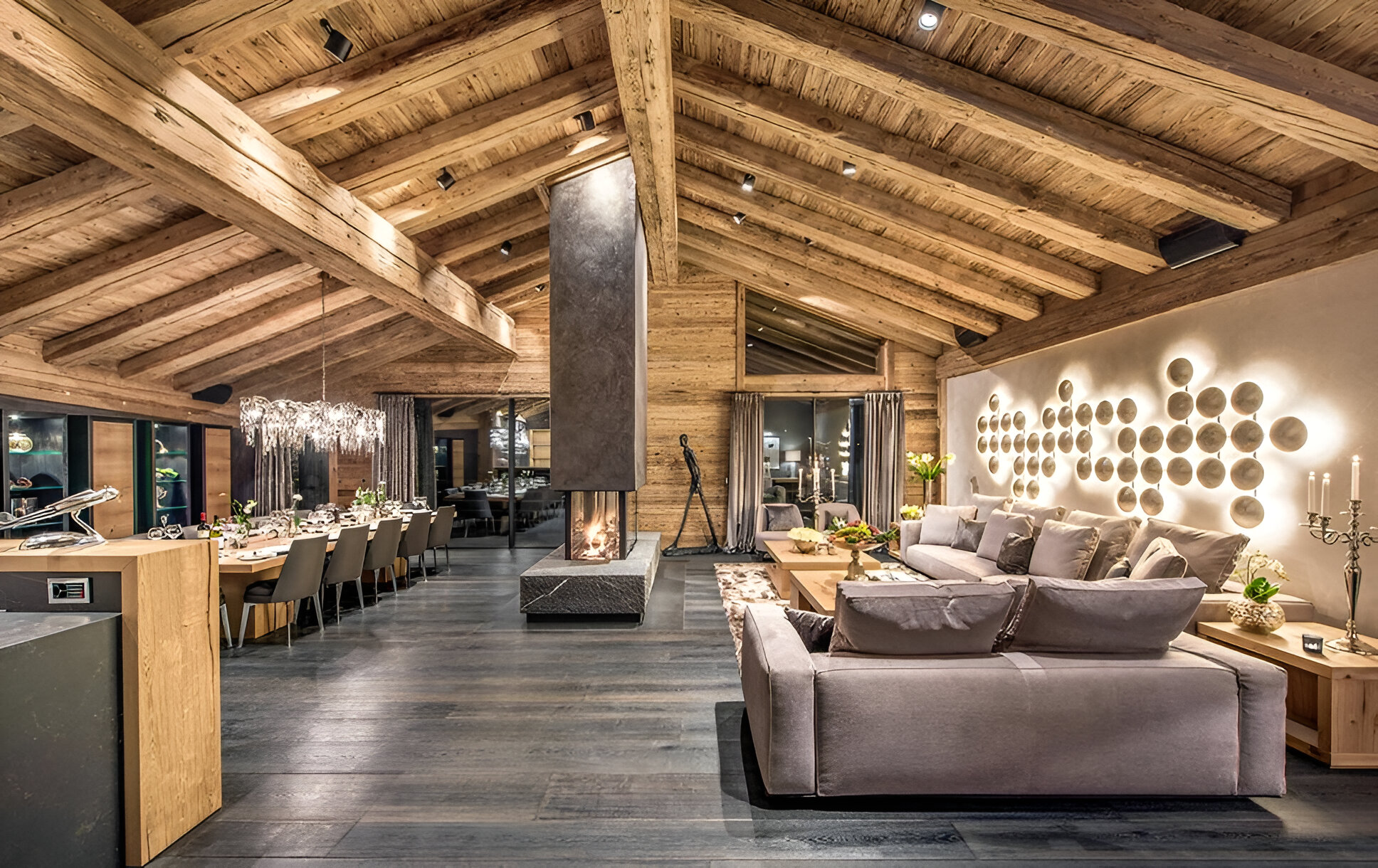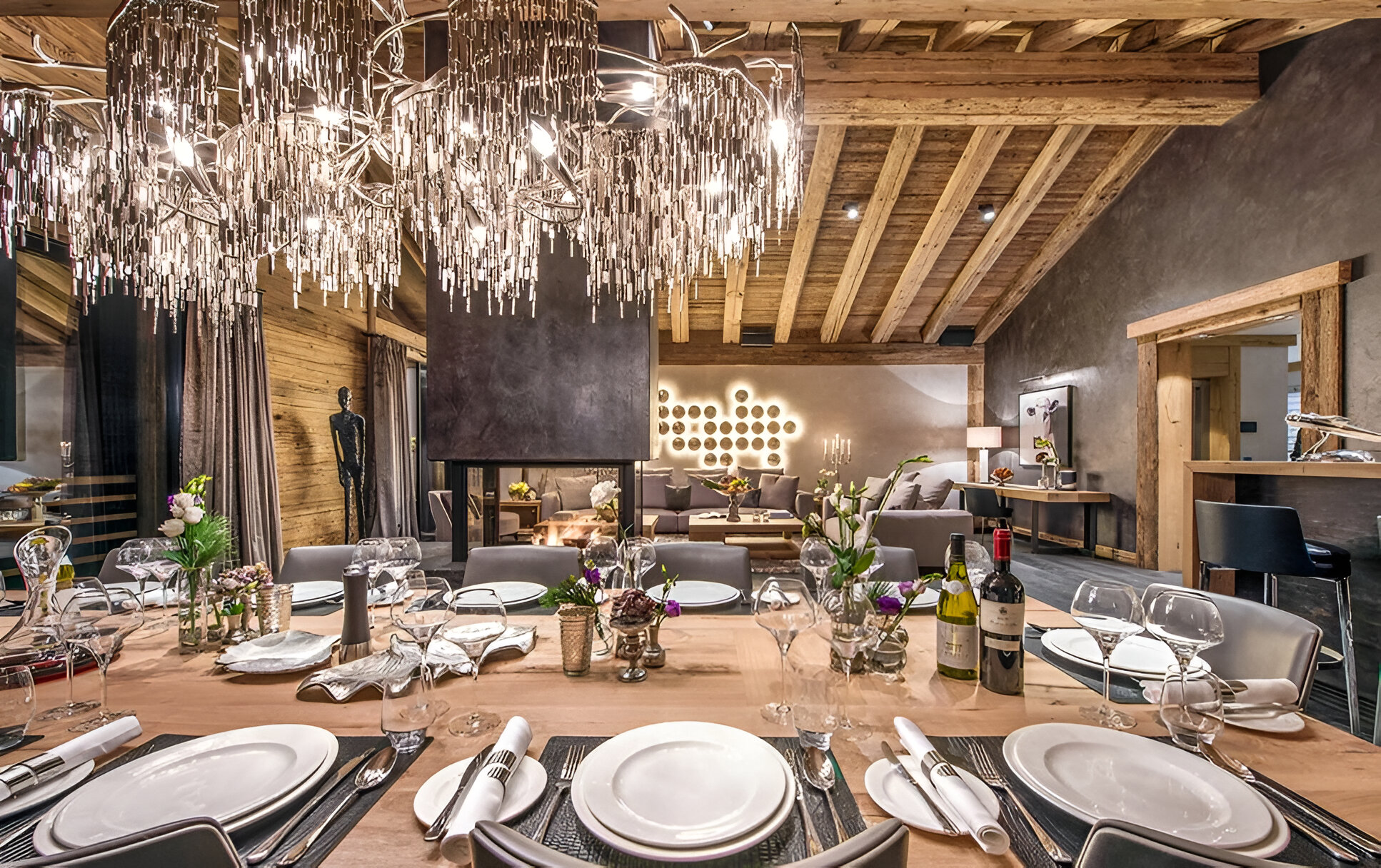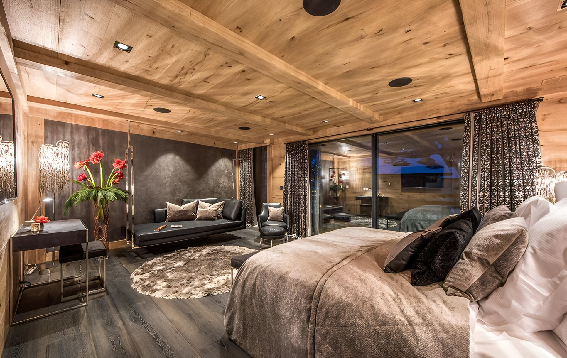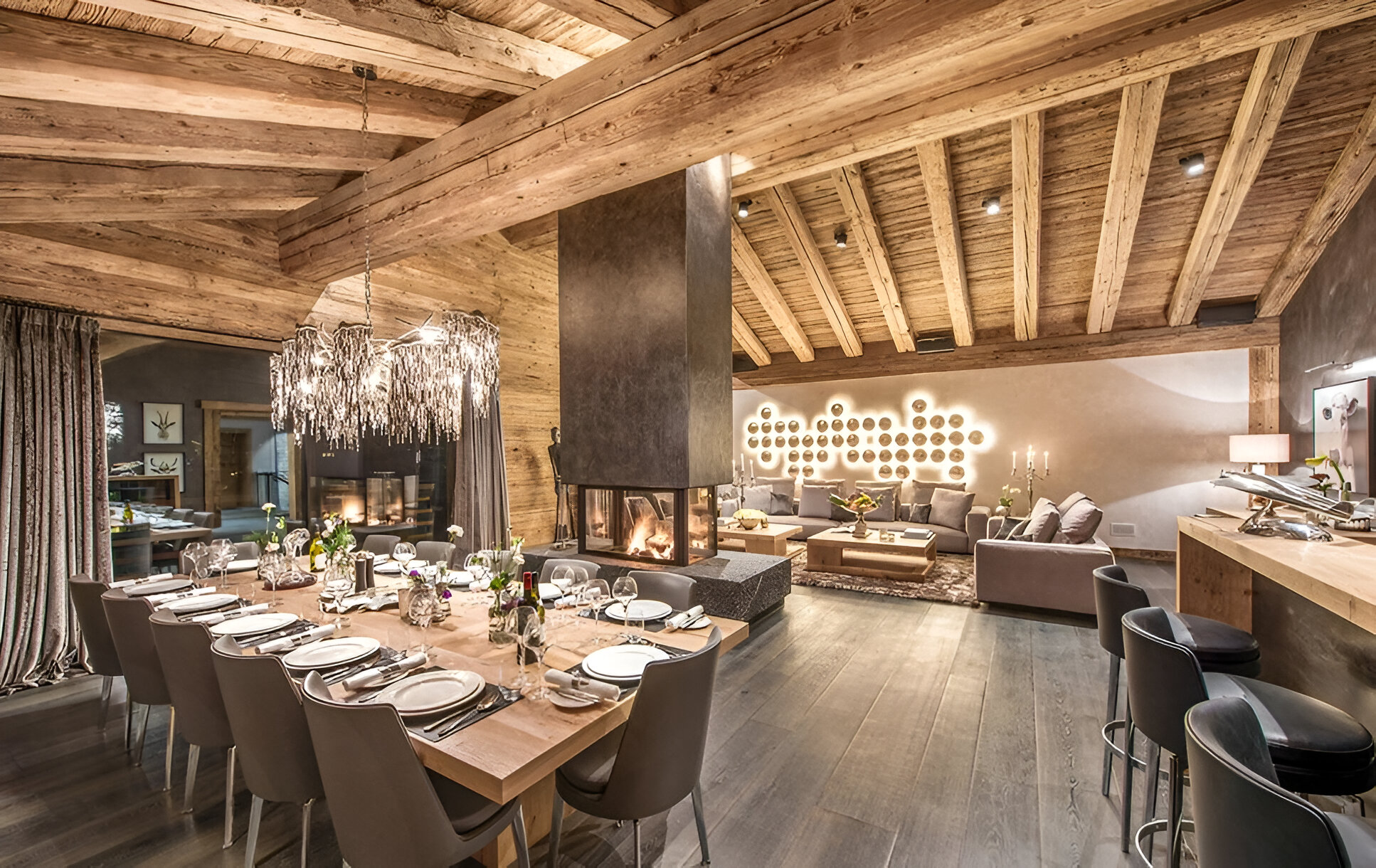 The chalet’s mix of reclaimed timbers and modern furnishings creates a refined yet warm feel. The top-floor main living area is set under a traditional sloped ceiling and features comfortable sitting and dining areas laid out around a sleek double-sided fireplace and picture windows that frame the mountain views. Though there is a fully equipped open kitchen in one corner of the room for your use, there’s also a separate professional kitchen for the staff.