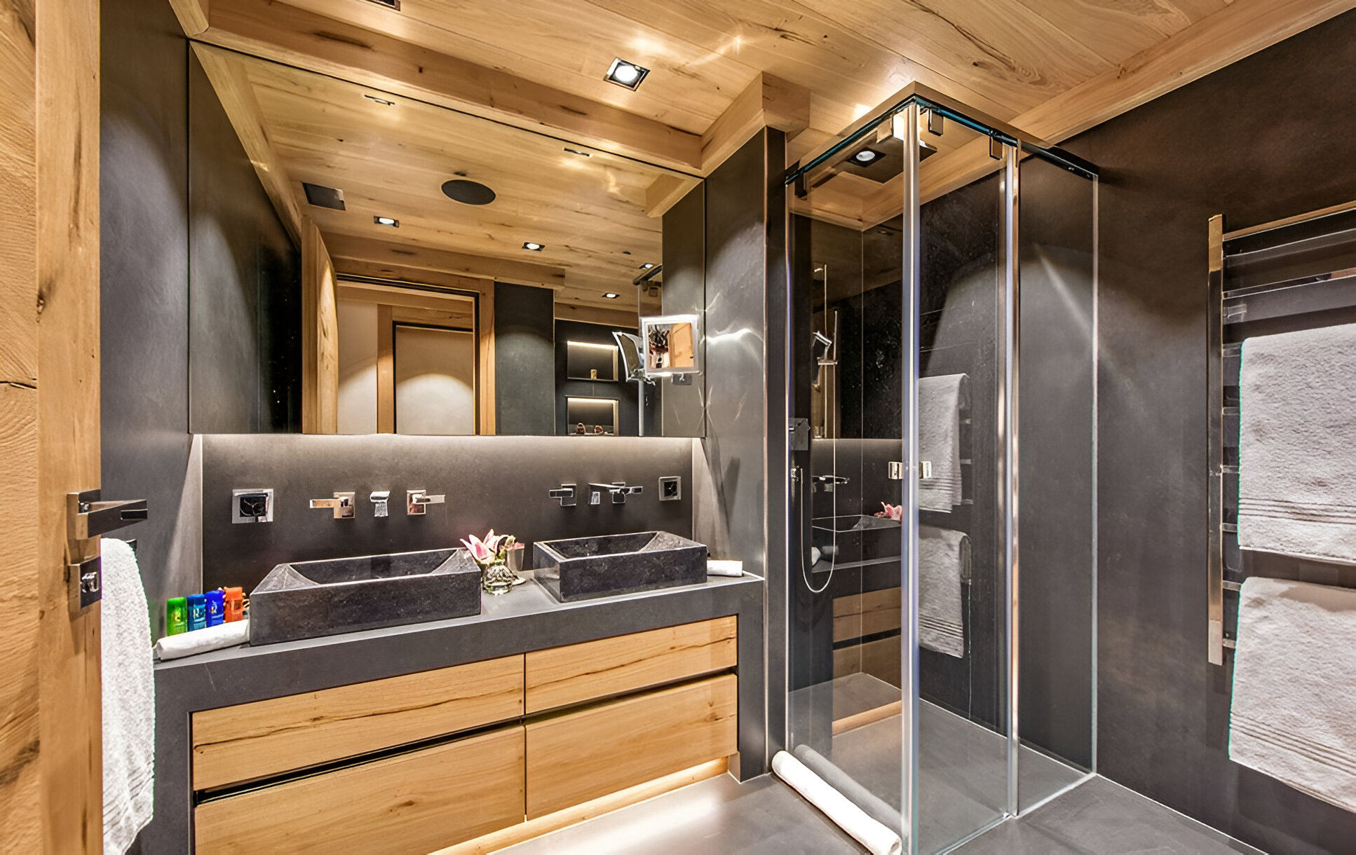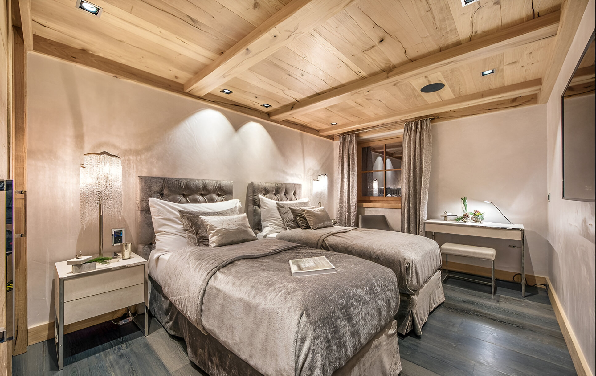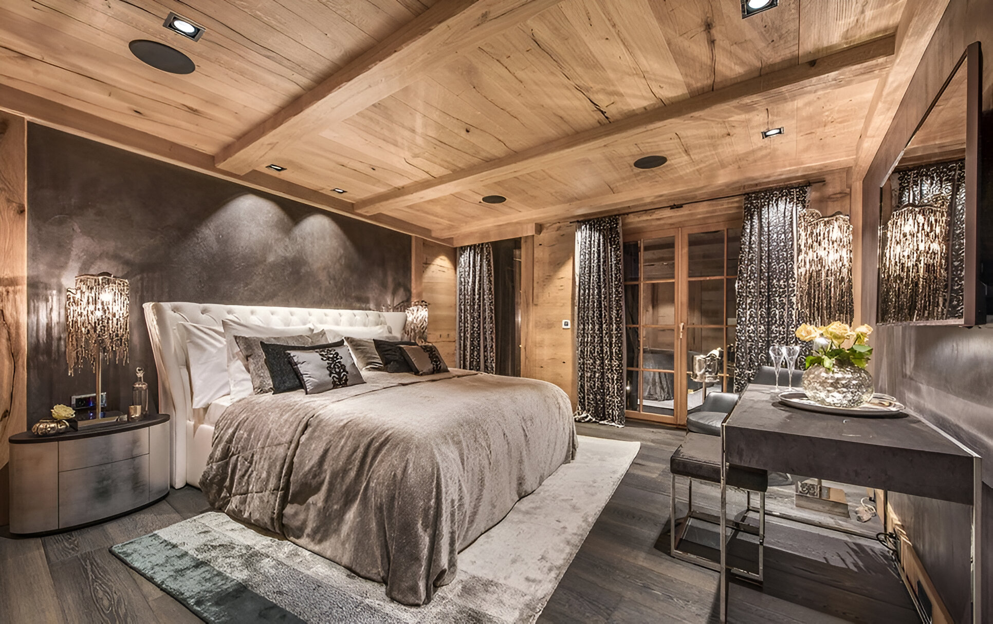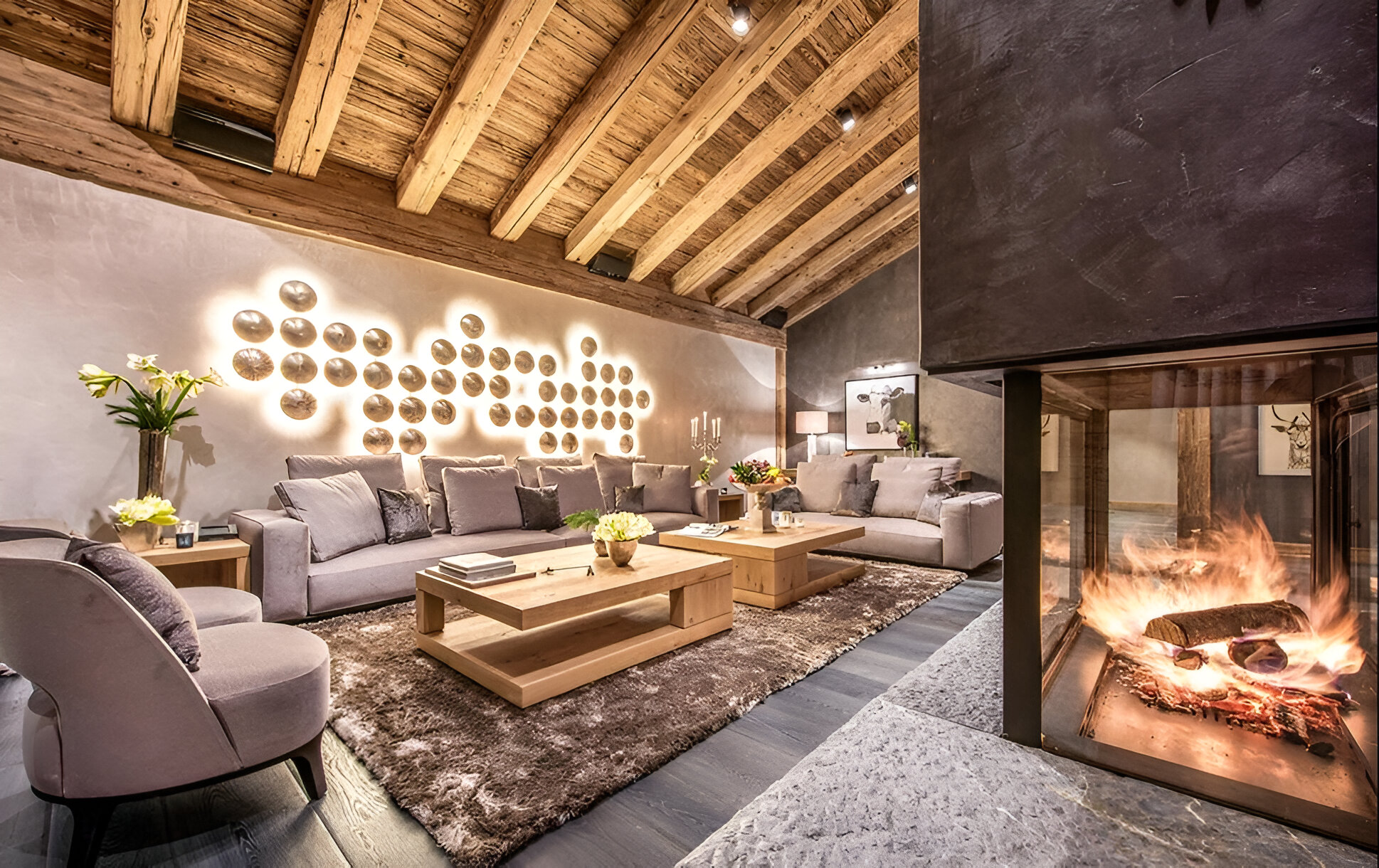 The chalet’s mix of reclaimed timbers and modern furnishings creates a refined yet warm feel. The top-floor main living area is set under a traditional sloped ceiling and features comfortable sitting and dining areas laid out around a sleek double-sided fireplace and picture windows that frame the mountain views. Though there is a fully equipped open kitchen in one corner of the room for your use, there’s also a separate professional kitchen for the staff.