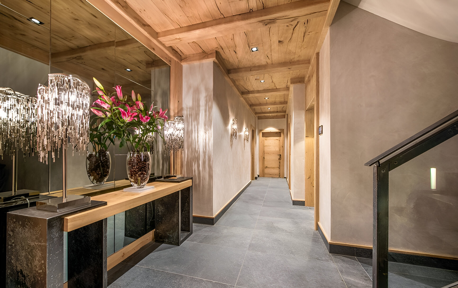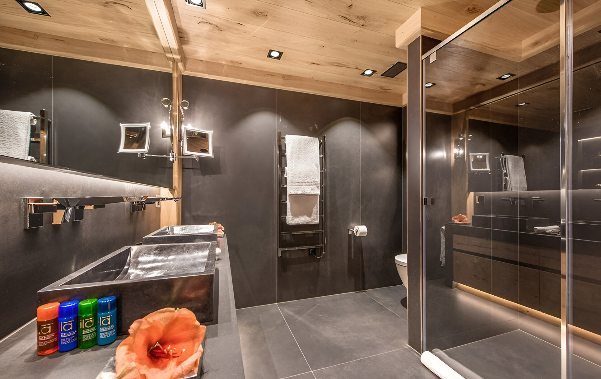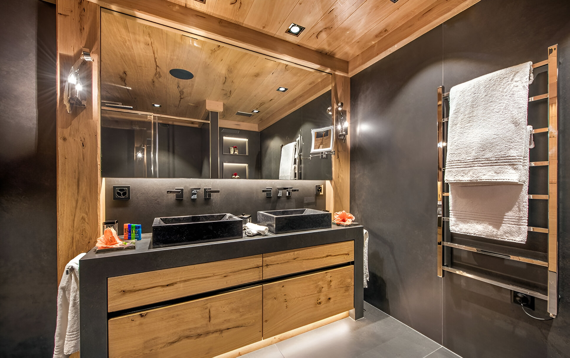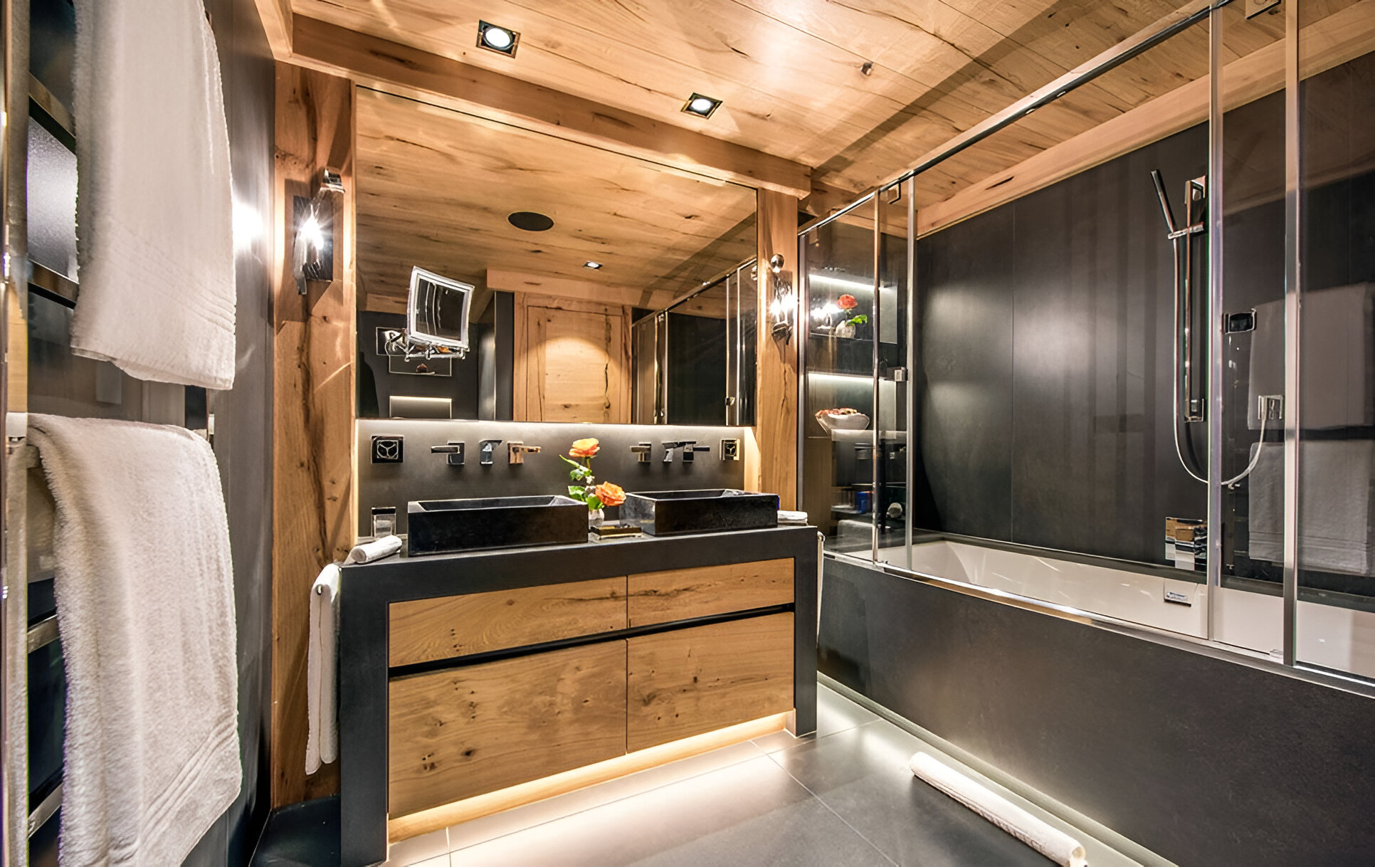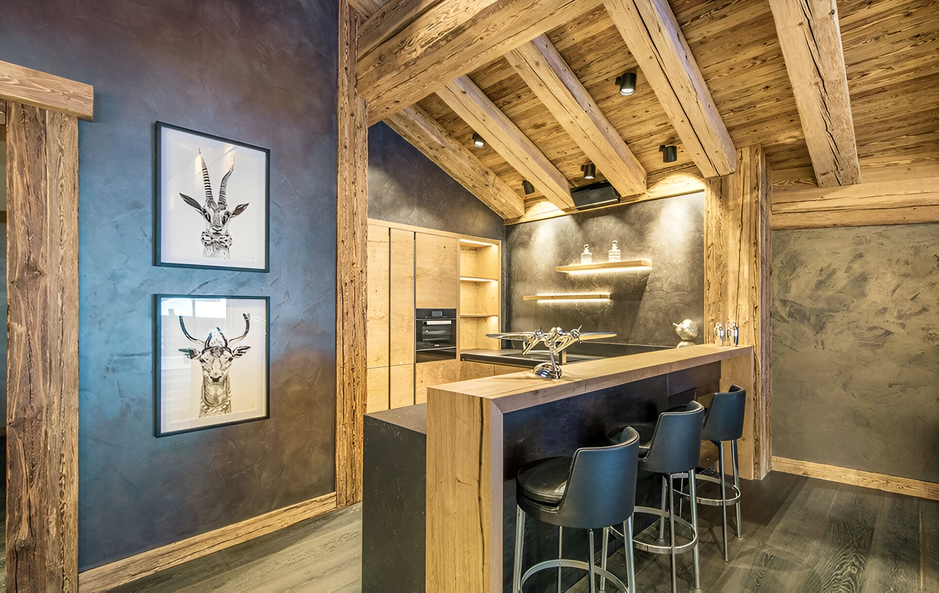 The chalet’s mix of reclaimed timbers and modern furnishings creates a refined yet warm feel. The top-floor main living area is set under a traditional sloped ceiling and features comfortable sitting and dining areas laid out around a sleek double-sided fireplace and picture windows that frame the mountain views. Though there is a fully equipped open kitchen in one corner of the room for your use, there’s also a separate professional kitchen for the staff.