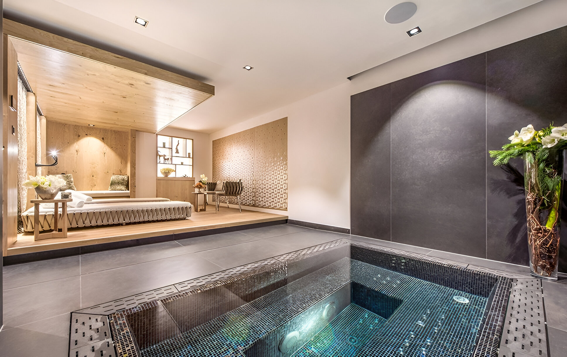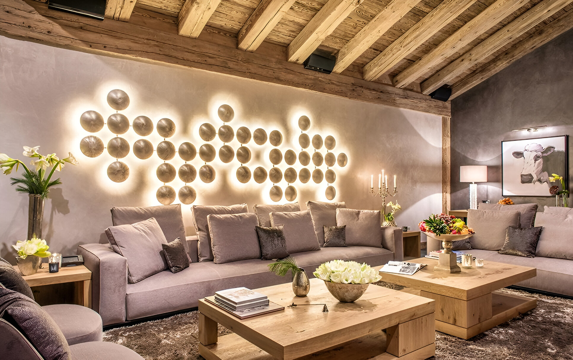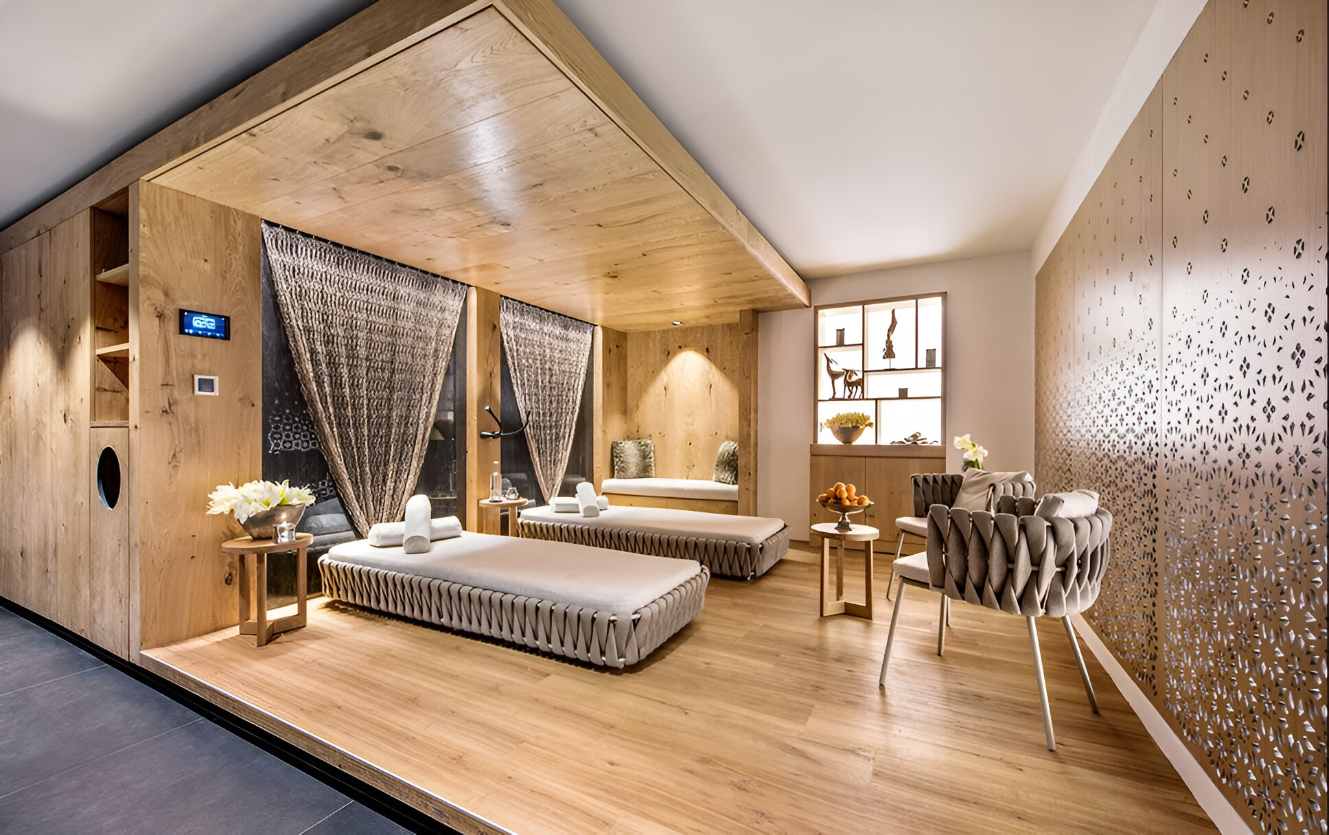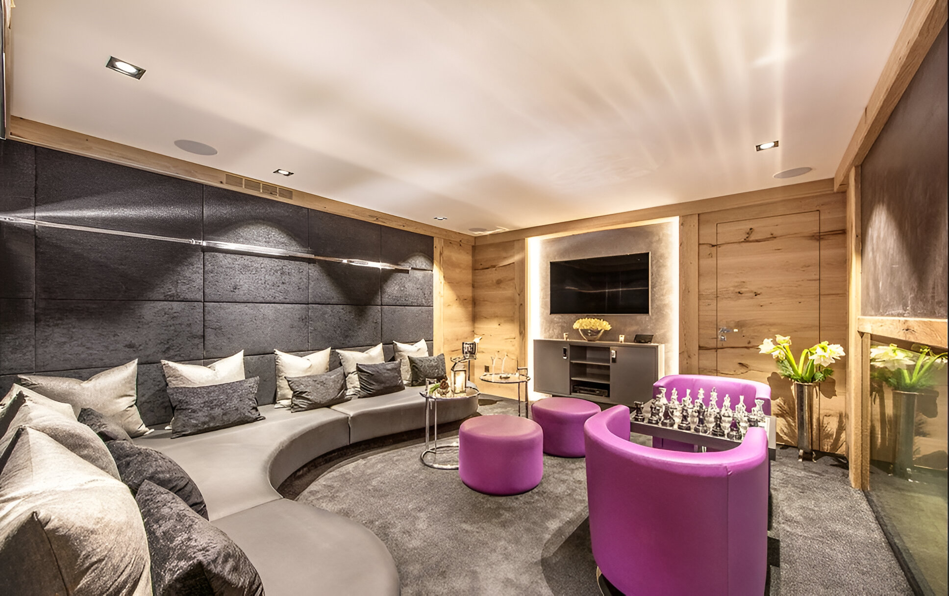The chalet’s mix of reclaimed timbers and modern furnishings creates a refined yet warm feel. The top-floor main living area is set under a traditional sloped ceiling and features comfortable sitting and dining areas laid out around a sleek double-sided fireplace and picture windows that frame the mountain views. Though there is a fully equipped open kitchen in one corner of the room for your use, there’s also a separate professional kitchen for the staff.