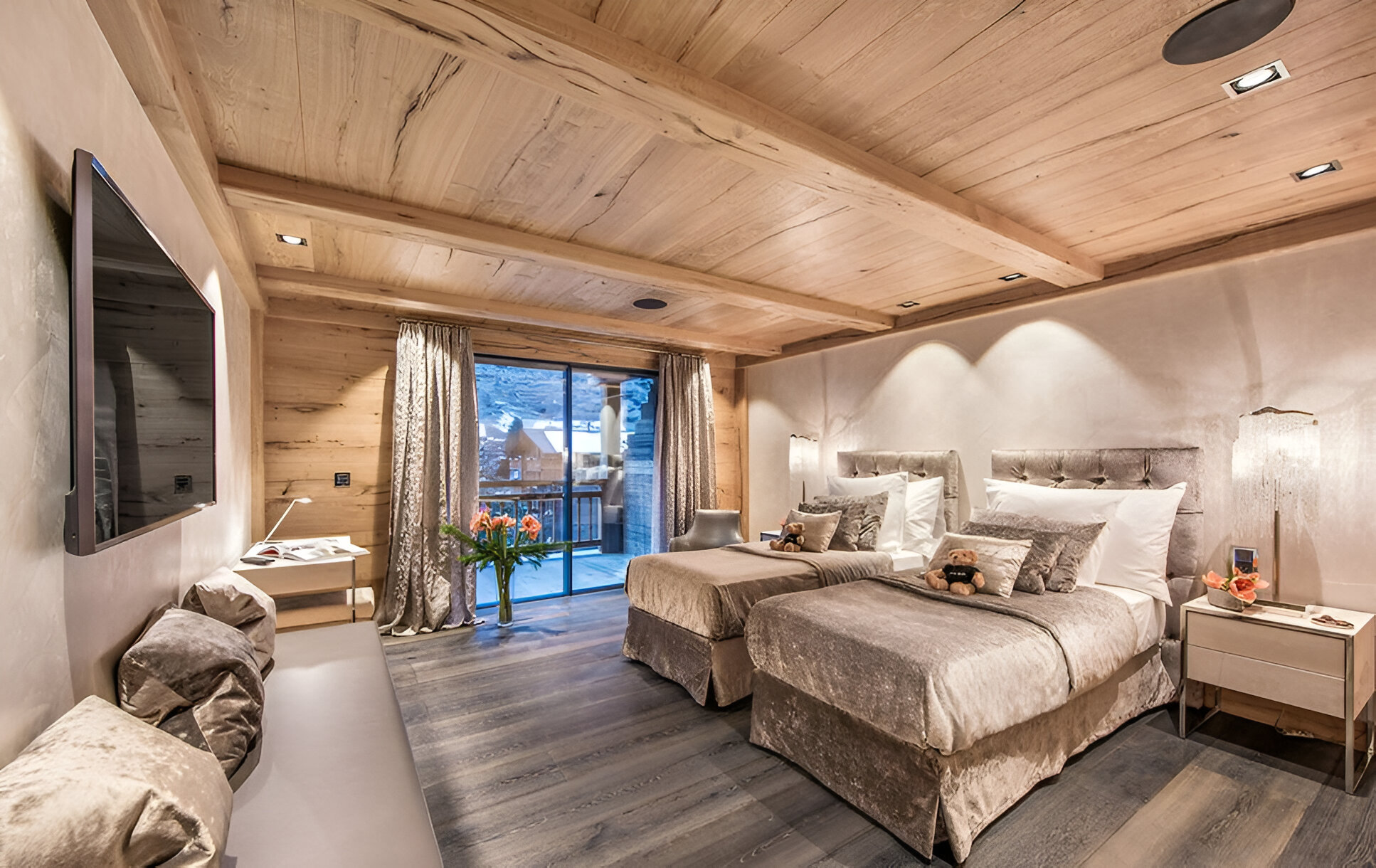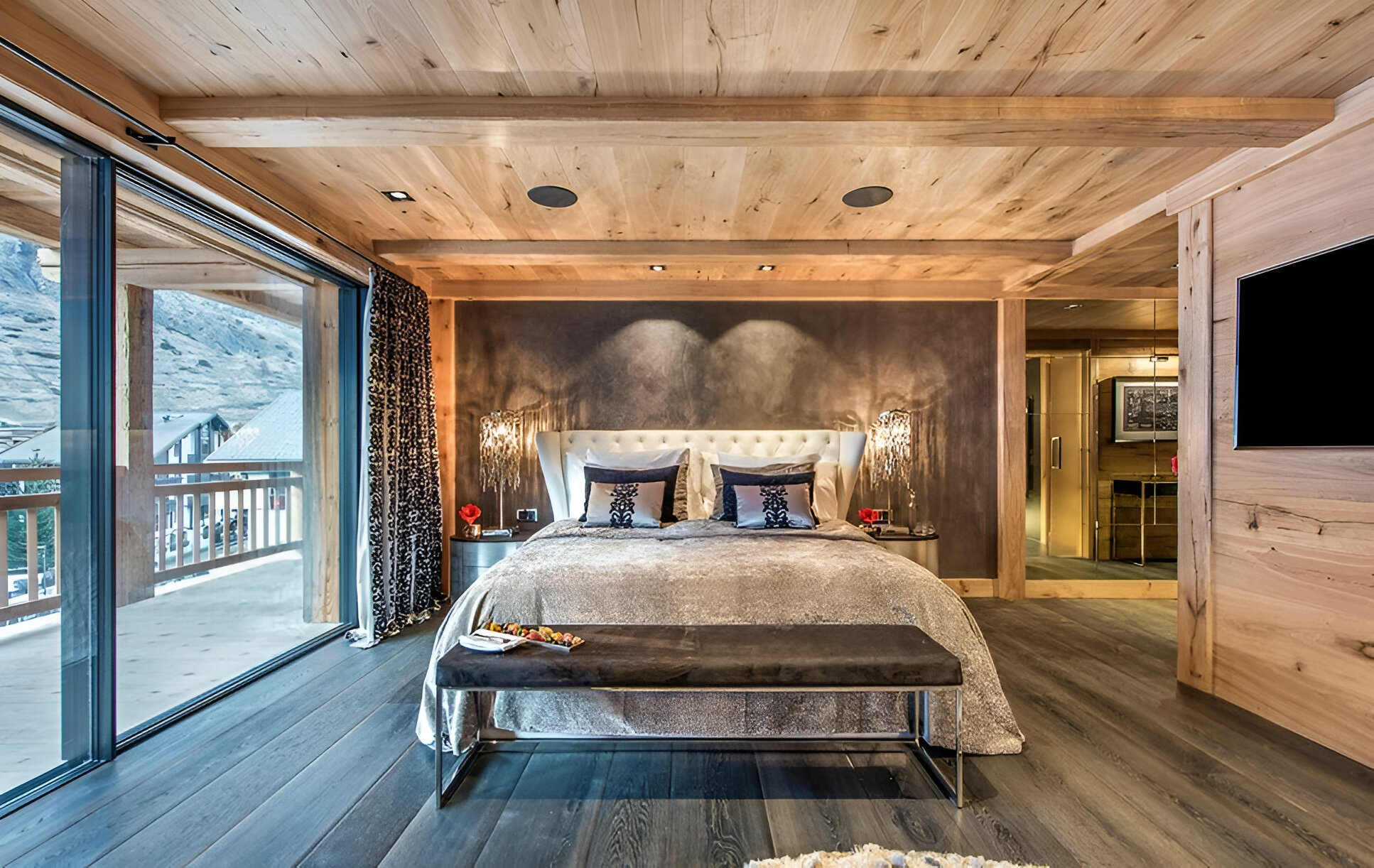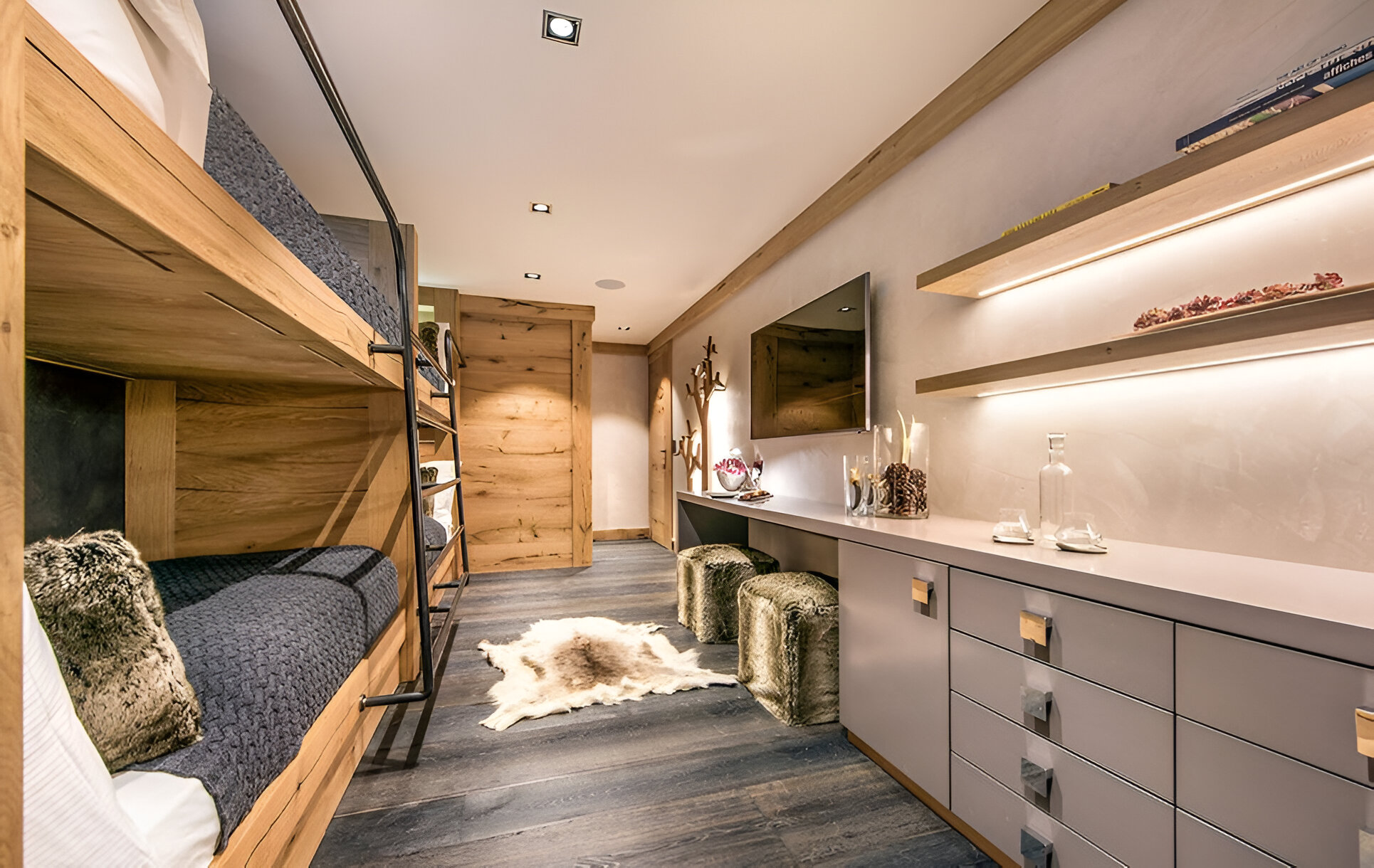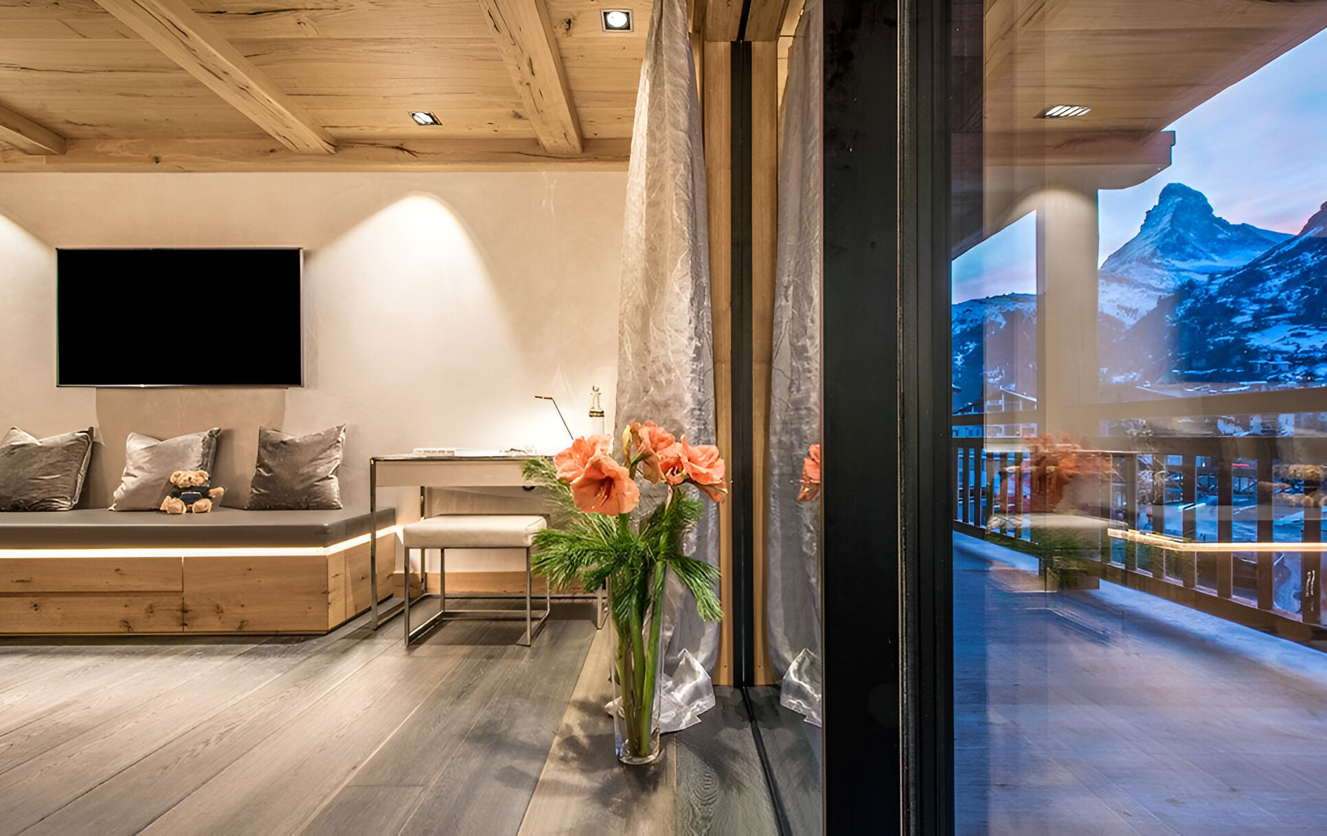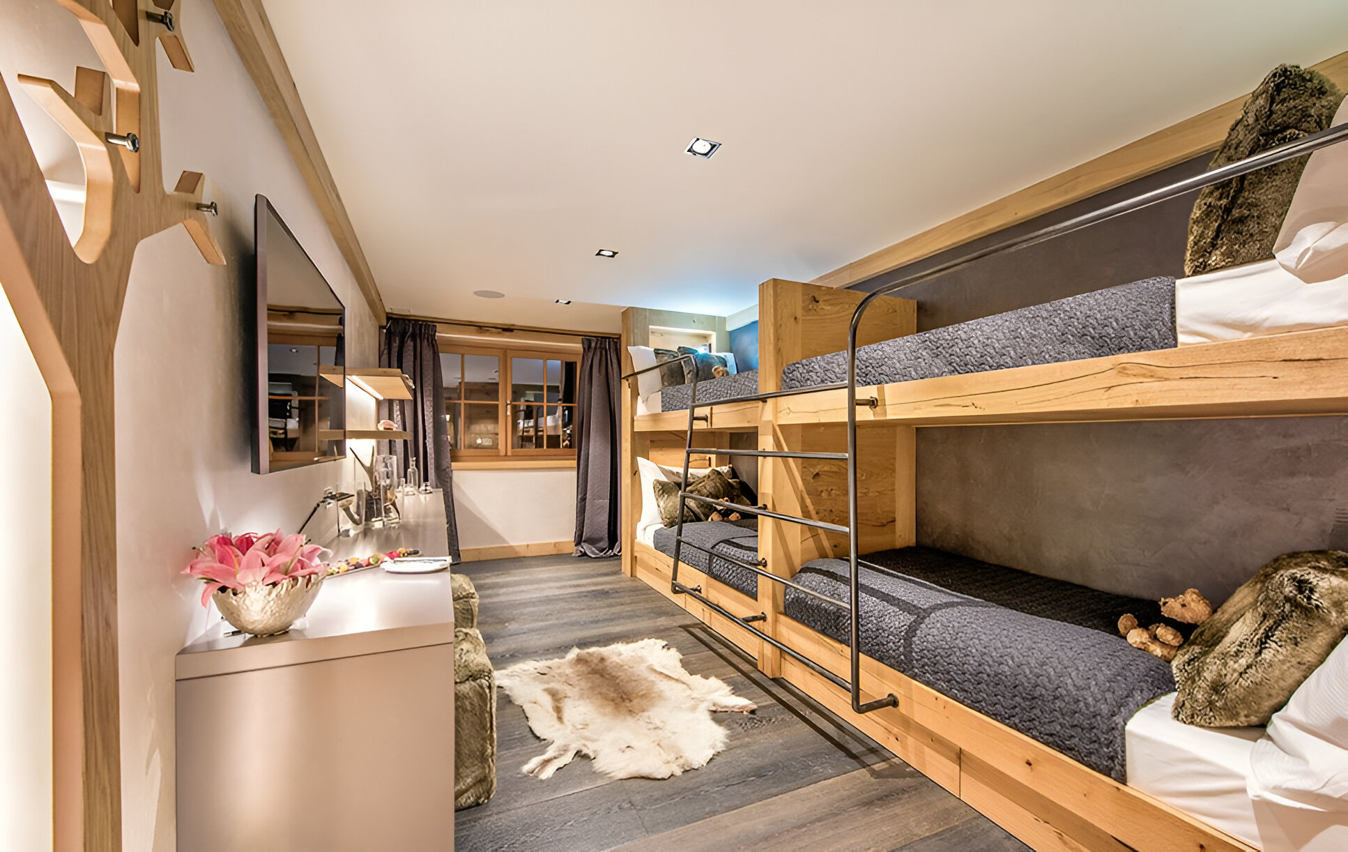 Five bedrooms, each with an en-suite bathroom, provide honeymoon-worthy accommodations for adults and separate, family-friendly spaces that kids will love. There are two bedrooms with king beds that open to balconies, one of which has Matterhorn views, and two bedrooms with twin beds that open to balconies, again including one with Matterhorn views. The children’s room has four bunk beds.