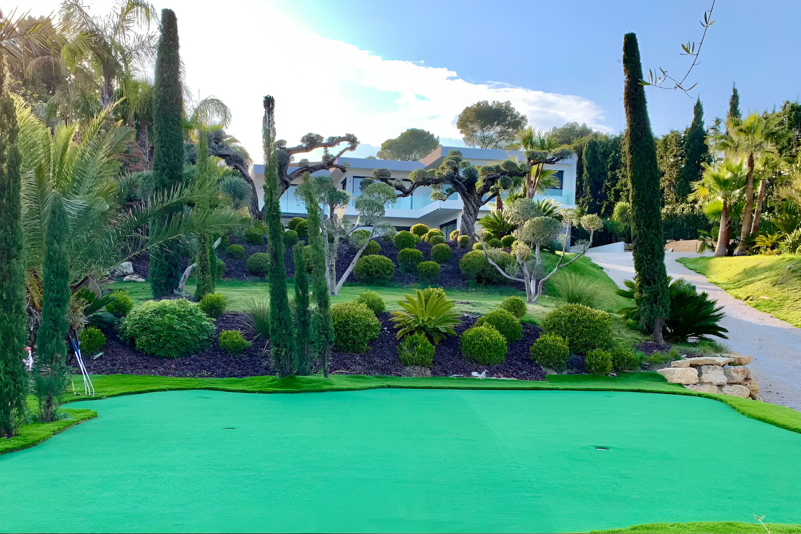 Secluded amid beautifully landscaped gardens, this contemporary masterwork gazes out on sweeping views. Architect René Jean Rinaldi has balanced a deep respect for the plain-air pleasures of the Côte d’Azur with superb luxury amenities, ranging from a golf putting green to a hotel-grade wellness spa.