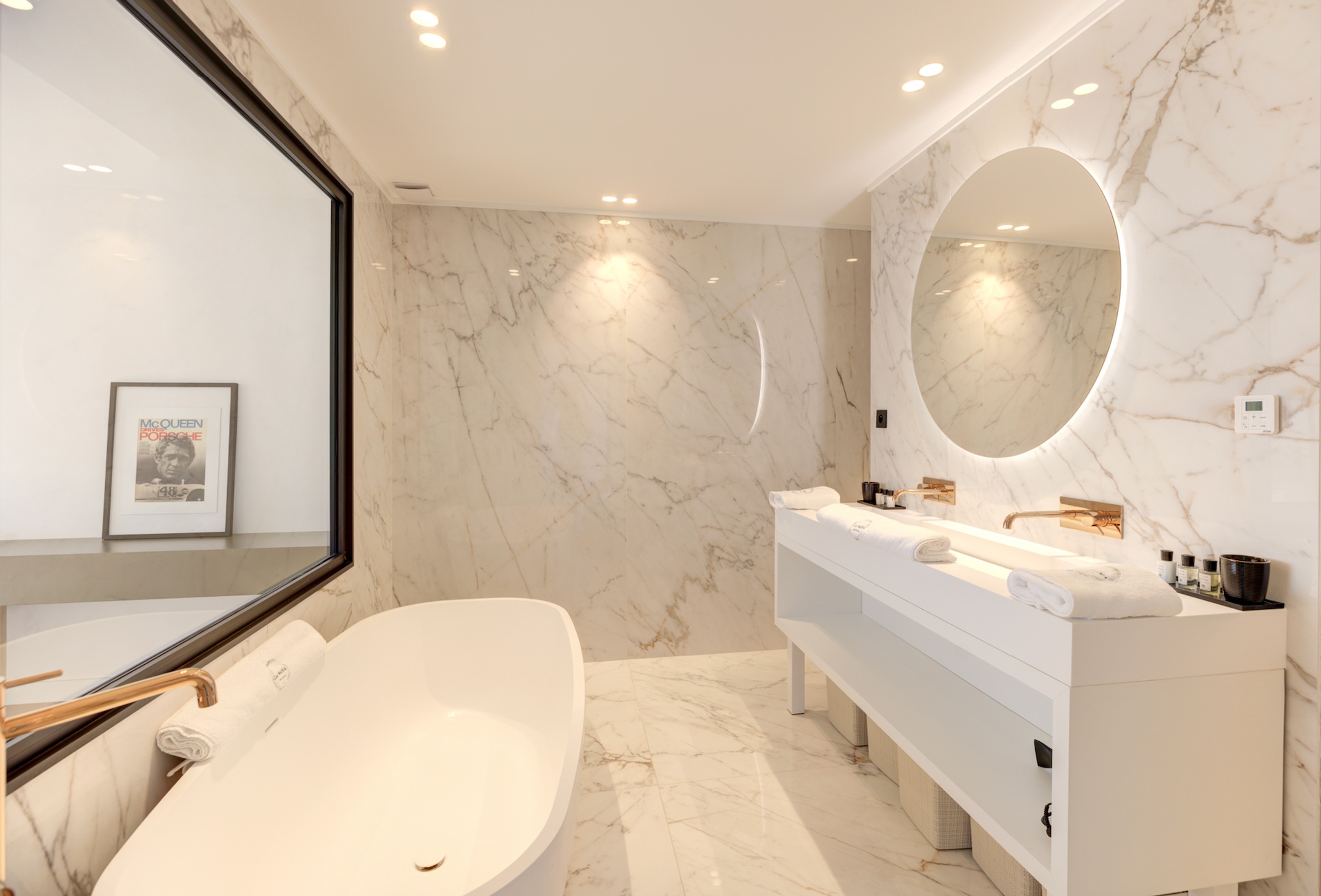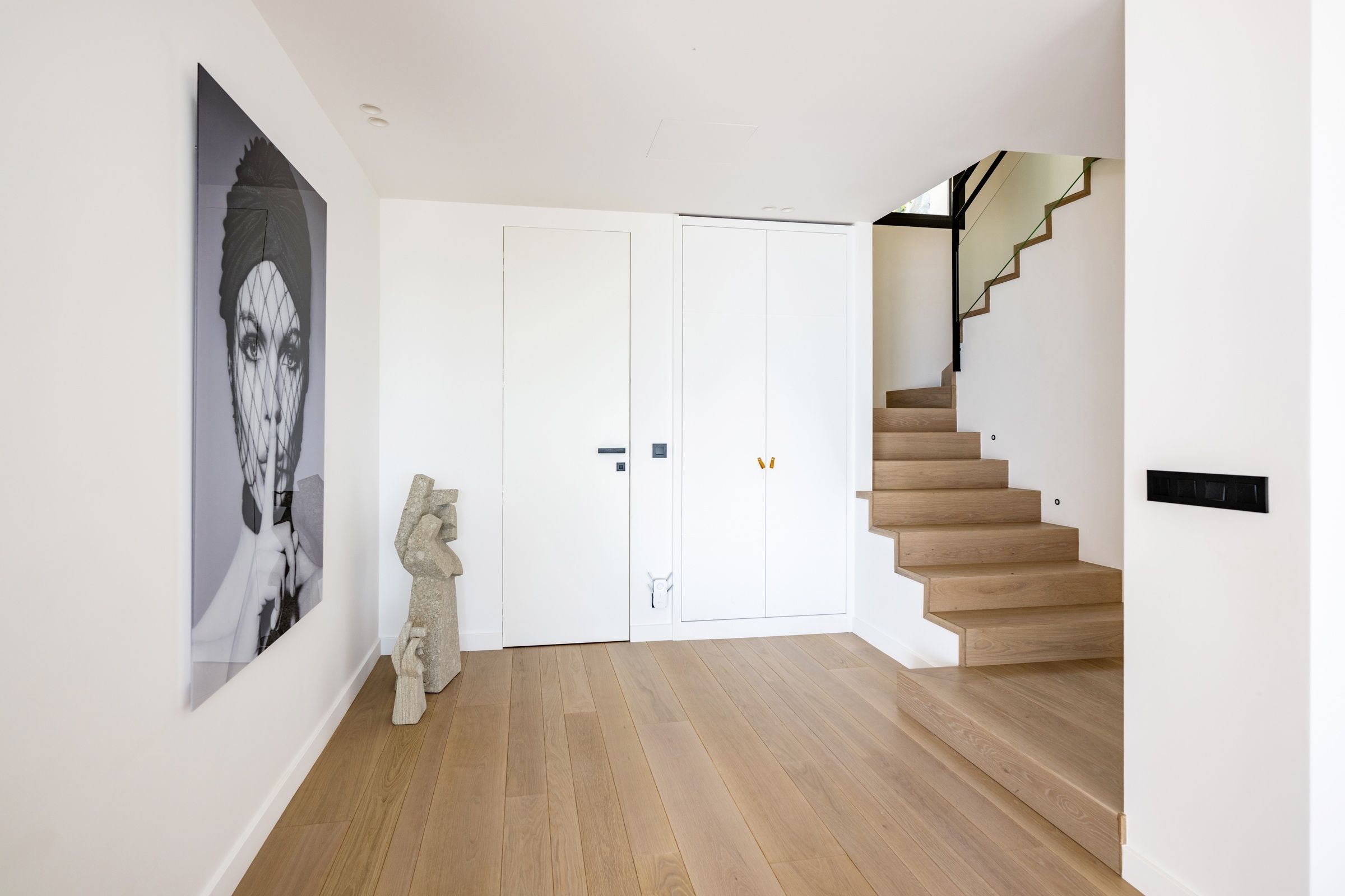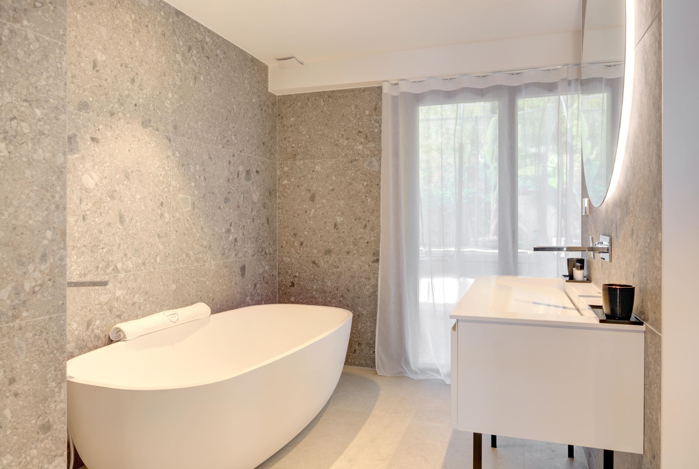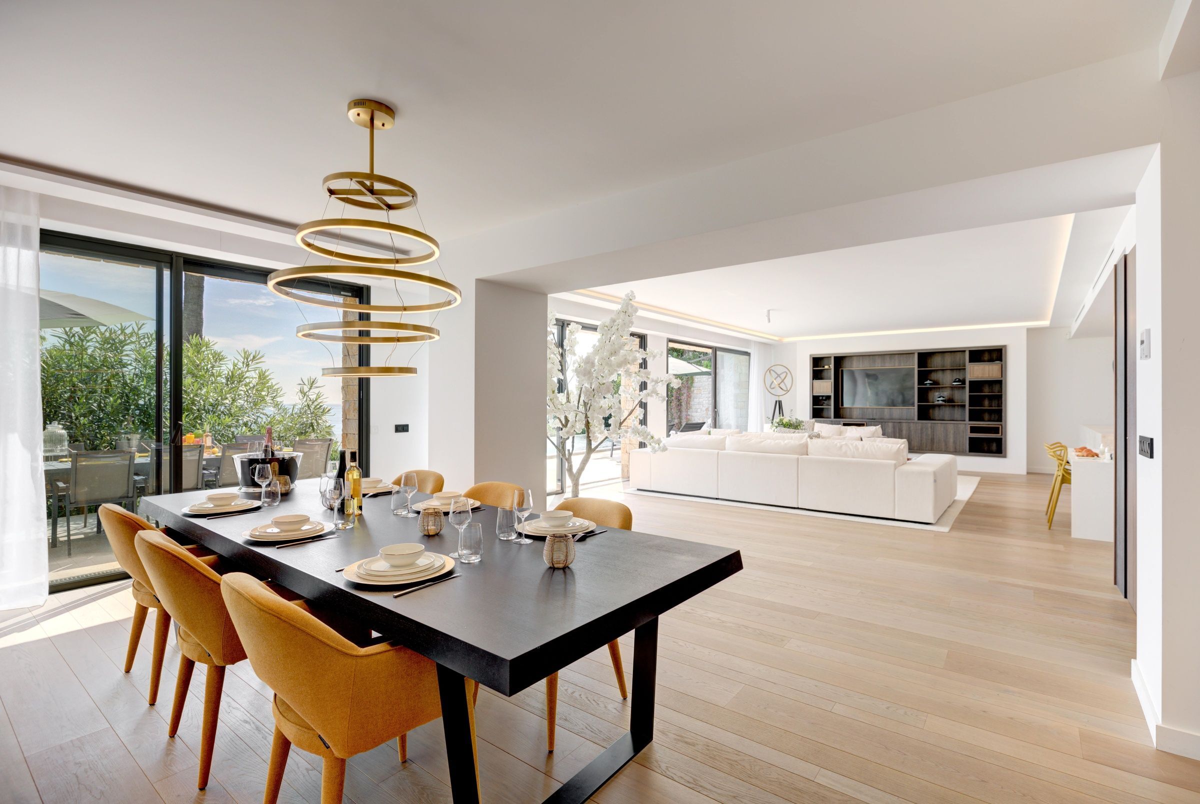 Just minutes from Cannes, the iconic city of the French Riviera, the Villa exudes sophistication. This luxurious holiday home is a marvel of modern architecture, its sleek décor and expansive windows showcasing the azure sea. The contemporary villa is nestling into a sunlit hillside, its clean white volumes contrasted by warm stonework that clads the lower level. The house steps down the slope in two stories, each floor punctuated by wide floor-to-ceiling glass panels that reflect sky and garden, and open visually onto long, sheltered terraces.