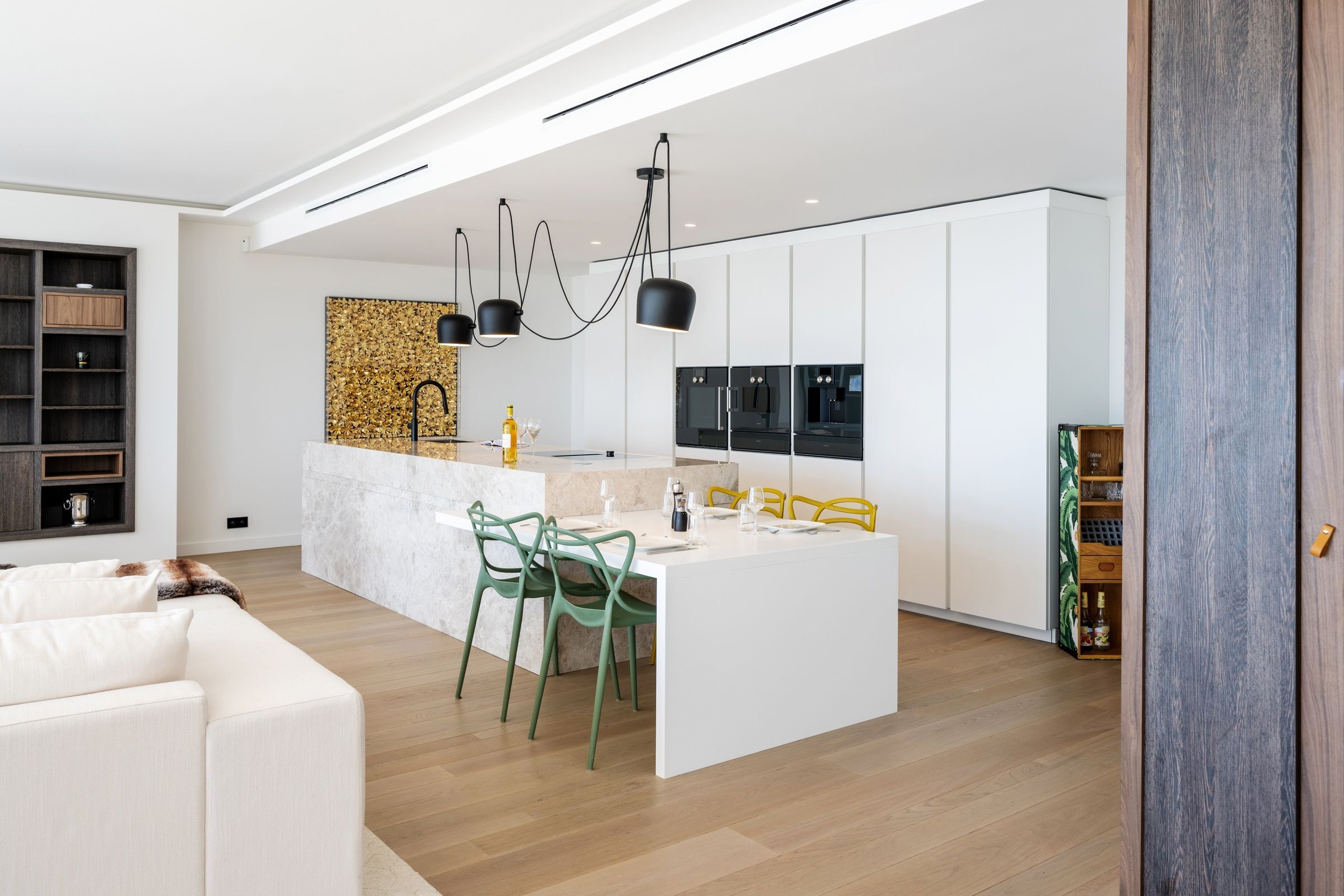 A bright and airy, open-plan living space, modernly decorated, in sleek lines, blends perfectly with an elegant kitchen and dining area. The room opens up like a breeze of light and calm. Wide, floor-to-ceiling glass sliding doors blur the boundary between inside and outside, framing an expanse of blue sea. The overall effect is airy and refined, a seaside living space that feels both relaxed and deliberately calm.