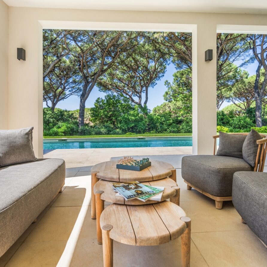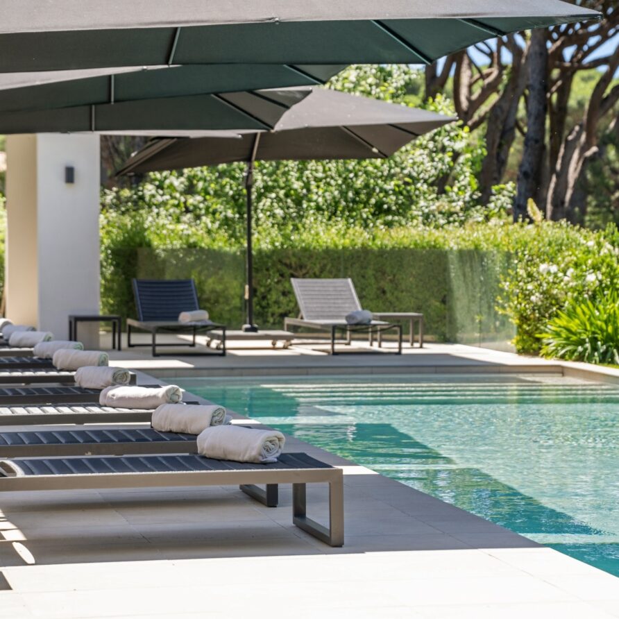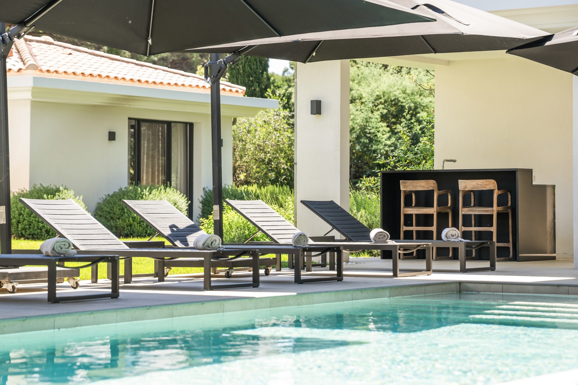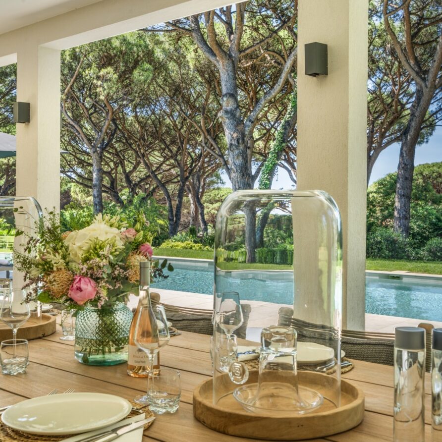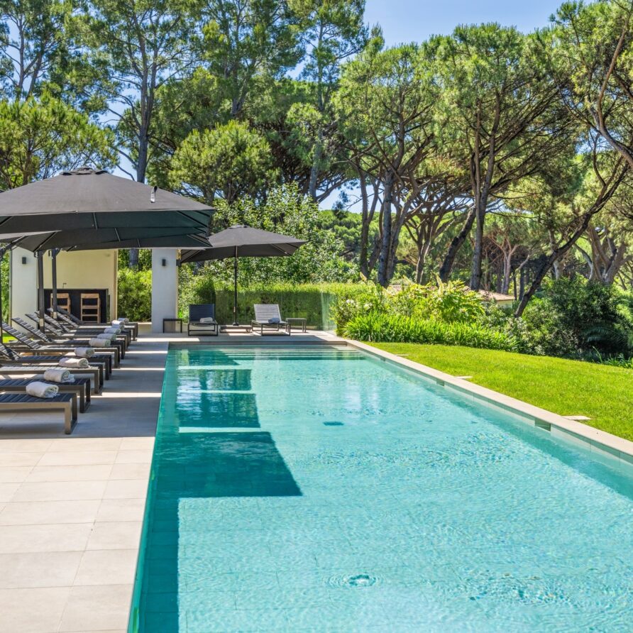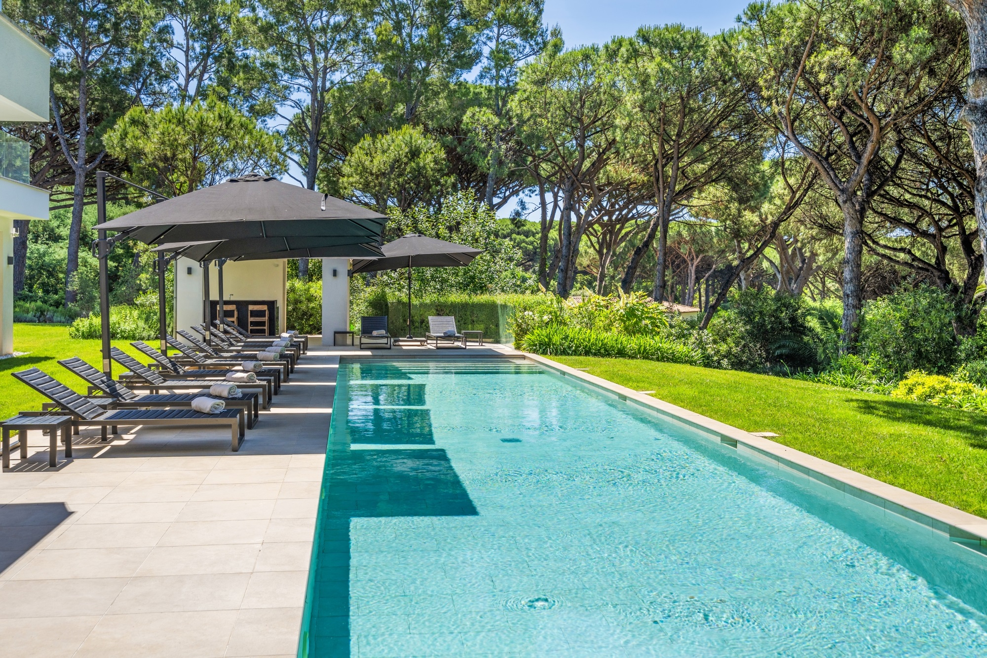 Outside, the eye drifts from the wide sliding doors to generous armchairs, beautifully set tables under pergolas, and beyond, the straight, inviting azure-blue pool. The soft shade of the pines meets the warmth of pale stone. The pool house, with its summer kitchen, calls for long al fresco lunches or casual refreshments, just steps from the water.