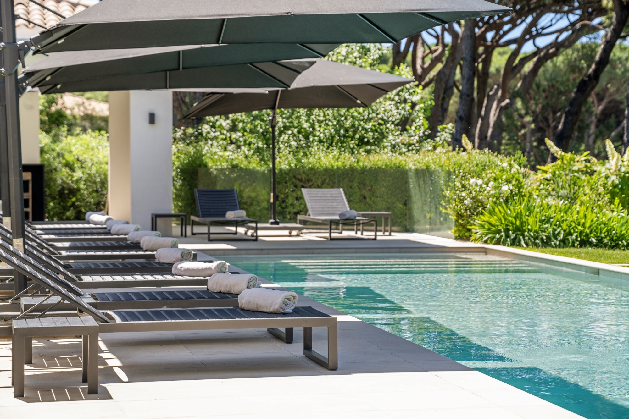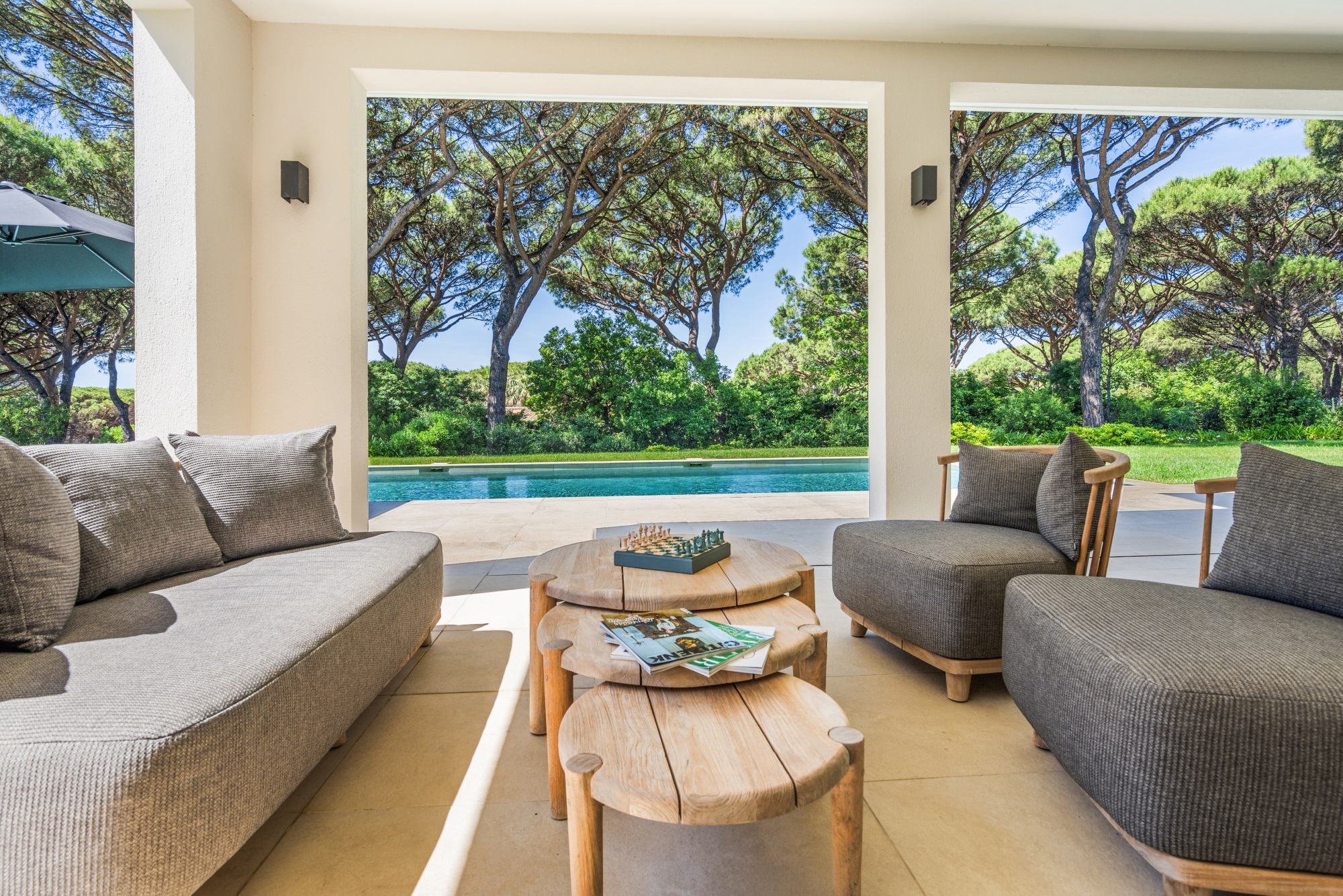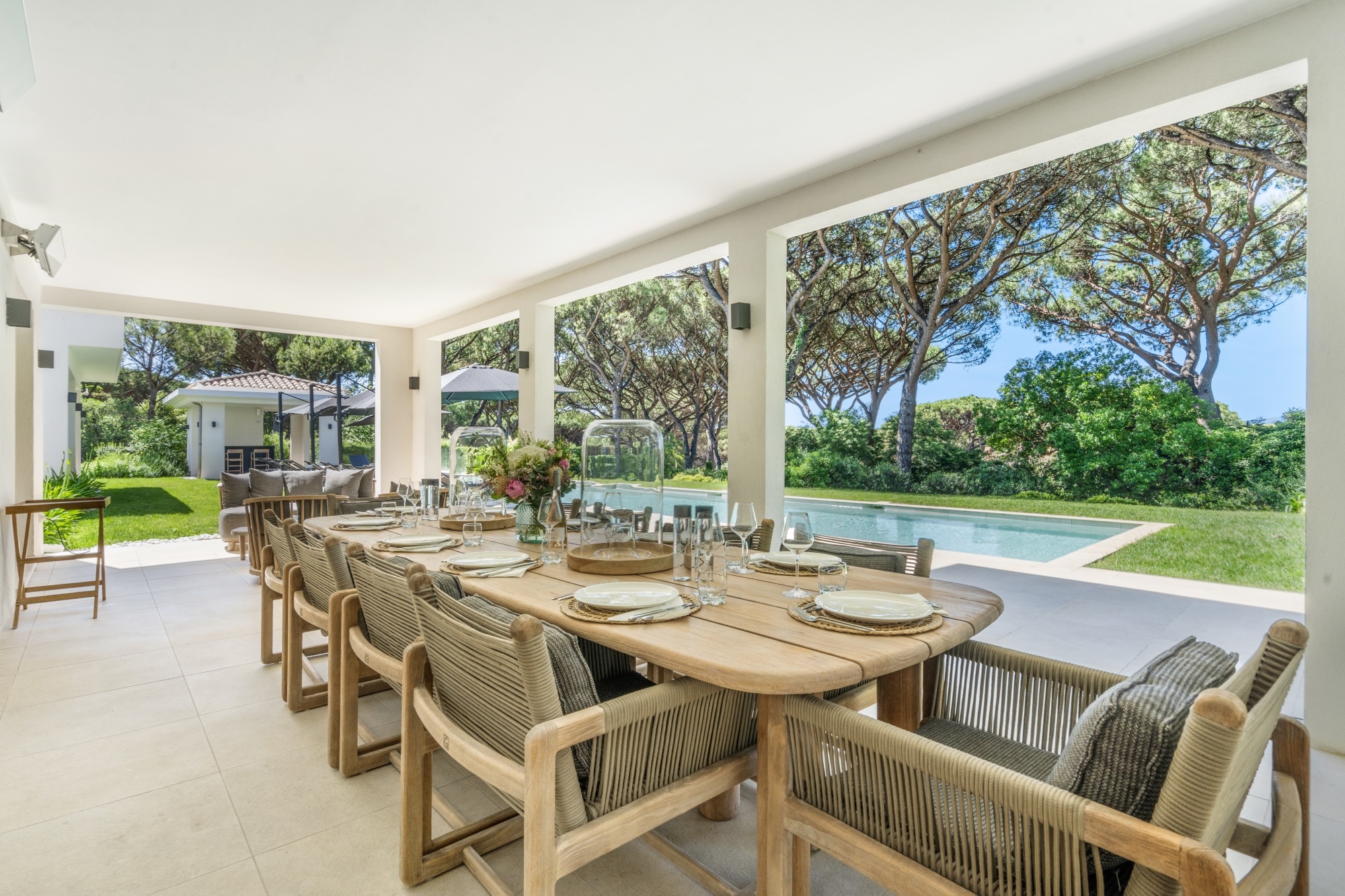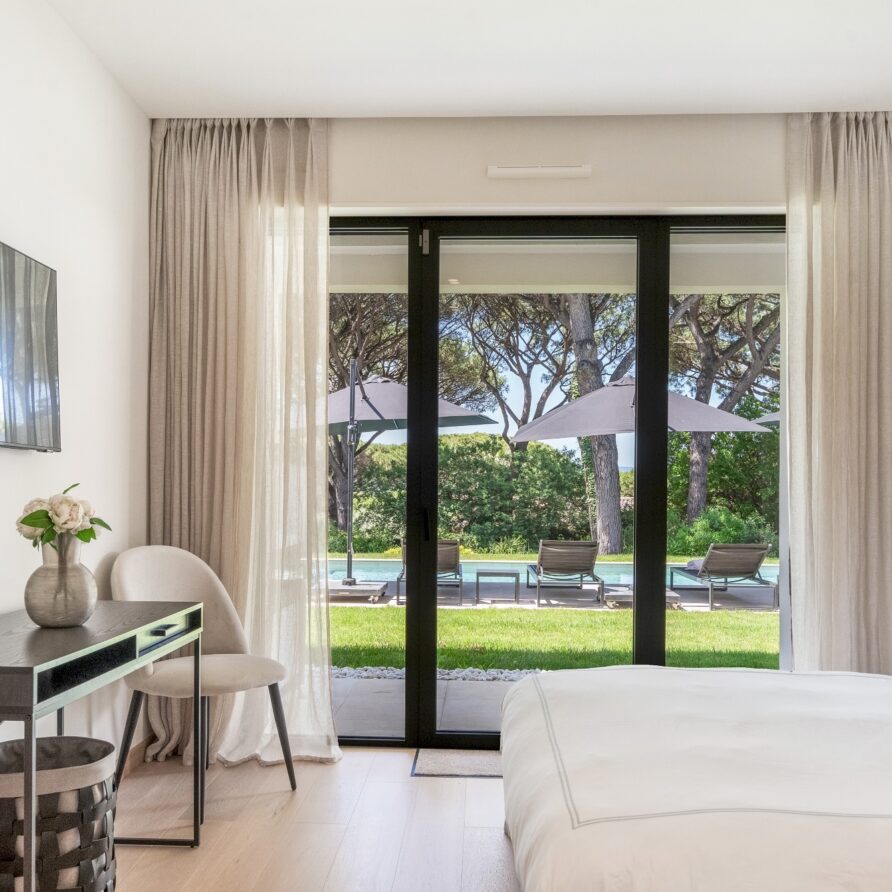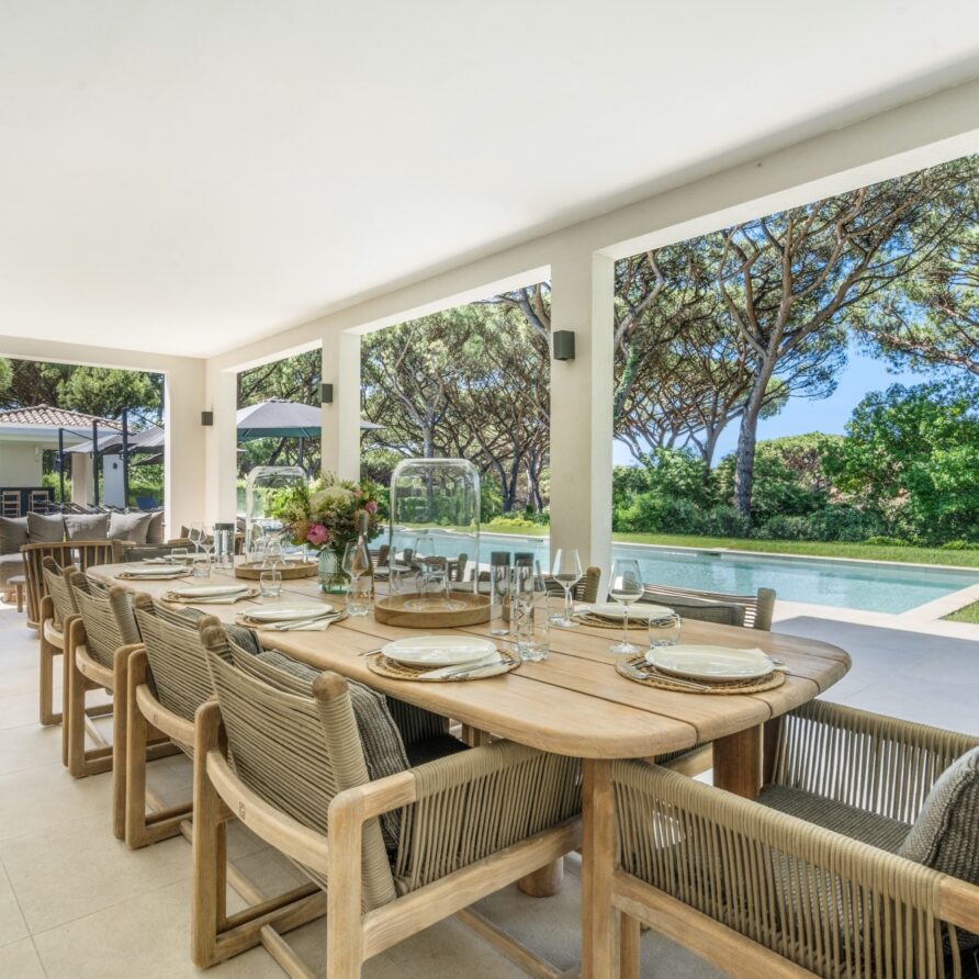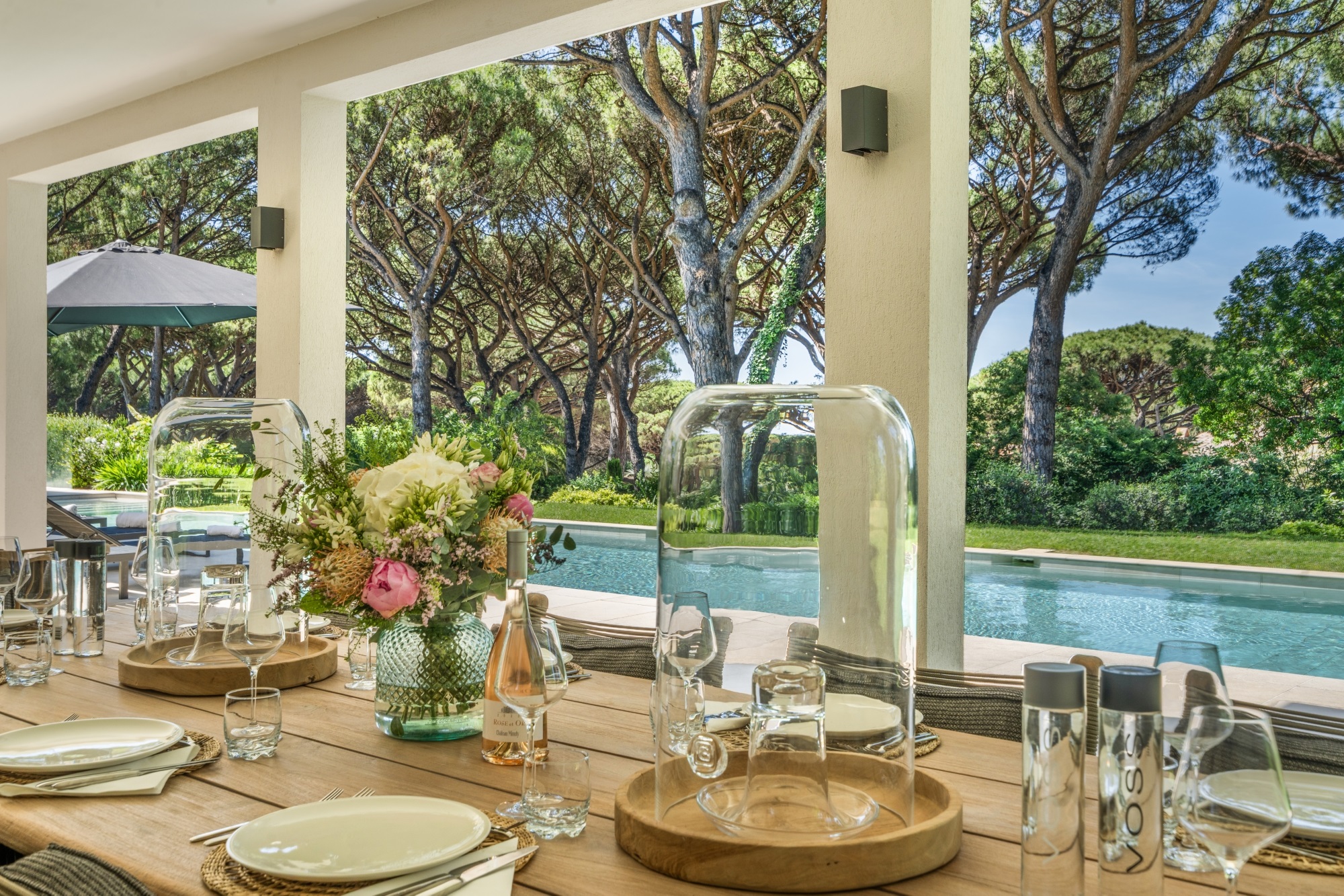 Outside, the eye drifts from the wide sliding doors to generous armchairs, beautifully set tables under pergolas, and beyond, the straight, inviting azure-blue pool. The soft shade of the pines meets the warmth of pale stone. The pool house, with its summer kitchen, calls for long al fresco lunches or casual refreshments, just steps from the water.