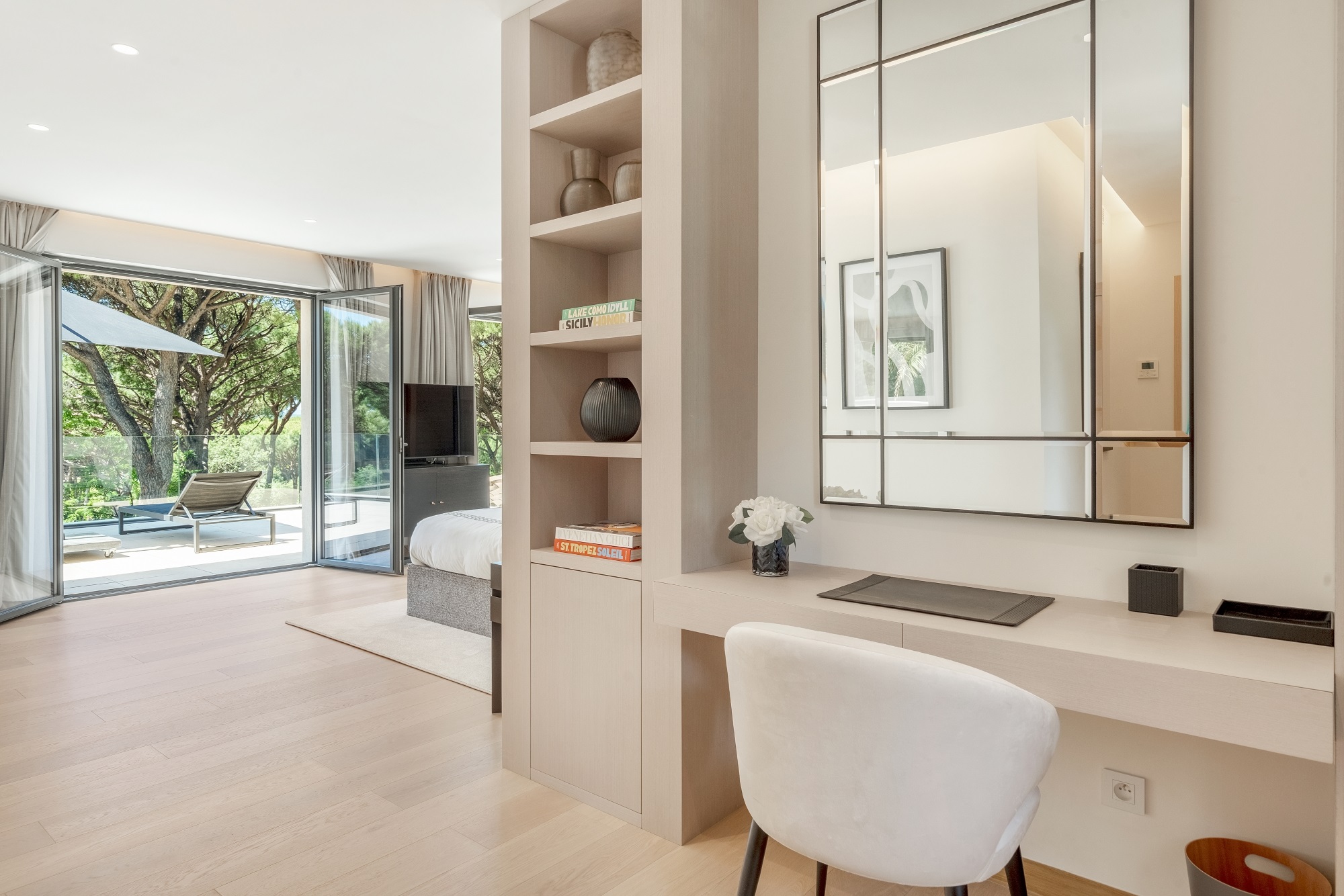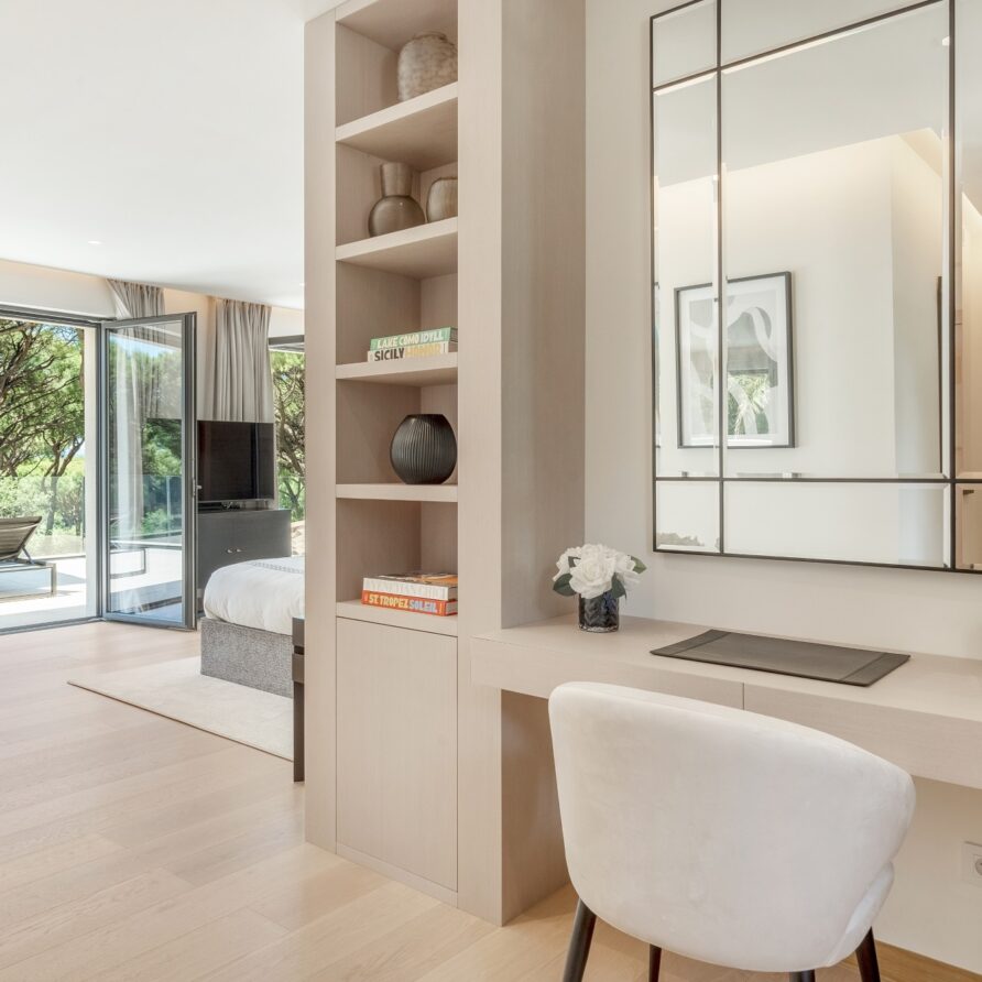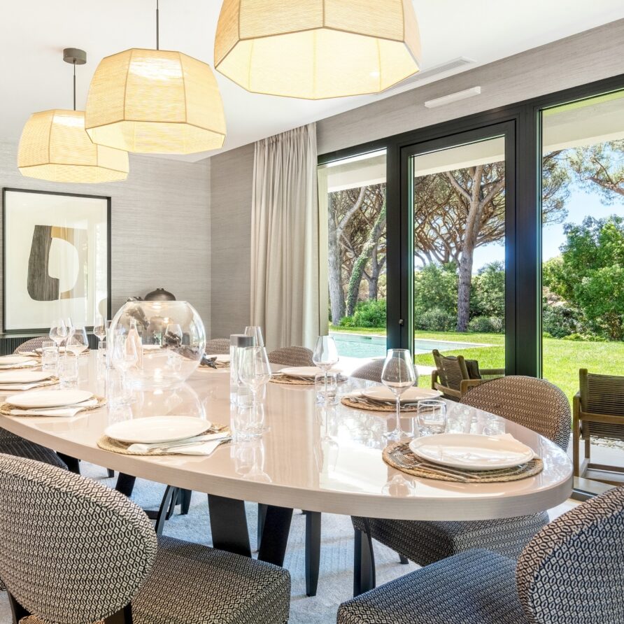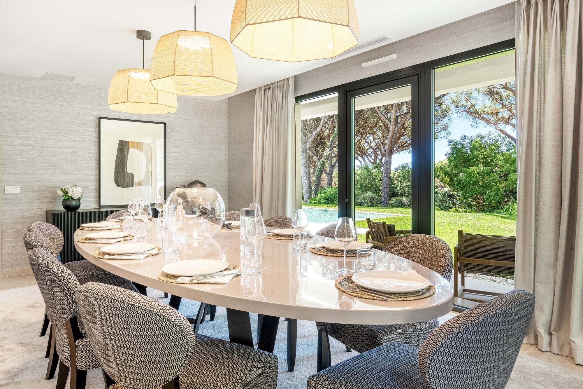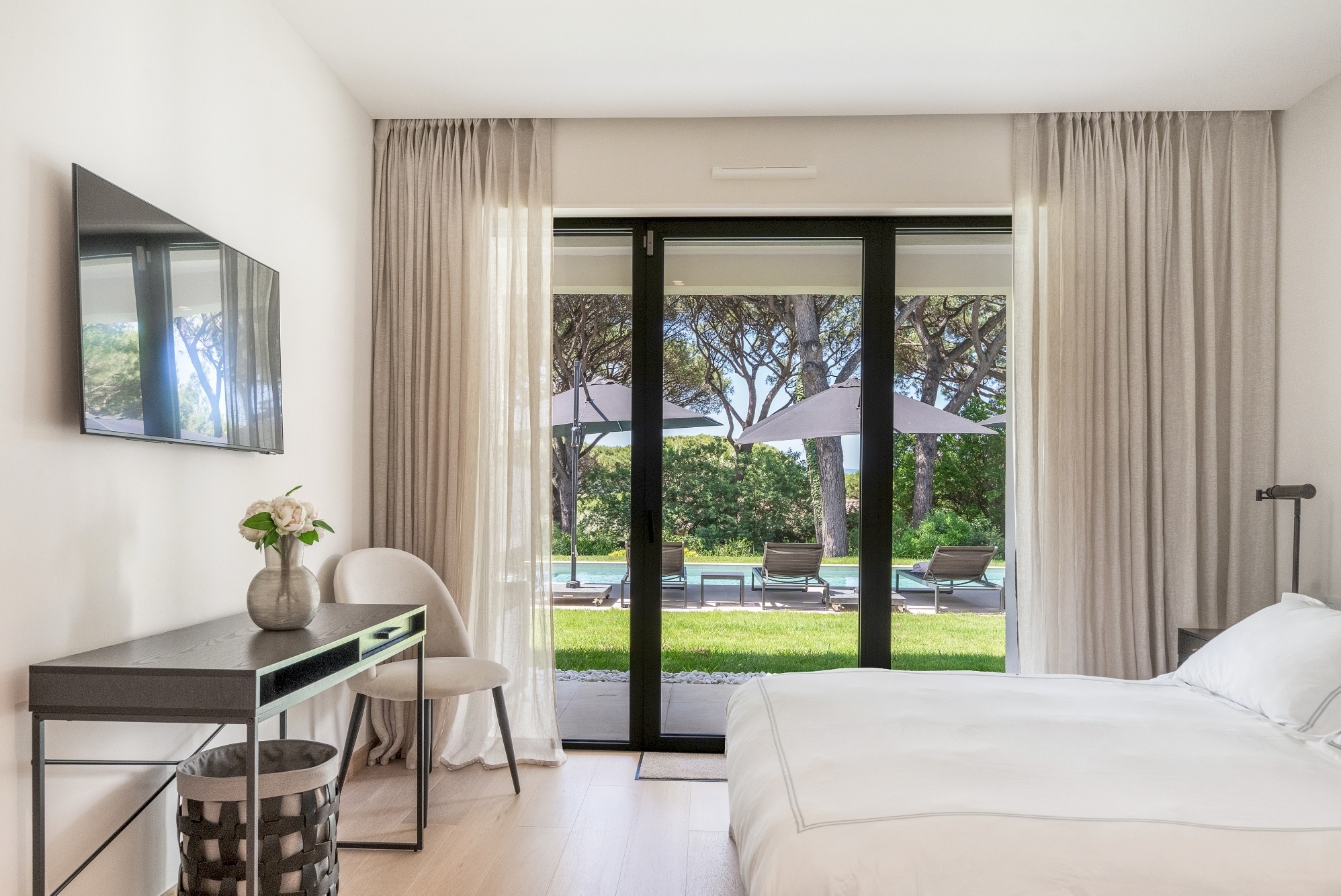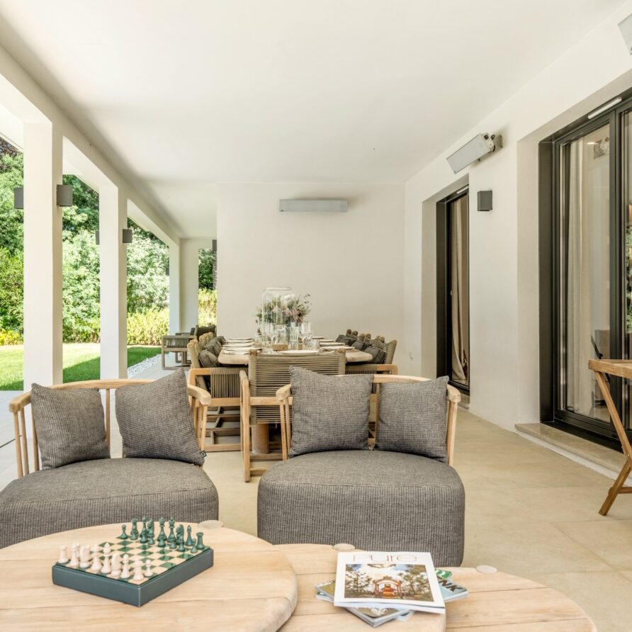 Outside, the eye drifts from the wide sliding doors to generous armchairs, beautifully set tables under pergolas, and beyond, the straight, inviting azure-blue pool. The soft shade of the pines meets the warmth of pale stone. The pool house, with its summer kitchen, calls for long al fresco lunches or casual refreshments, just steps from the water.