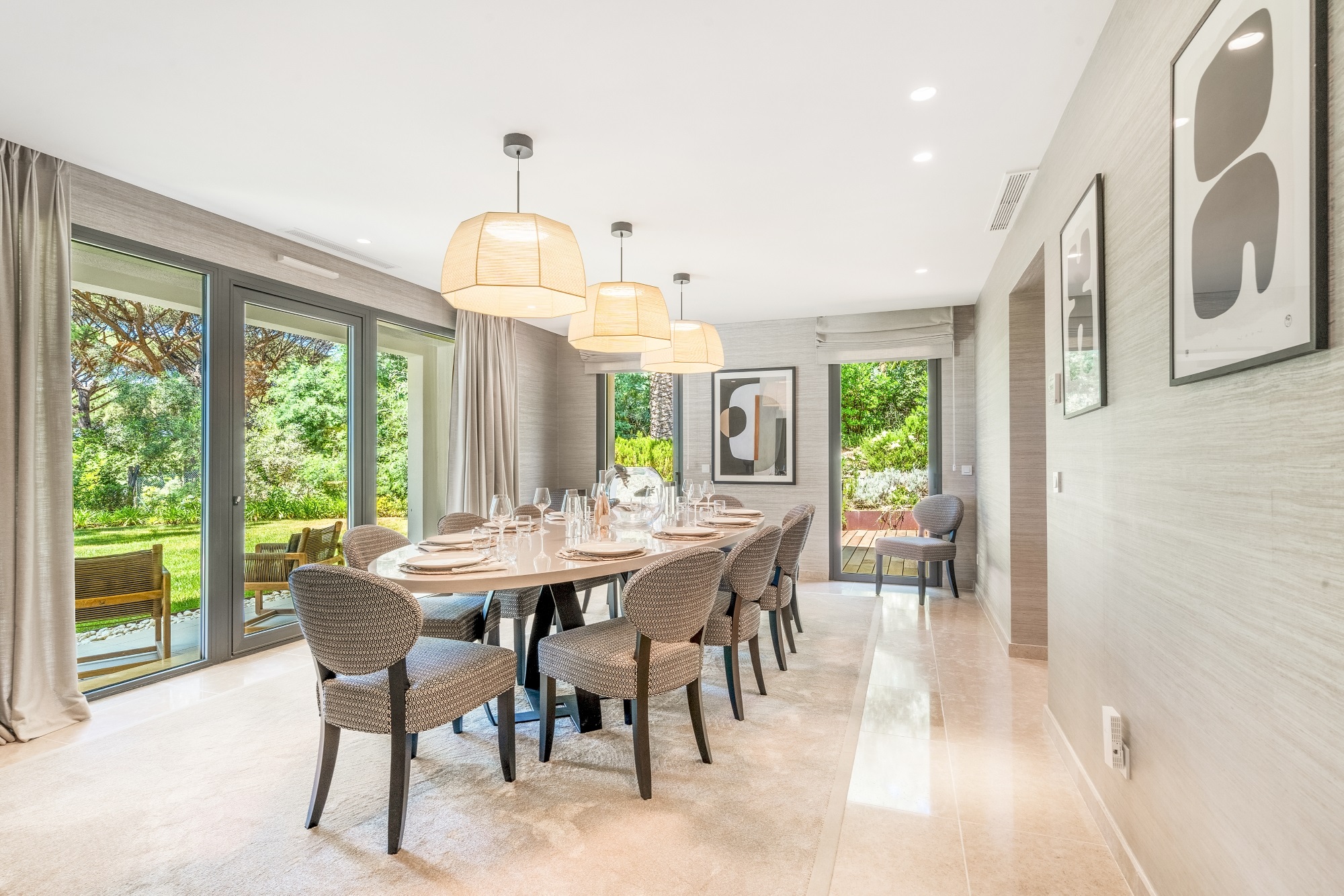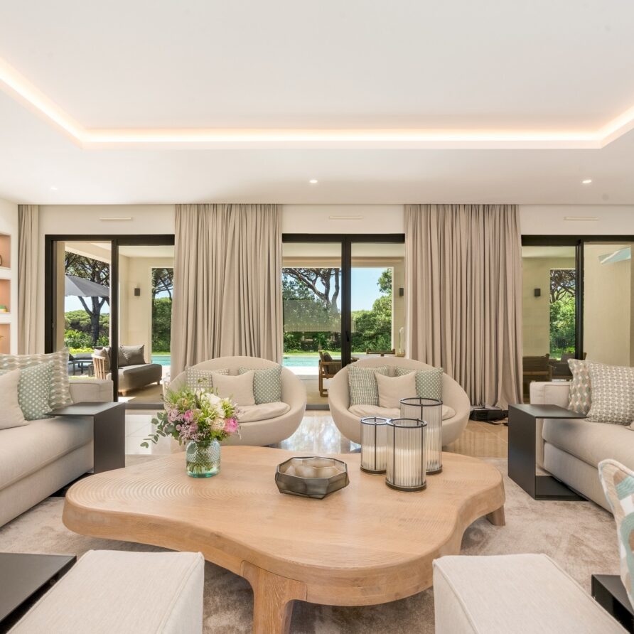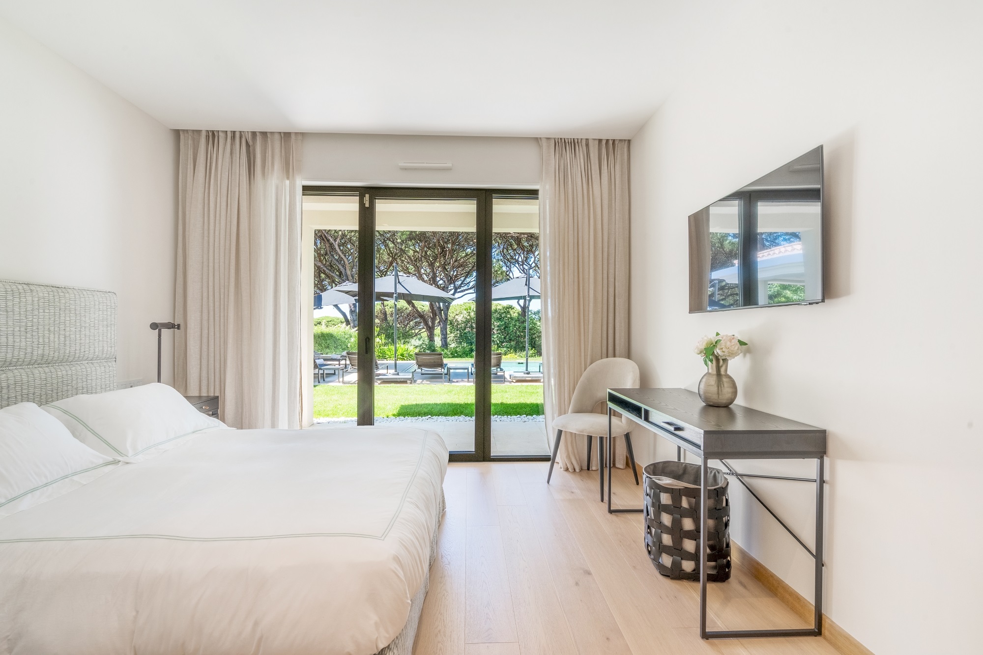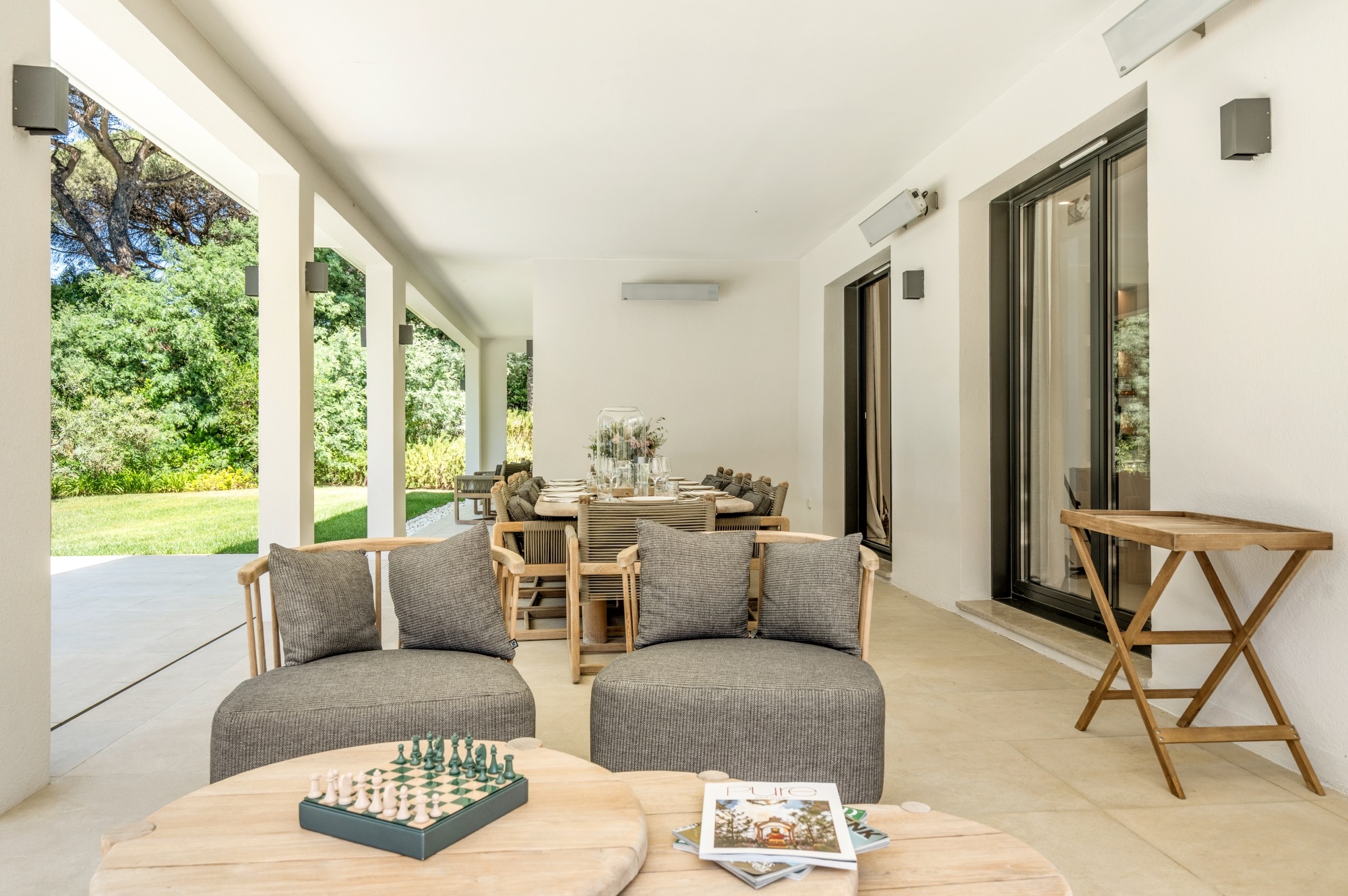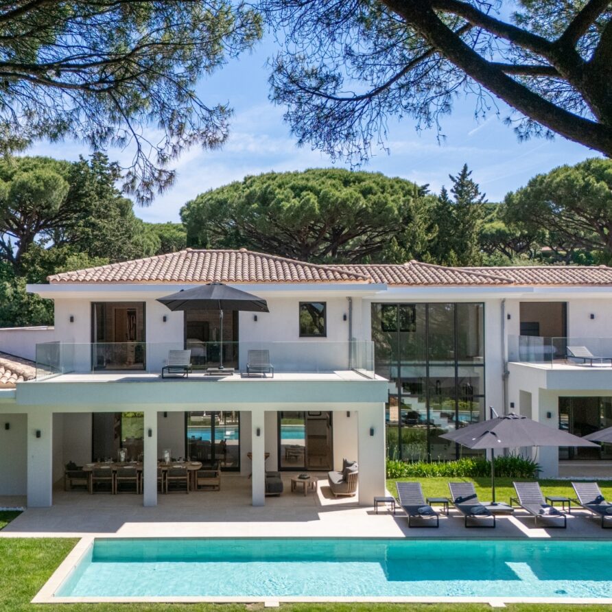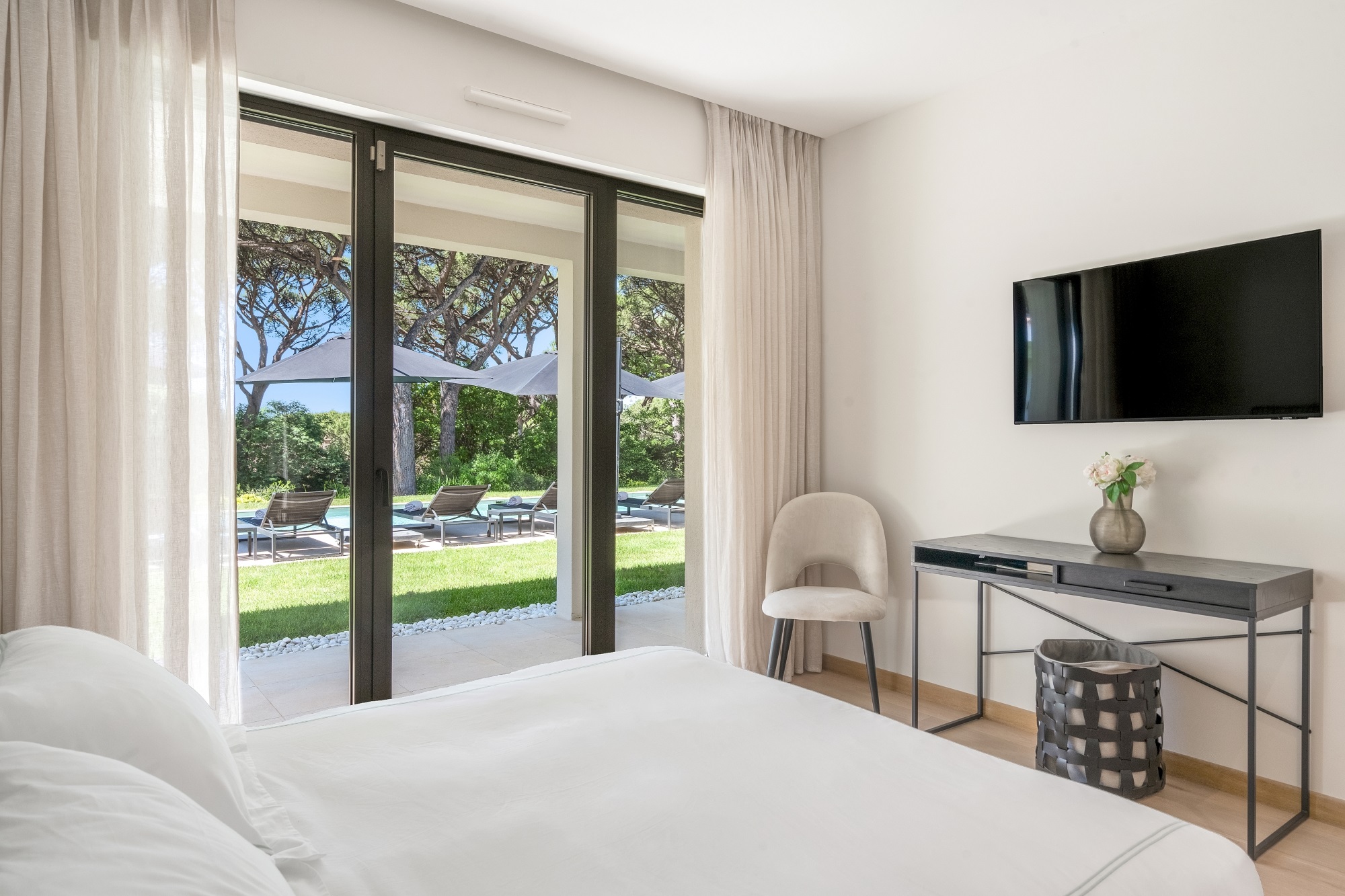Outside, the eye drifts from the wide sliding doors to generous armchairs, beautifully set tables under pergolas, and beyond, the straight, inviting azure-blue pool. The soft shade of the pines meets the warmth of pale stone. The pool house, with its summer kitchen, calls for long al fresco lunches or casual refreshments, just steps from the water.