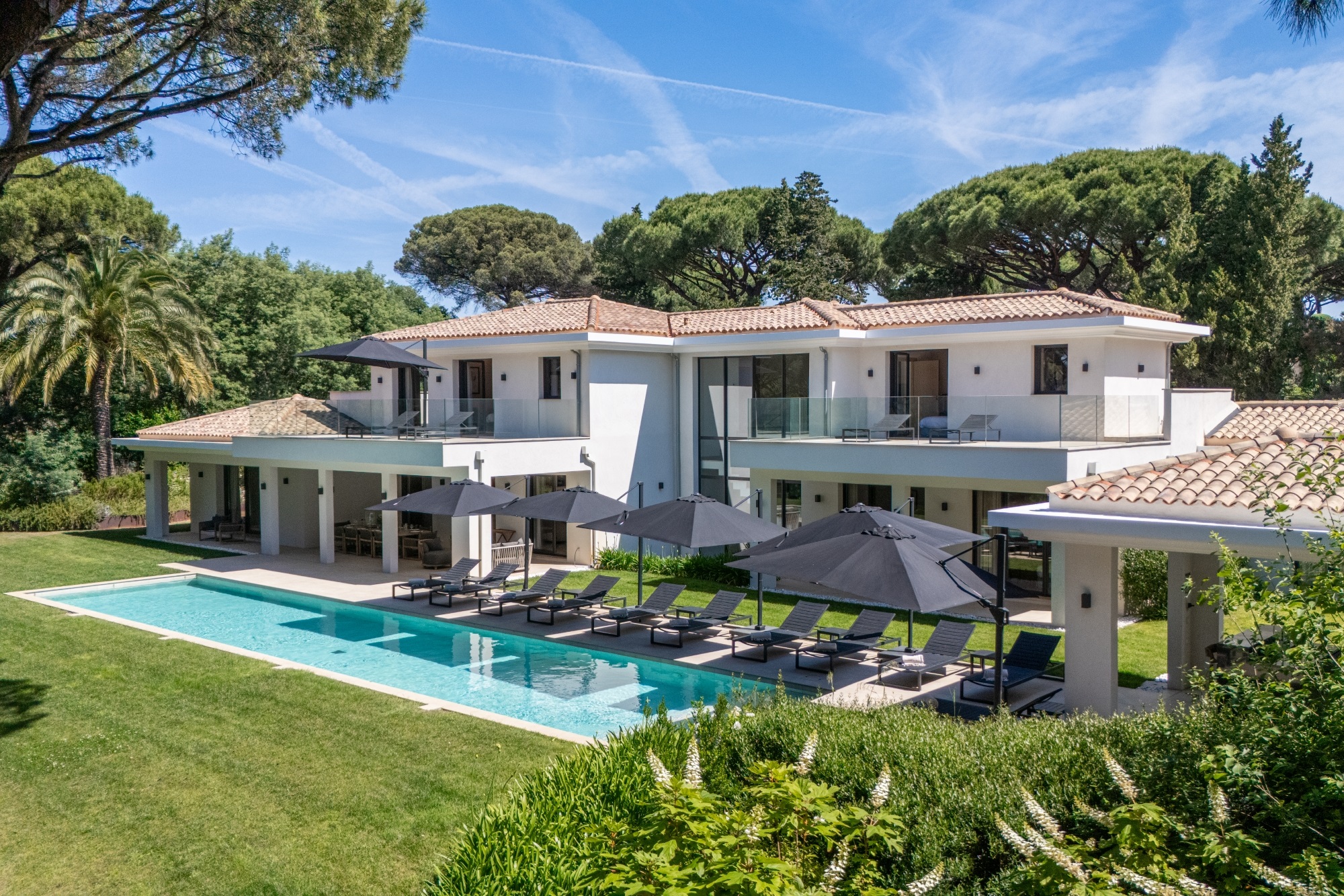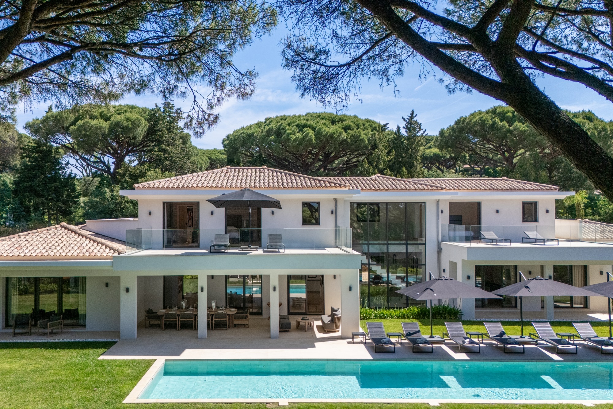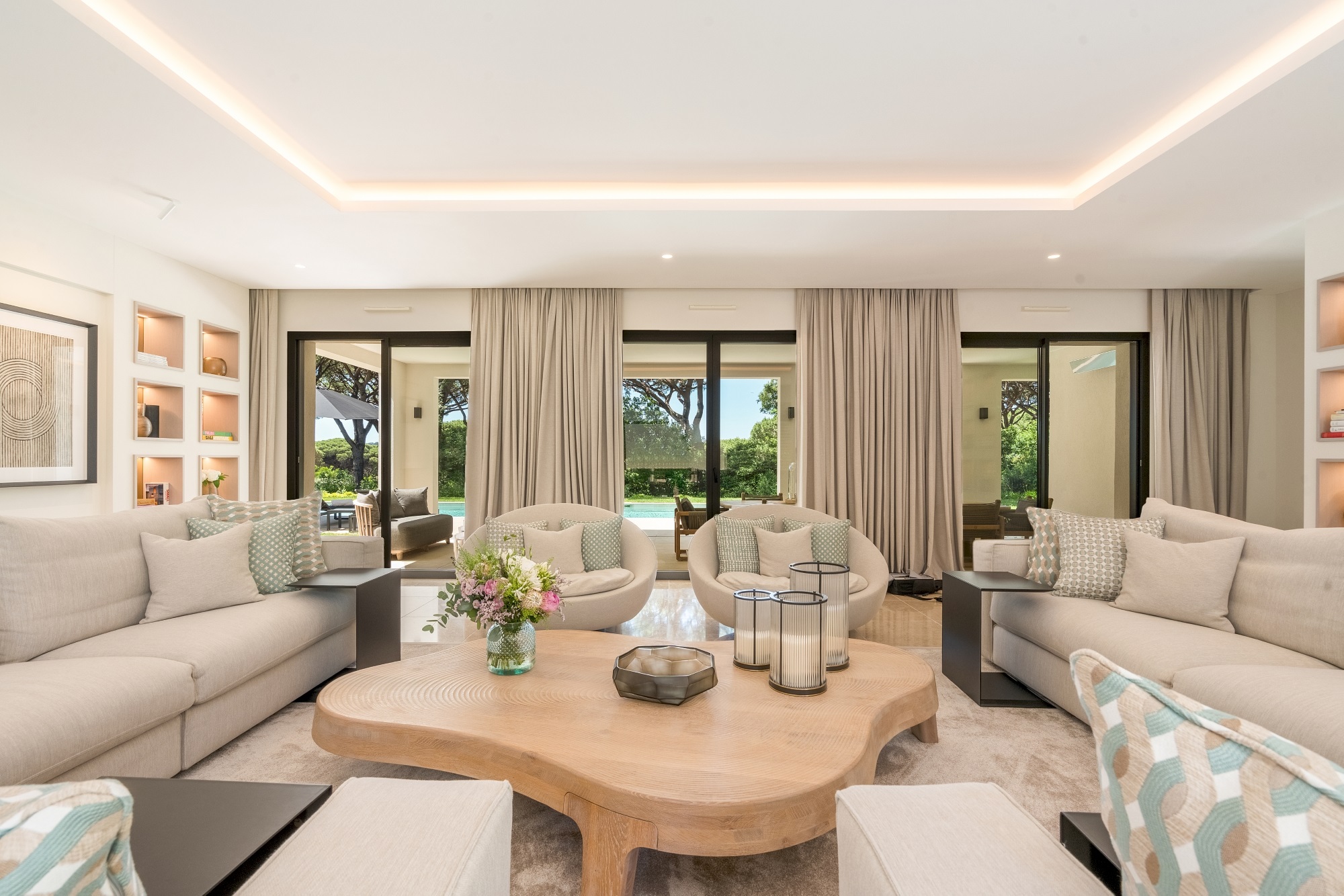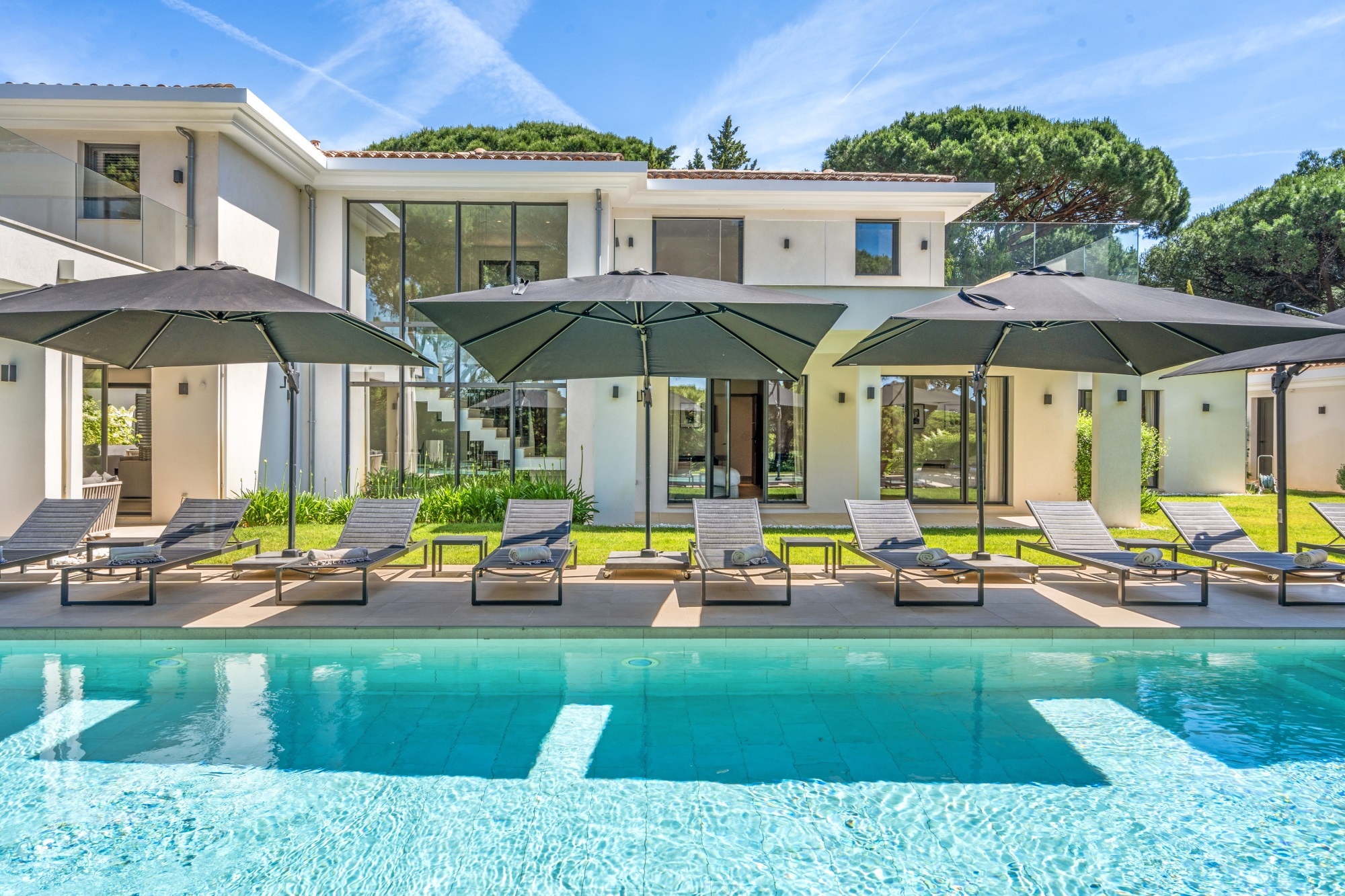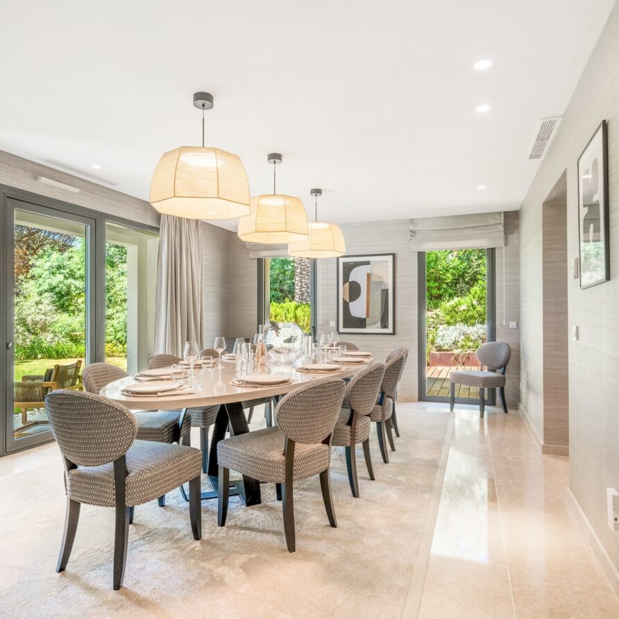 Outside, the eye drifts from the wide sliding doors to generous armchairs, beautifully set tables under pergolas, and beyond, the straight, inviting azure-blue pool. The soft shade of the pines meets the warmth of pale stone. The pool house, with its summer kitchen, calls for long al fresco lunches or casual refreshments, just steps from the water.