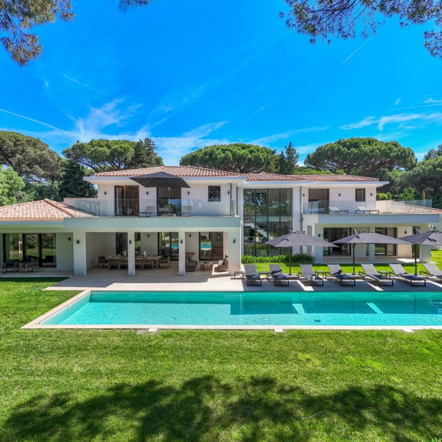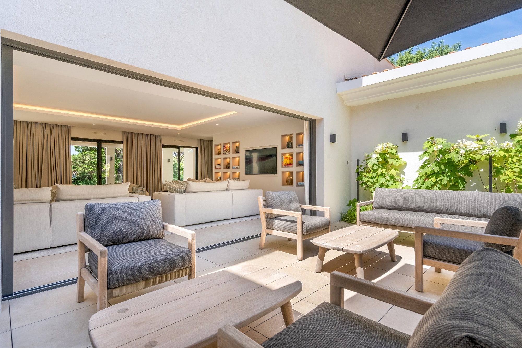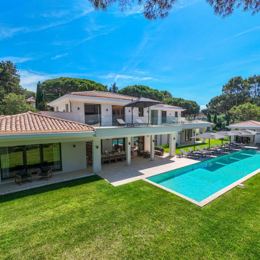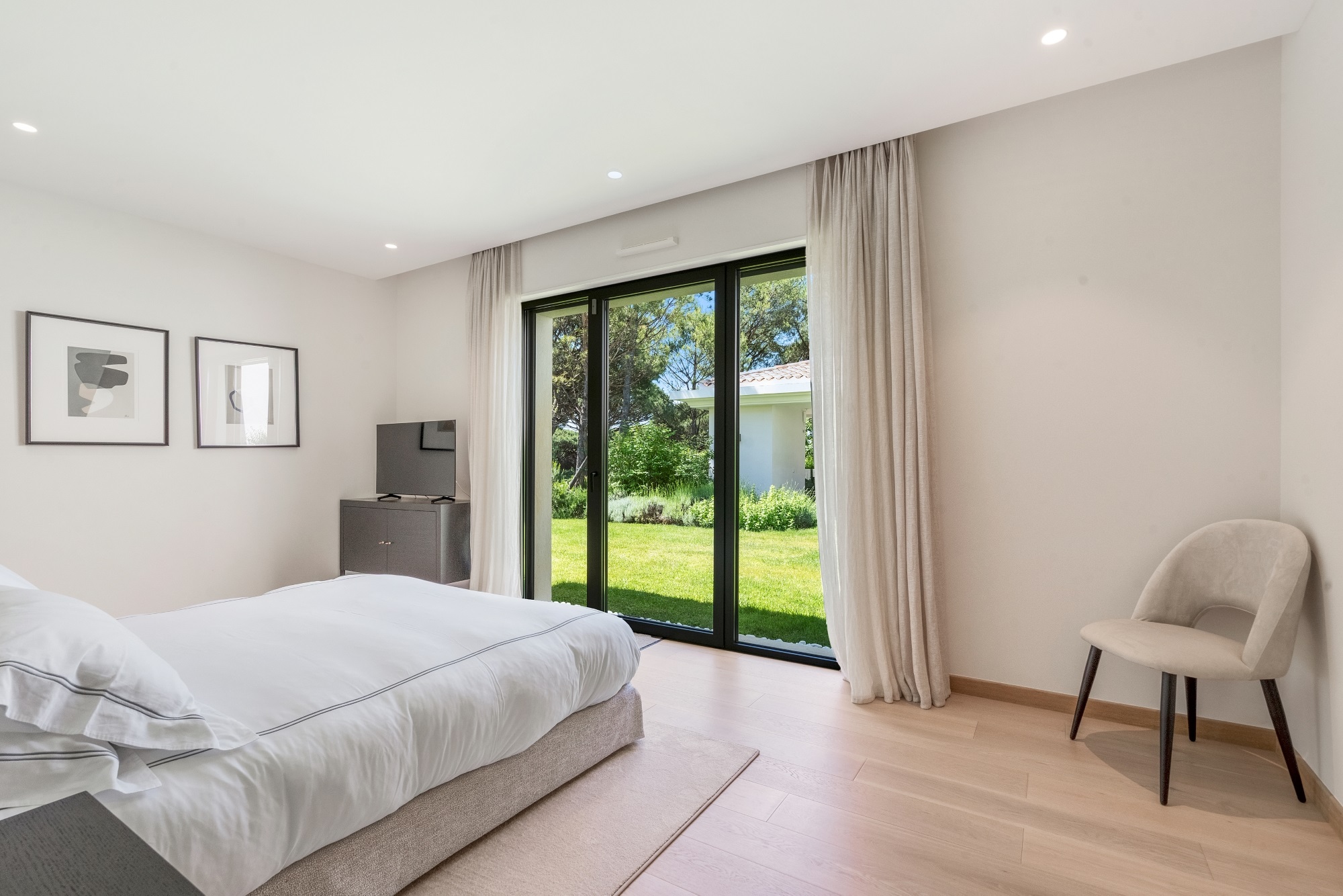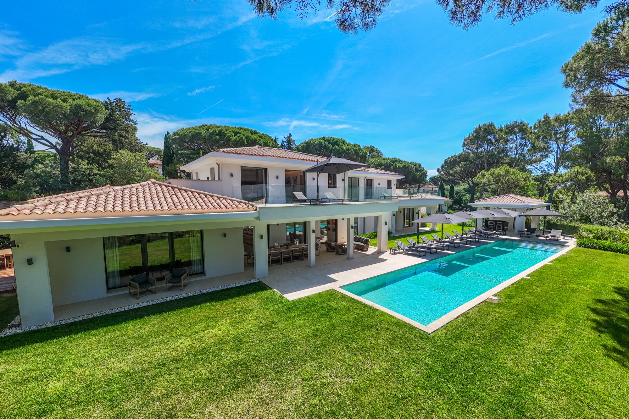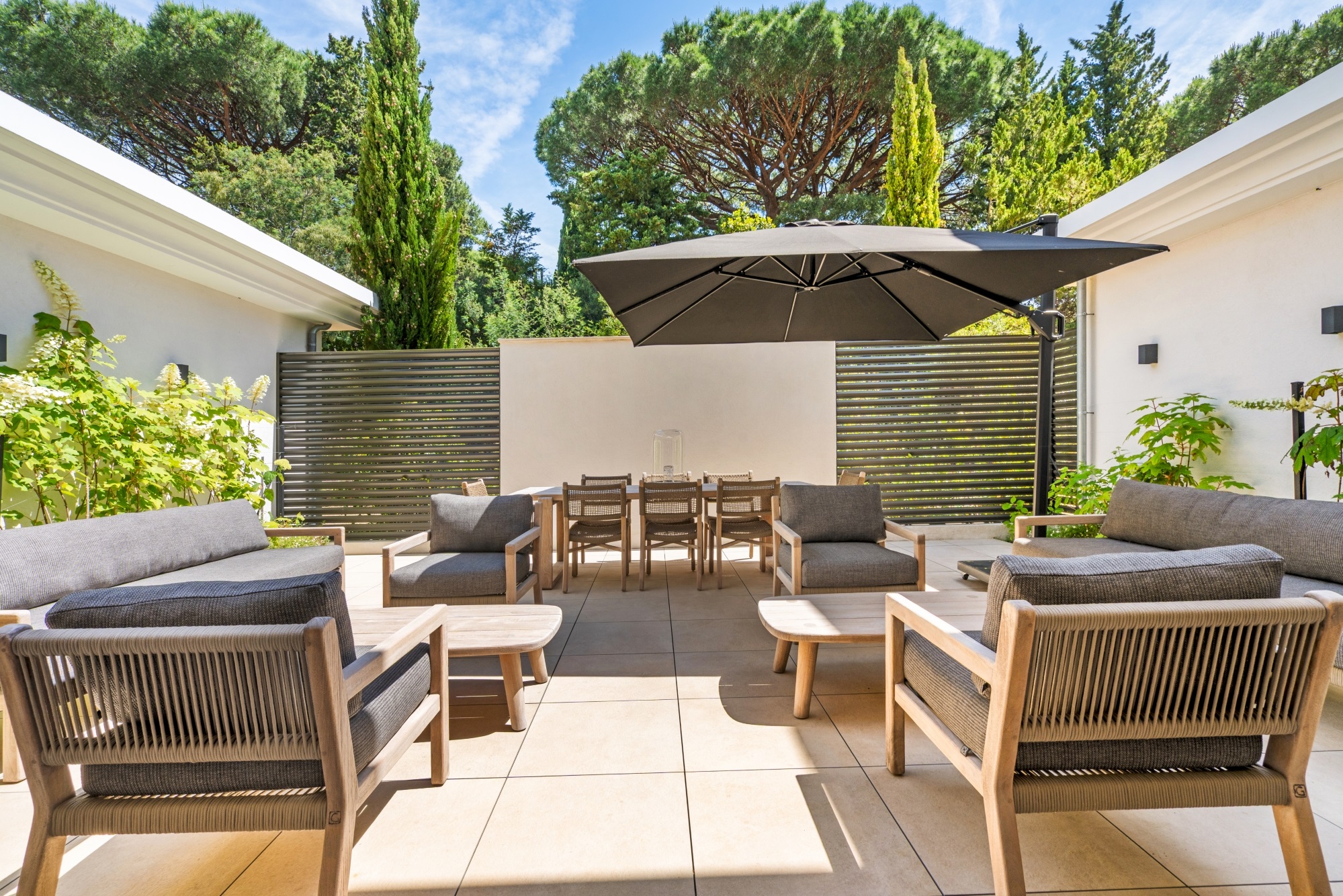 Outside, the eye drifts from the wide sliding doors to generous armchairs, beautifully set tables under pergolas, and beyond, the straight, inviting azure-blue pool. The soft shade of the pines meets the warmth of pale stone. The pool house, with its summer kitchen, calls for long al fresco lunches or casual refreshments, just steps from the water.