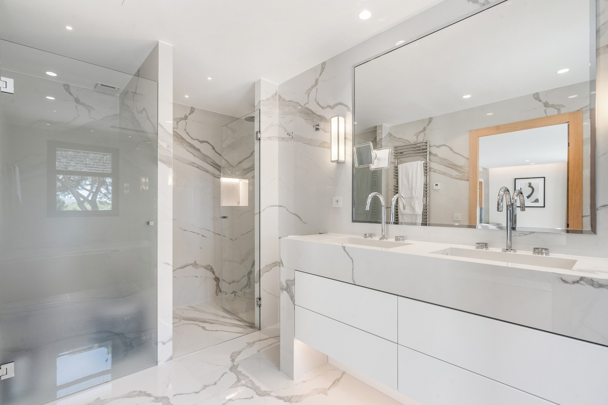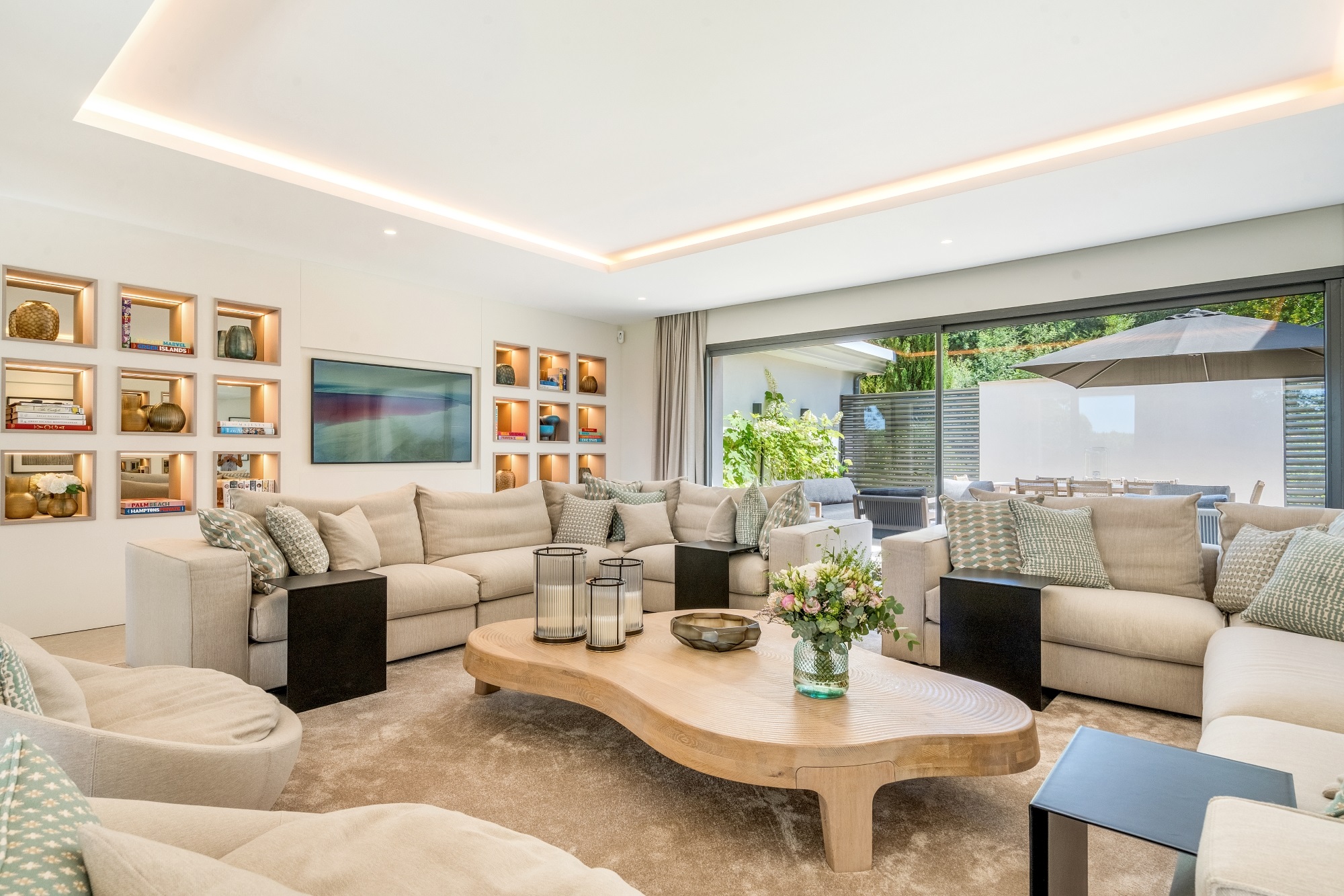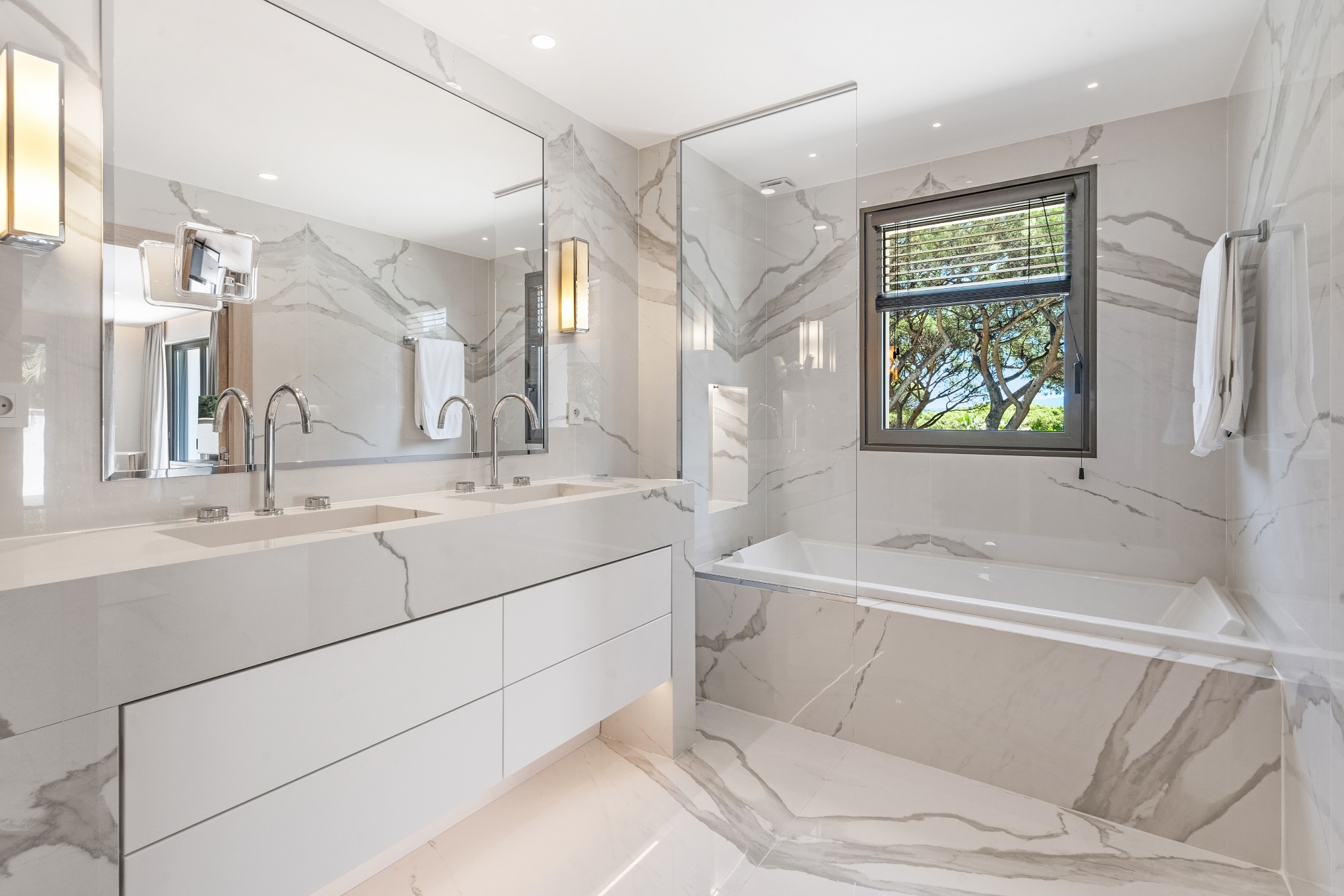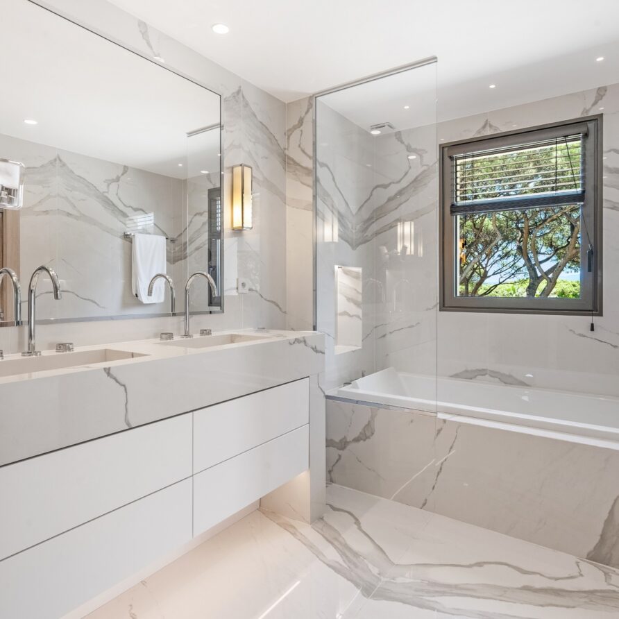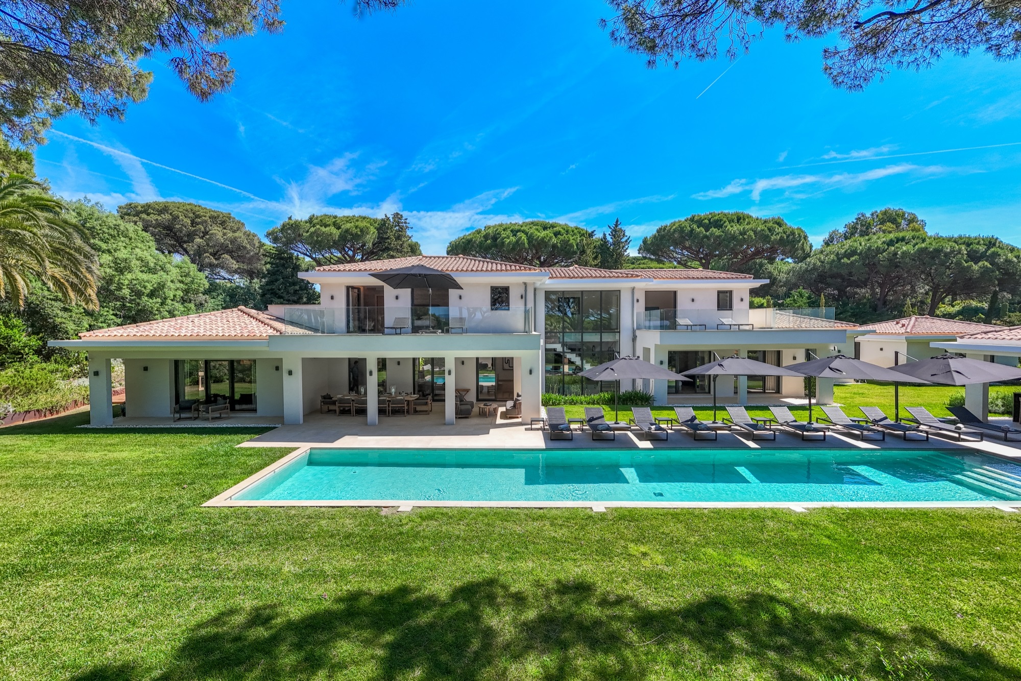 Outside, the eye drifts from the wide sliding doors to generous armchairs, beautifully set tables under pergolas, and beyond, the straight, inviting azure-blue pool. The soft shade of the pines meets the warmth of pale stone. The pool house, with its summer kitchen, calls for long al fresco lunches or casual refreshments, just steps from the water.