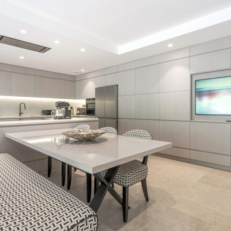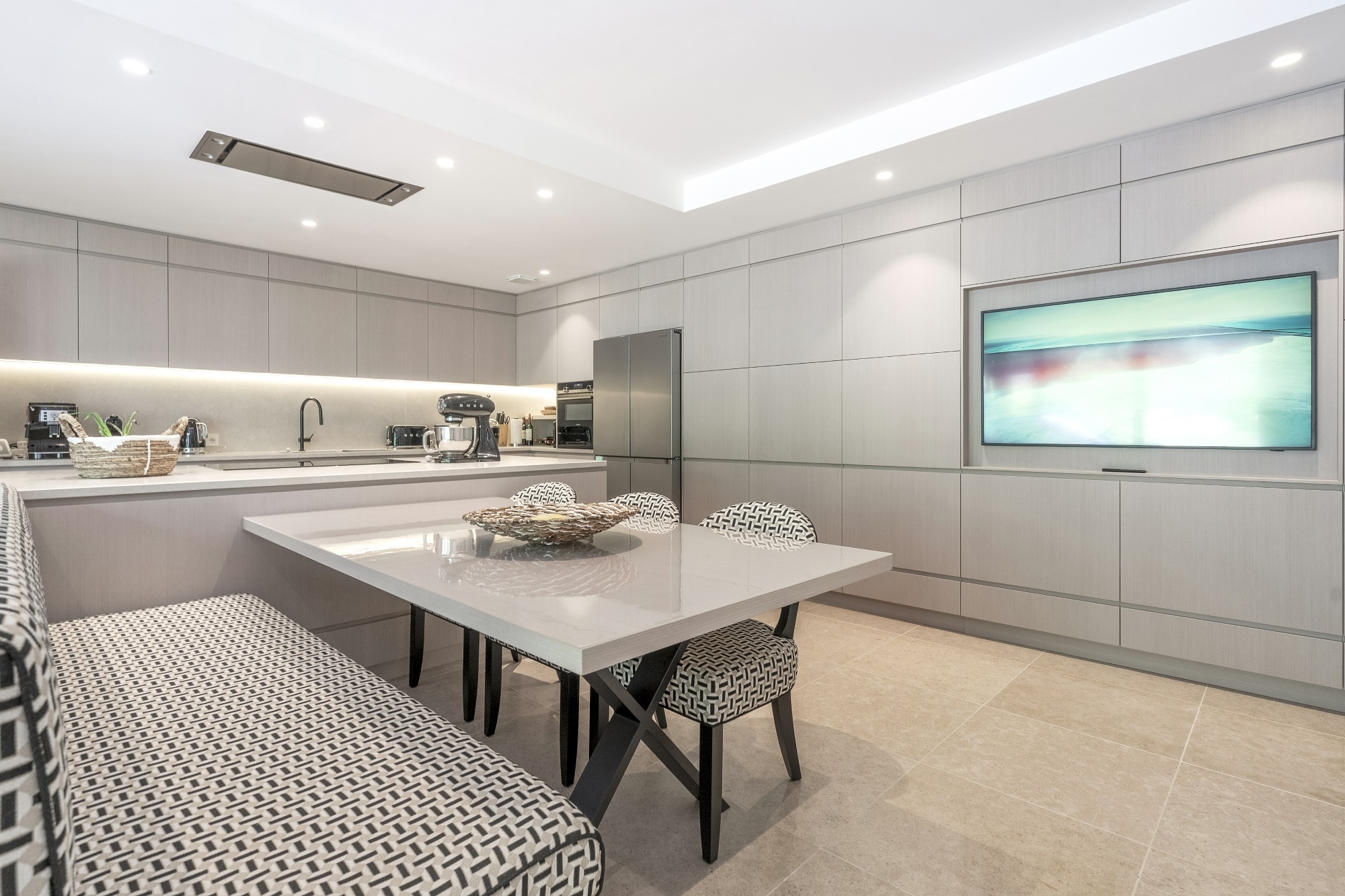The living room, spacious and calm, offers a natural transition to the shared spaces. In the kitchen, a large table allows you to watch the chef in his element, to taste, to learn, or simply to enjoy. It is a space that feels both intimate and alive, encouraging connection and shared moments, whether with family or friends.