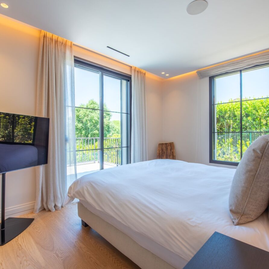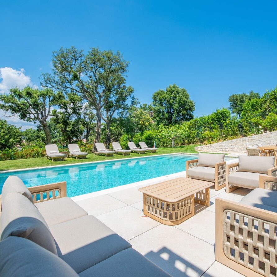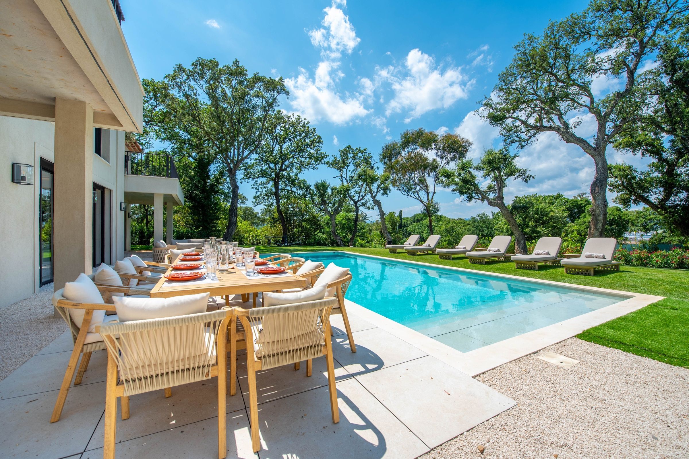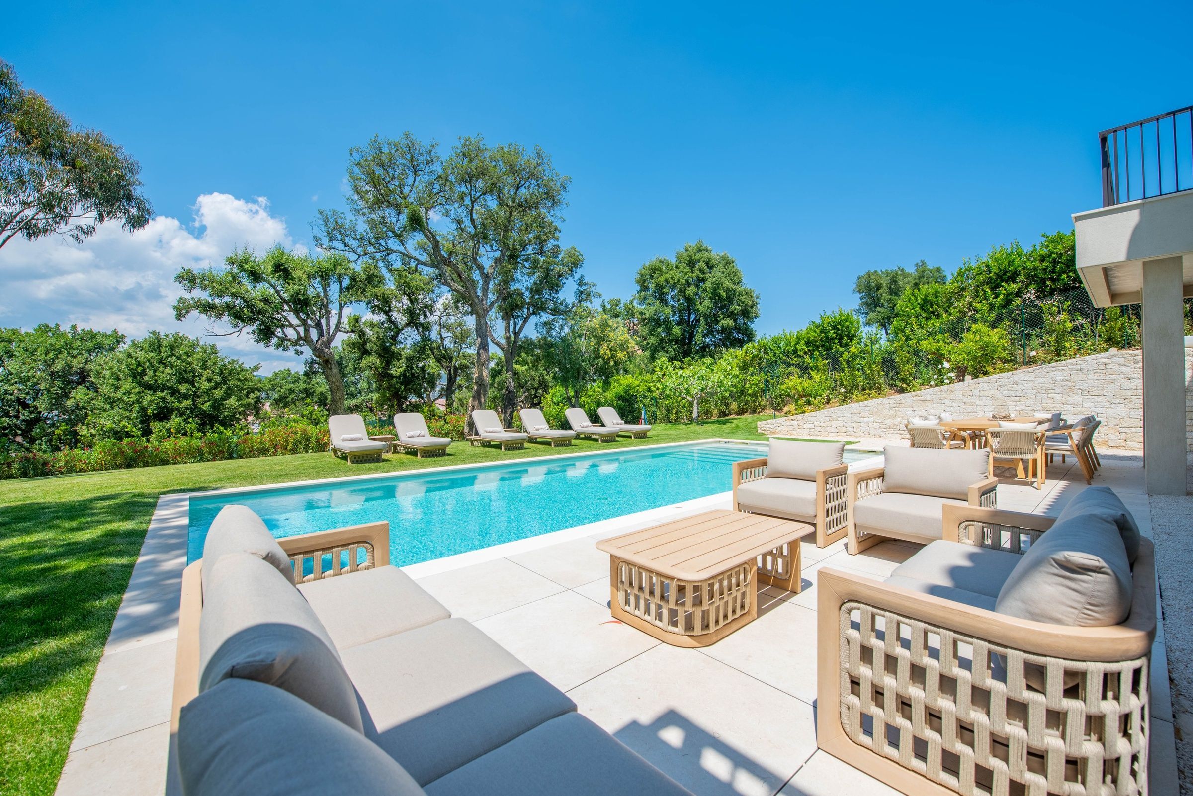 The property can comfortably accommodates 10 guests in five bedrooms, making it ideal for families or groups of friends seeking space, privacy, and elegance. The villa sits on a landscaped 2,000 m² plot, offering generous volumes, natural light, and seamless indoor-outdoor living. Clean architectural lines combined with noble materials create a warm and sophisticated Mediterranean atmosphere.