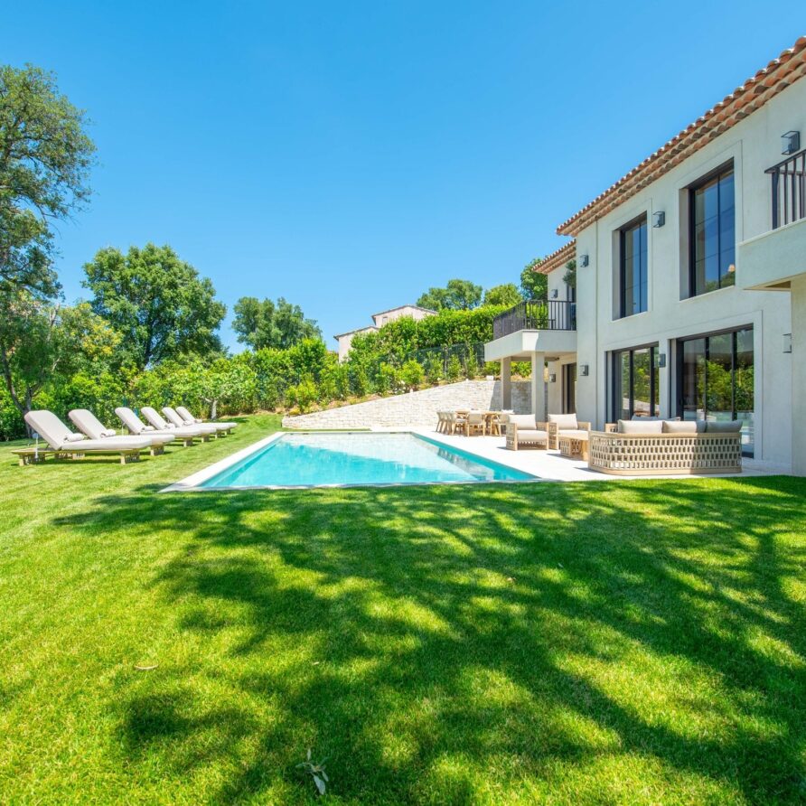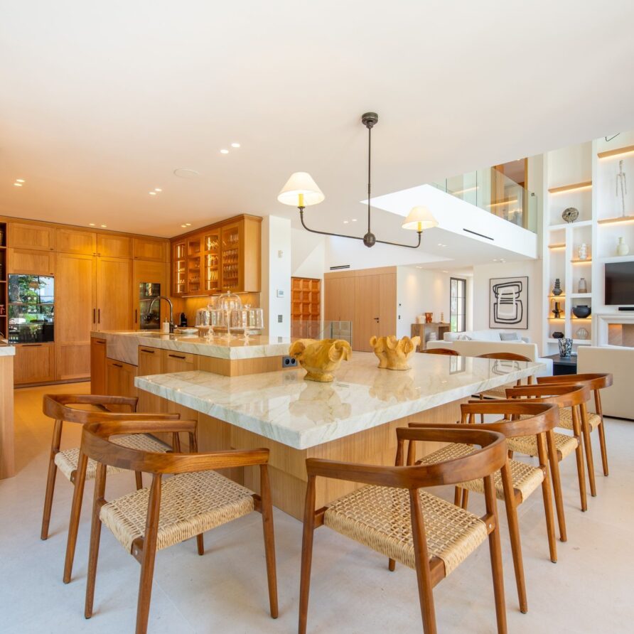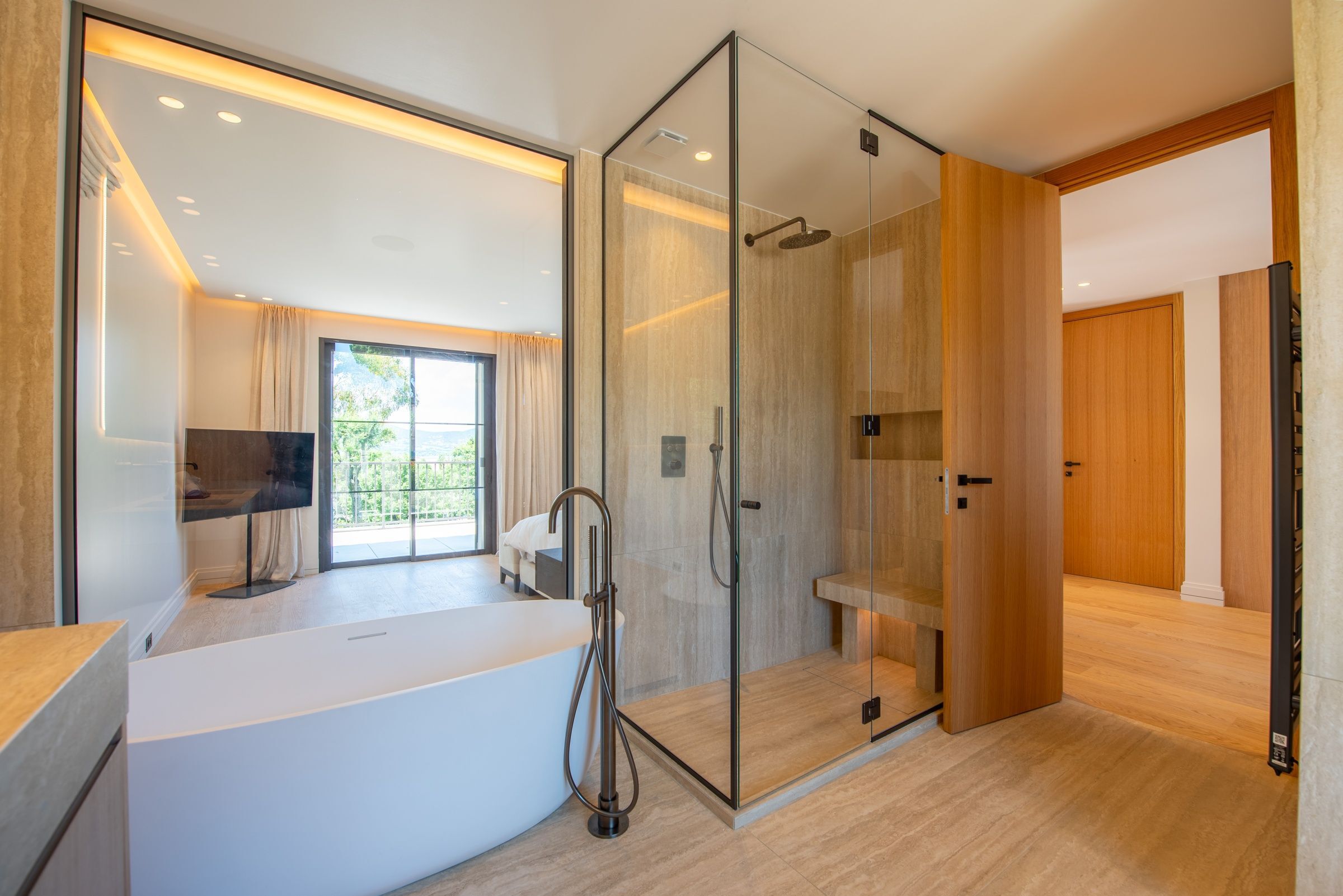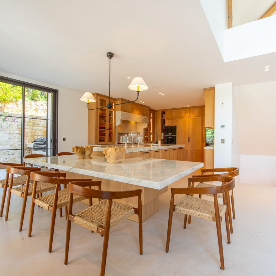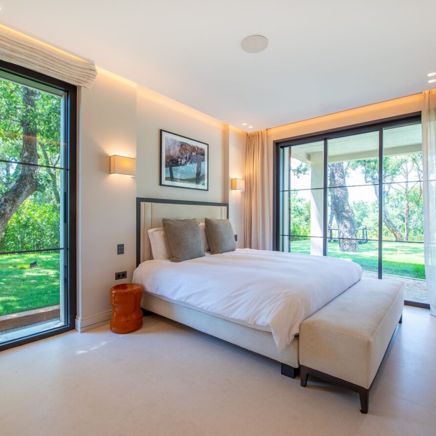 The property can comfortably accommodates 10 guests in five bedrooms, making it ideal for families or groups of friends seeking space, privacy, and elegance. The villa sits on a landscaped 2,000 m² plot, offering generous volumes, natural light, and seamless indoor-outdoor living. Clean architectural lines combined with noble materials create a warm and sophisticated Mediterranean atmosphere.