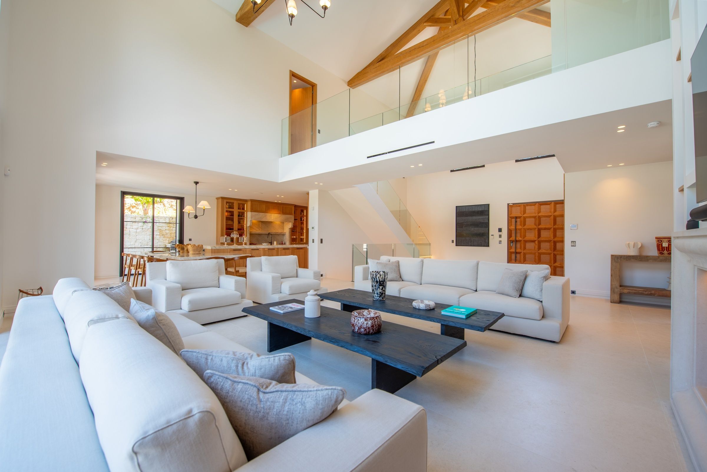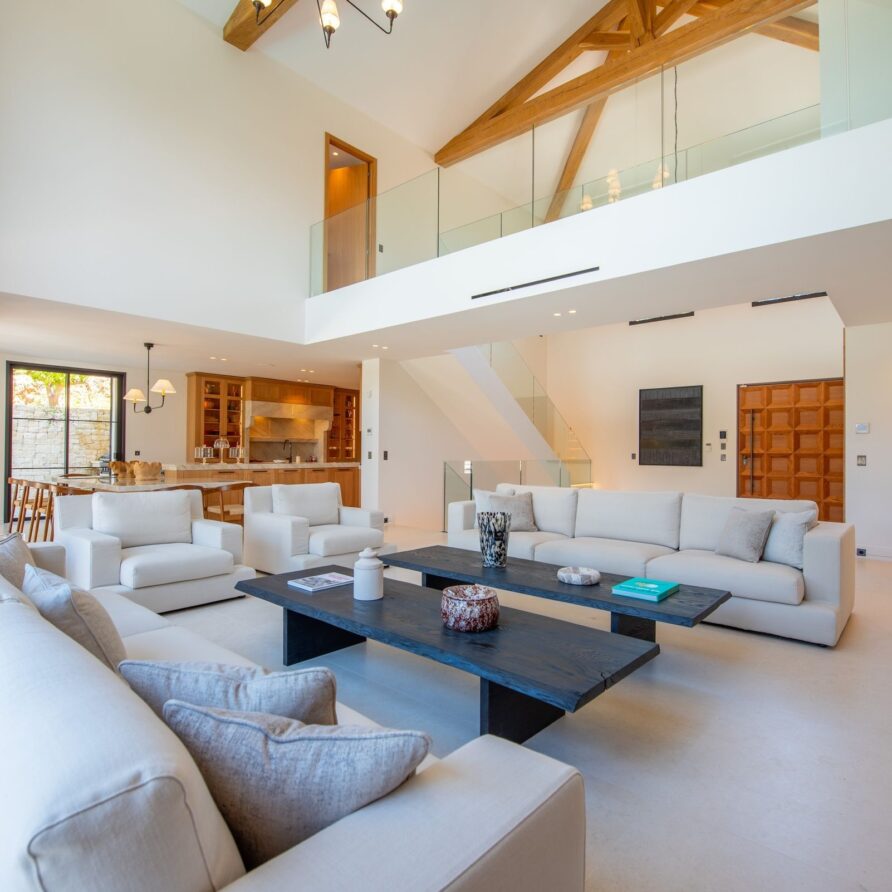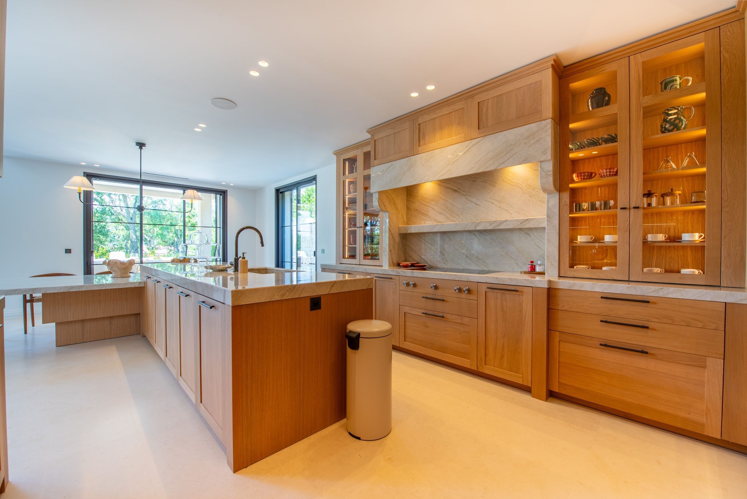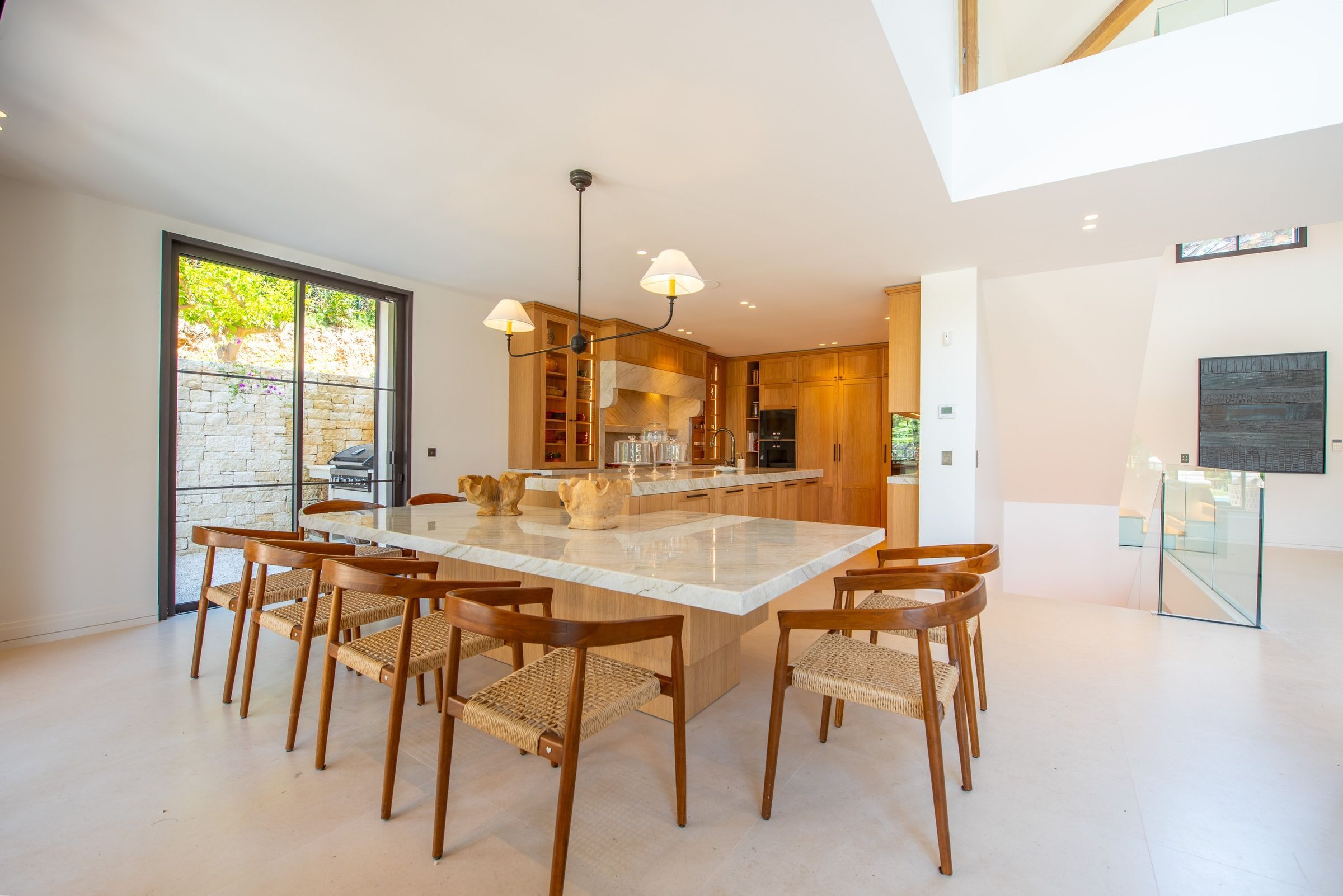 On the ground floor, a spectacular 100 m² living room, the centerpiece of the villa, highlighted by 8.5-meter-high exposed oak beams and flooded with natural light. A partial sea views can be seen from the living room and the garden maintain a constant connection with the Mediterranean. You can also find a fully equipped semi-professional Gaggenau kitchen, open to the dining area and living space, perfect for convivial moments.