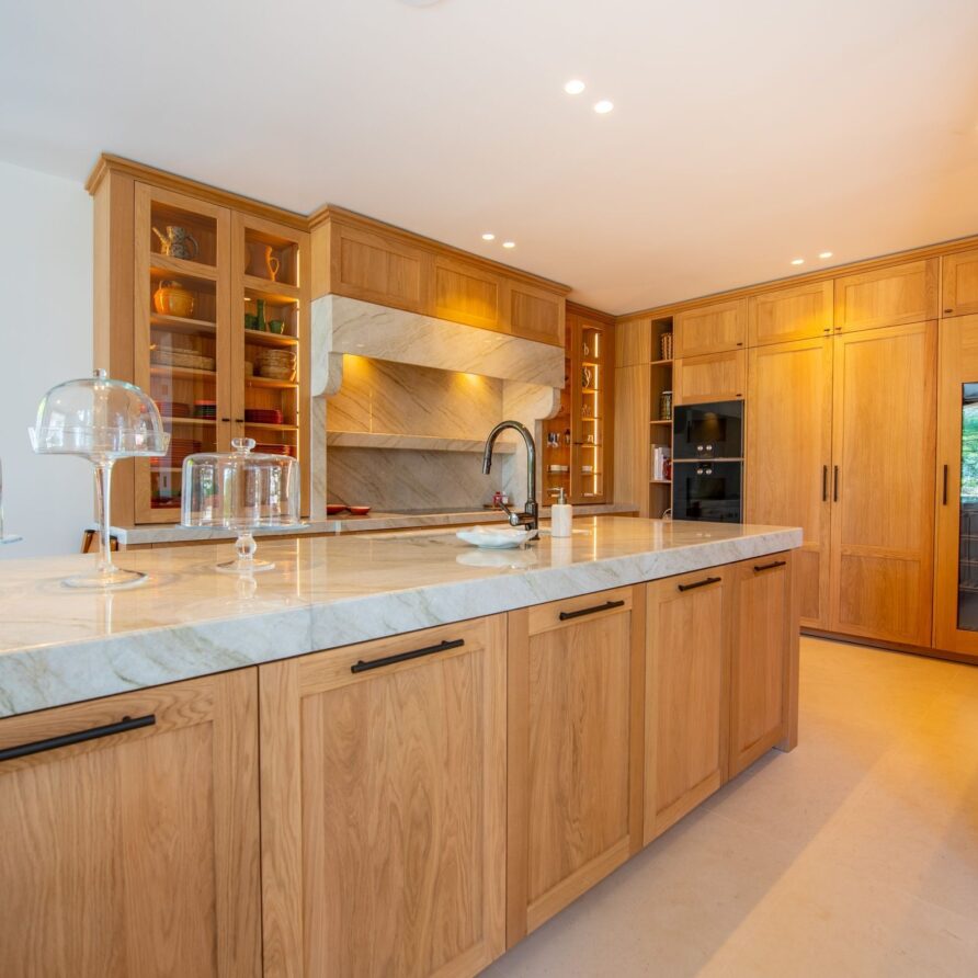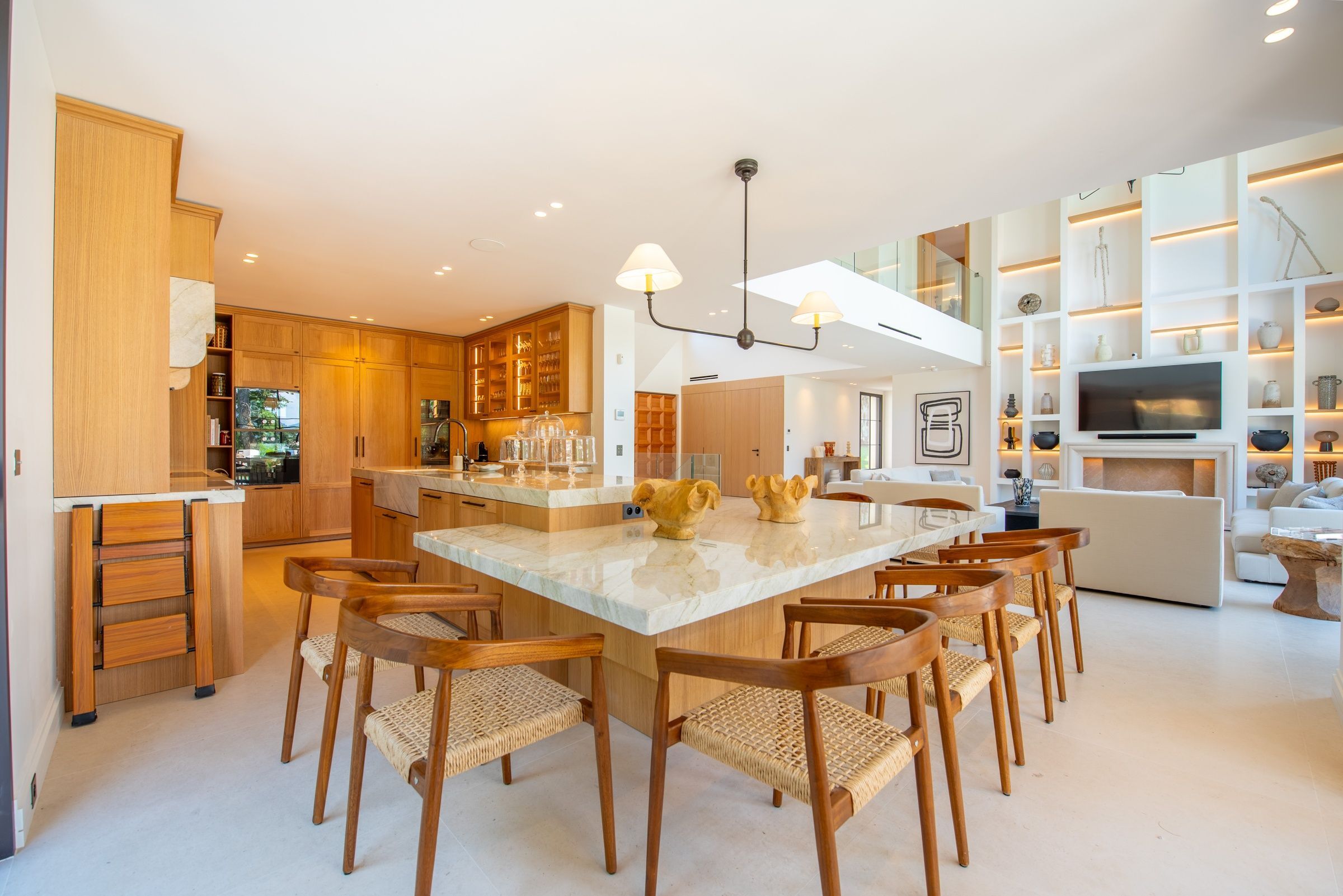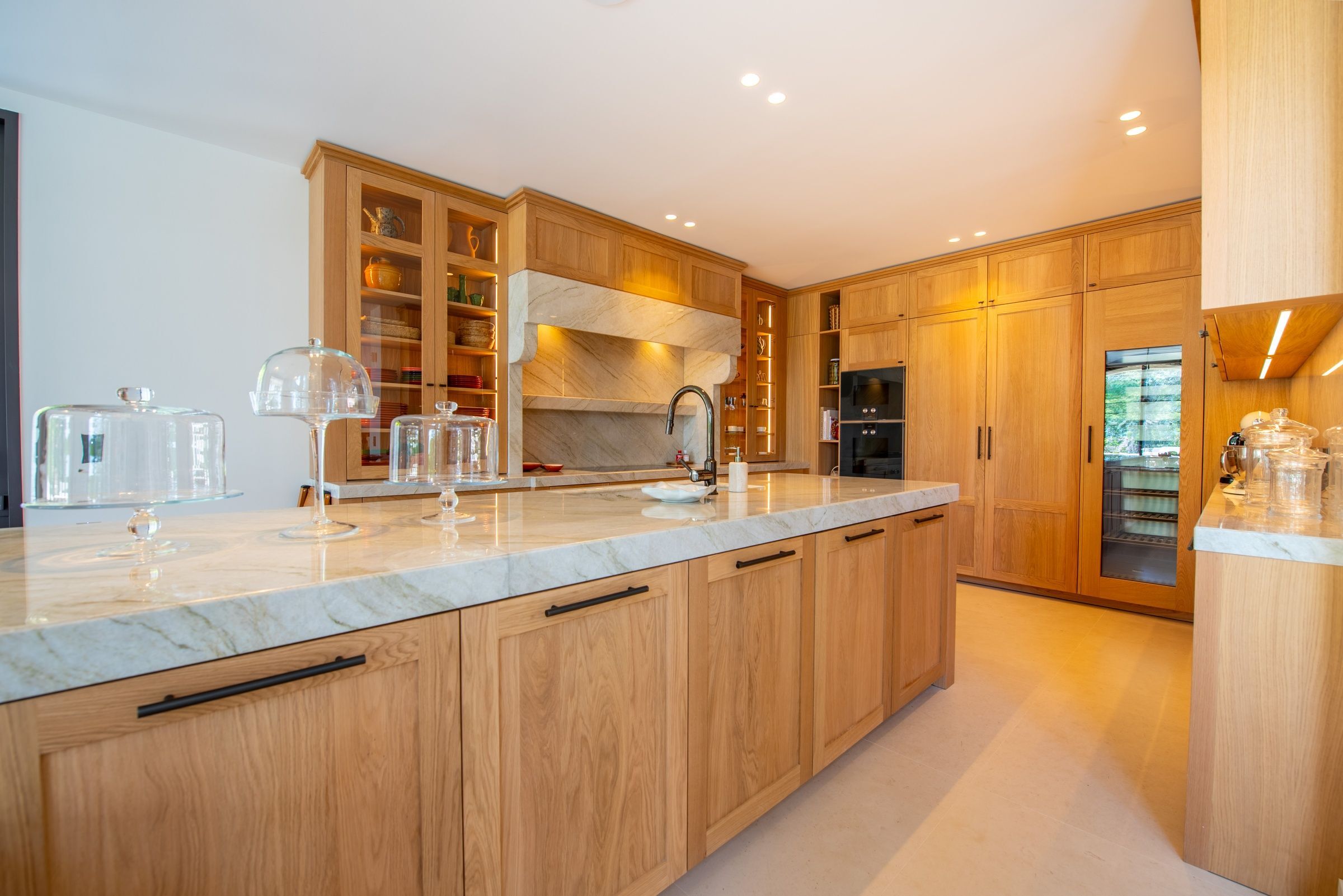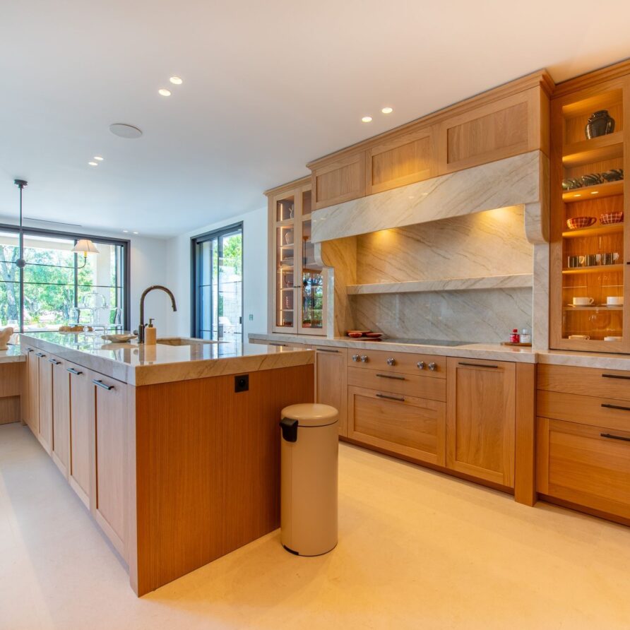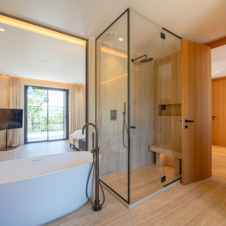 On the ground floor, a spectacular 100 m² living room, the centerpiece of the villa, highlighted by 8.5-meter-high exposed oak beams and flooded with natural light. A partial sea views can be seen from the living room and the garden maintain a constant connection with the Mediterranean. You can also find a fully equipped semi-professional Gaggenau kitchen, open to the dining area and living space, perfect for convivial moments.