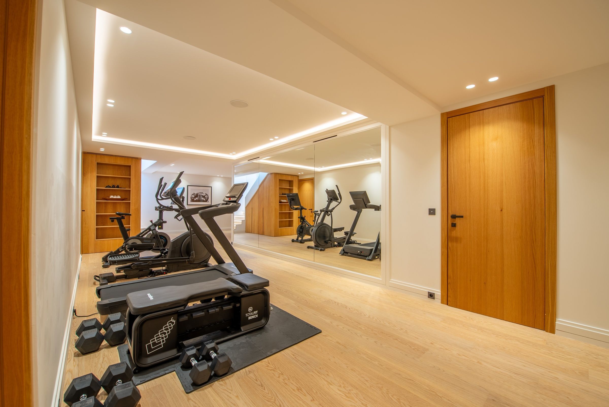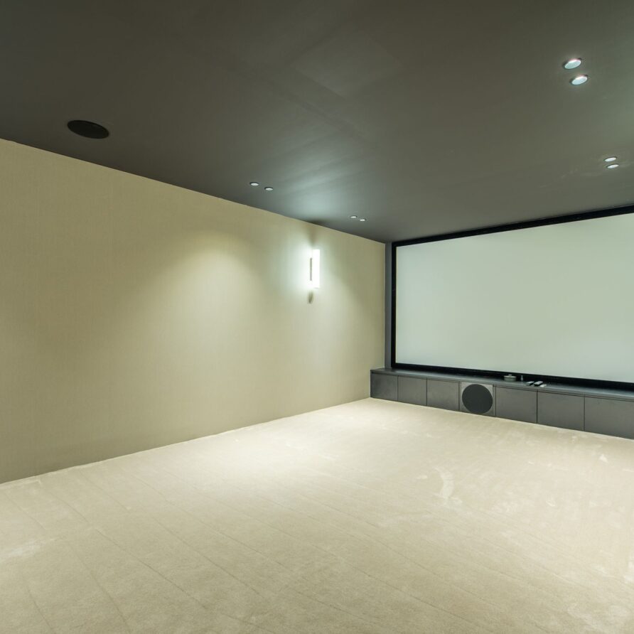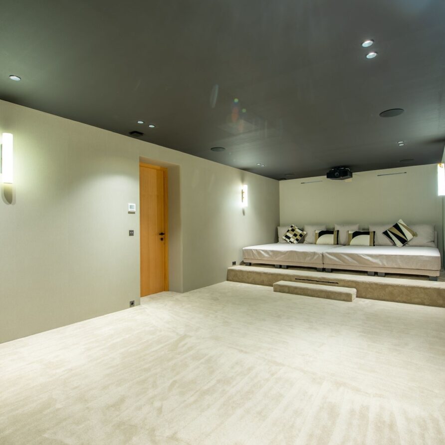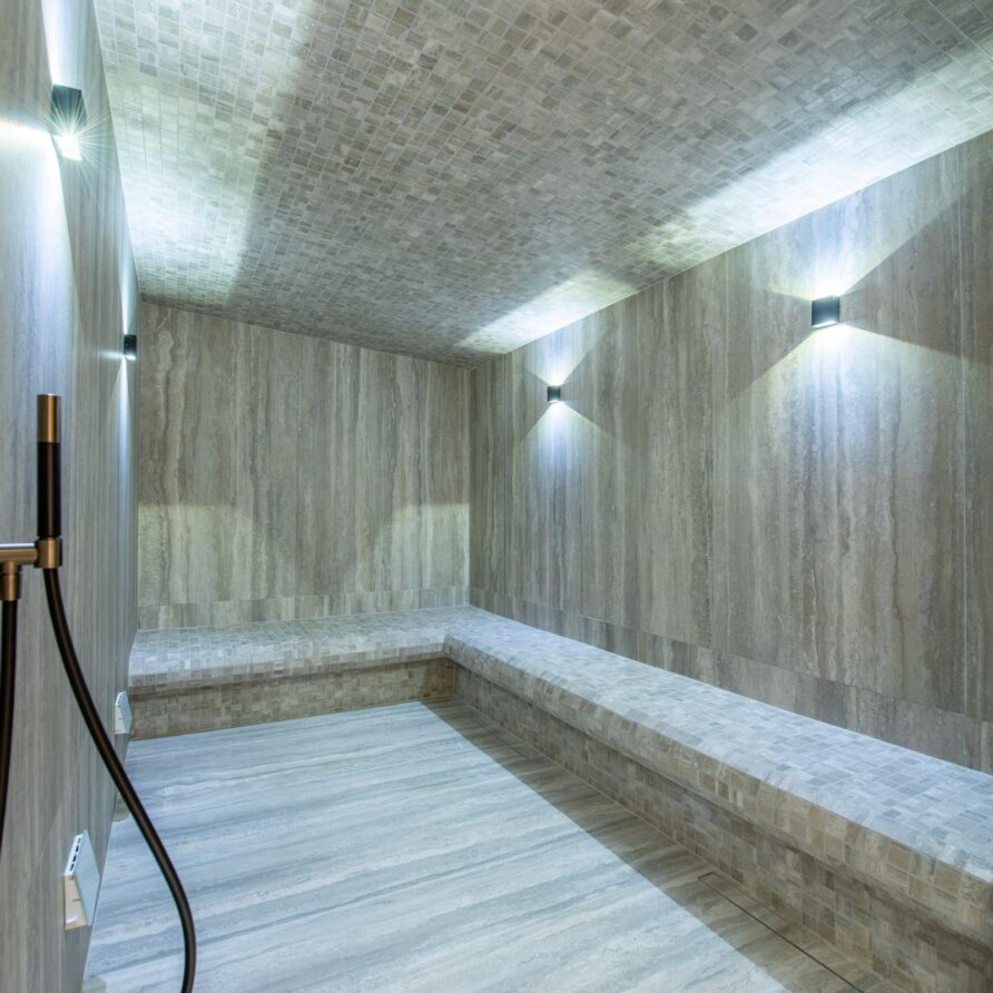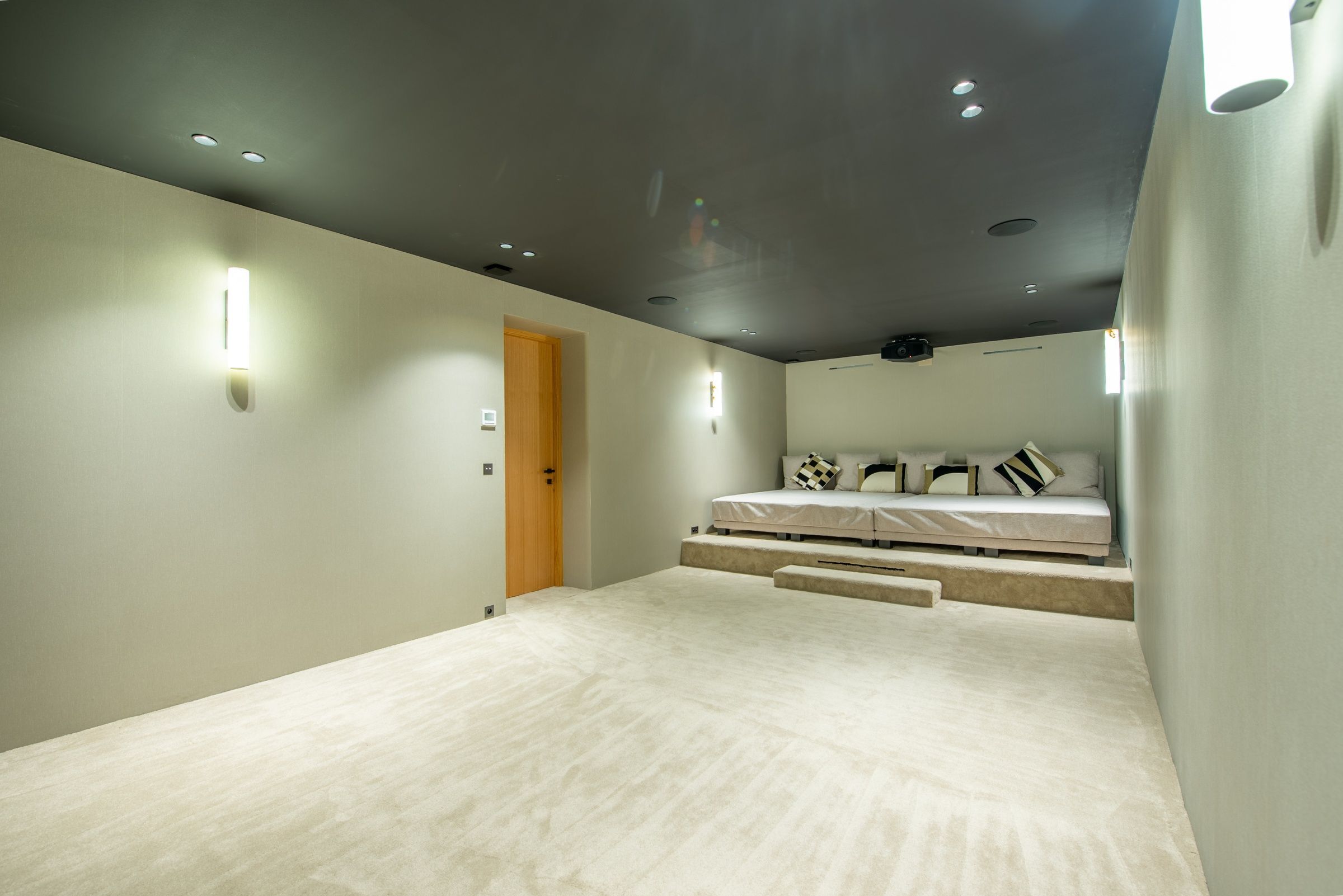 The lower Level has two elegant en-suite bedrooms with comfortable ceiling height, a semi-professional laundry room, a game and lounge area with bar, a fitness area with connected gym equipment, a complete wellness space including massage room, Hammam, relaxation area, a dedicated bathroom and a private cinema room with state-of-the-art audiovisual equipment and two large beds for a unique immersive experience.