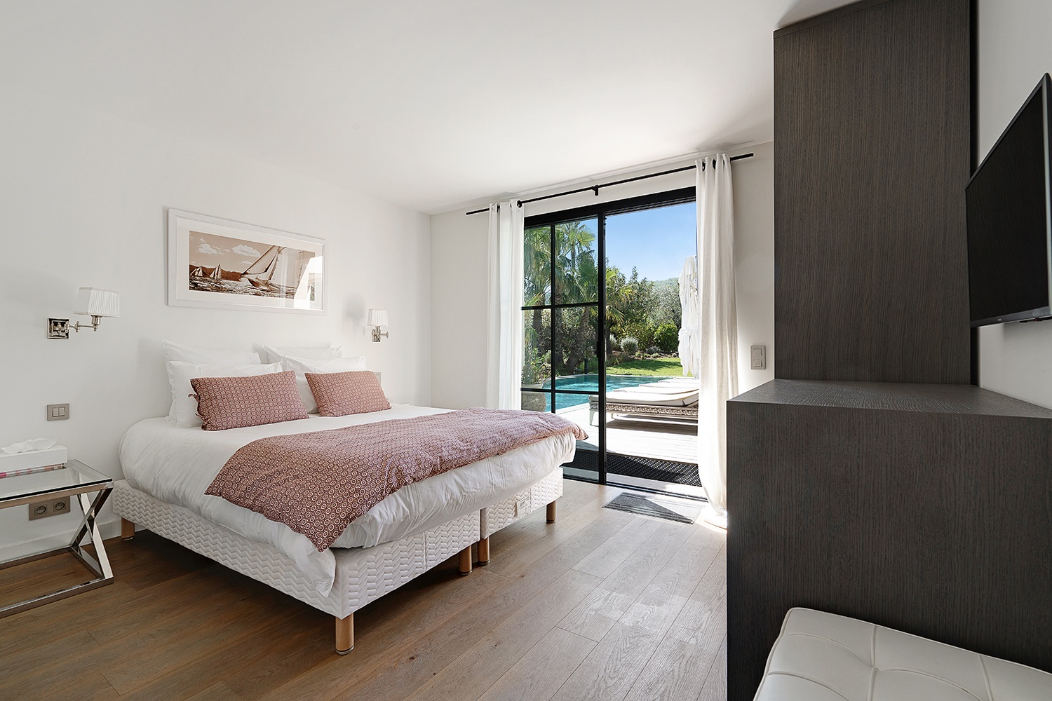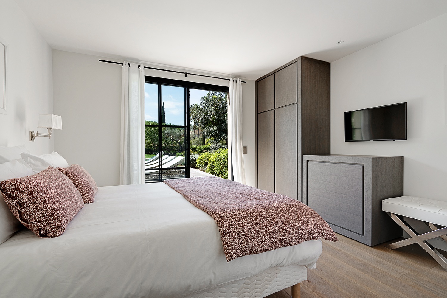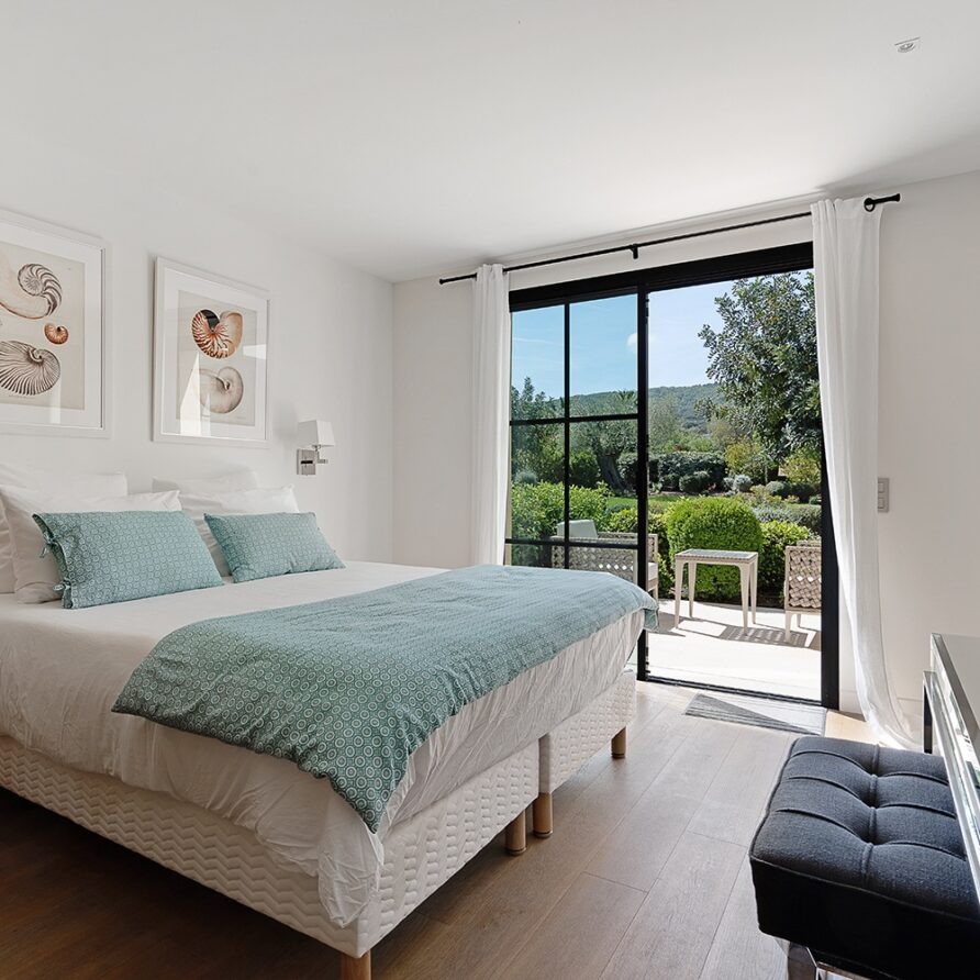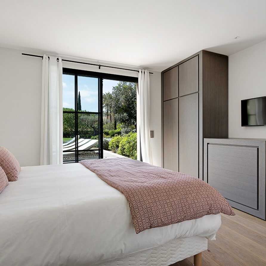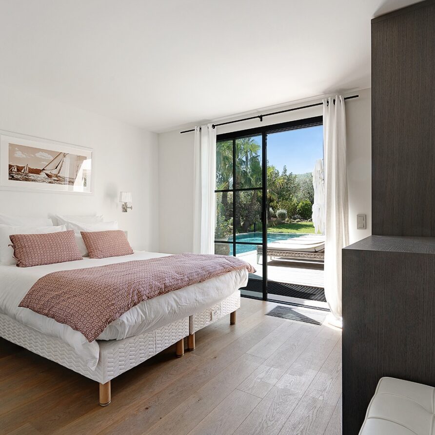Inside, the spacious open kitchen with its traditional piano could become a real place of transmission. The lounges and their fireplace will offer places of conviviality before joining the outside by the broad openings. The landscaped garden, heated swimming pool, barbecue and pool house will undoubtedly keep you at the villa for hours. Between two trips to the sea, the young and not so young will be able to challenge themselves to a game of football or ping pong or sip a cocktail at the water’s edge. The more athletic will be amazed to discover the house’s large gym, which will allow them to keep up the pace even on holiday.