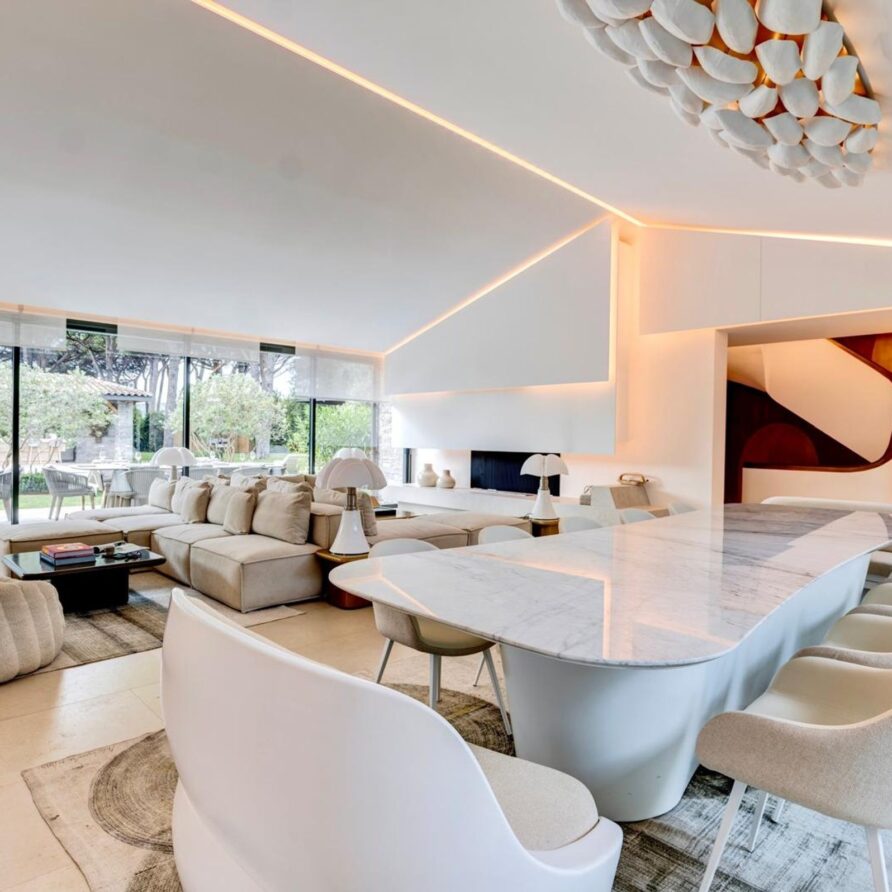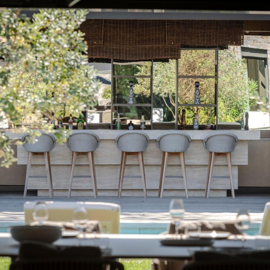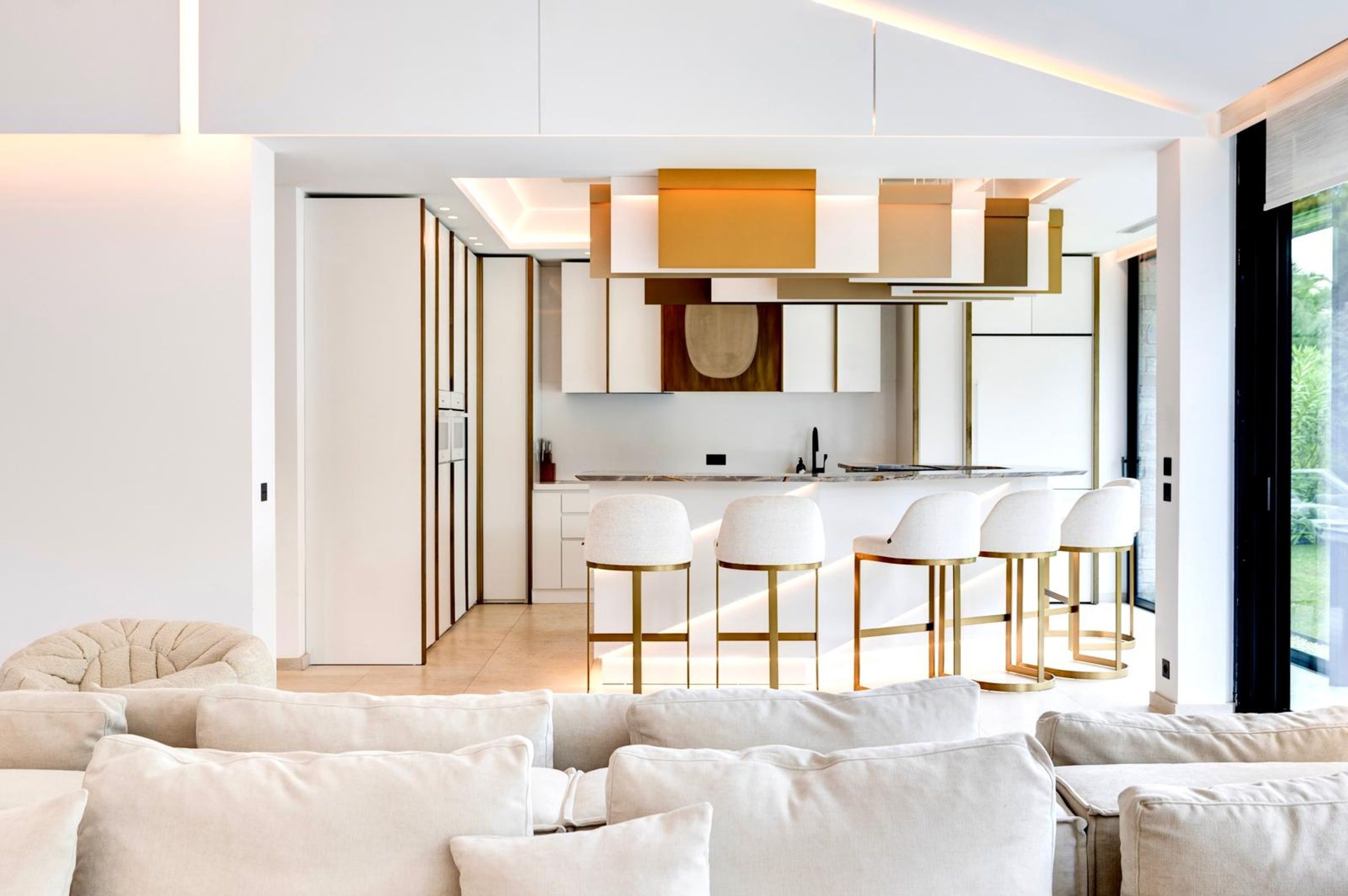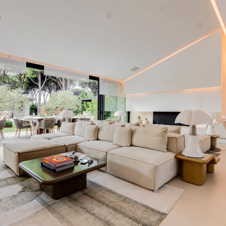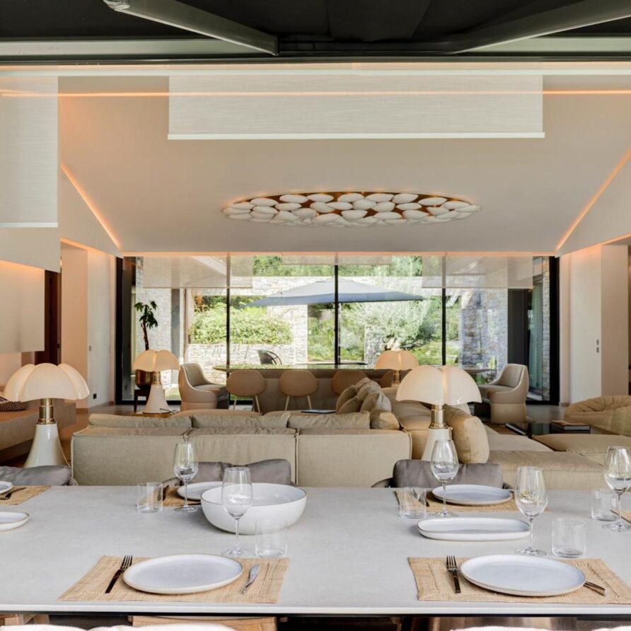 The villa showcases contemporary architecture with seamless indoor-outdoor living spaces, an open living plan and various outdoor dining and lounge areas. A calm and sun-drenched living room stretches out in delicate, neutral tones, complemented by a very spacious kitchen, modernly furnished and with all the utilities. Floor-to-ceiling glass doors open the room to a verdant courtyard, blurring the line between indoors and out. Beyond the open glass, a patio dining table and chairs sit under trees and shrubs, the greenery offering a cool, leafy backdrop that contrasts with the interior’s warm creams and tans.