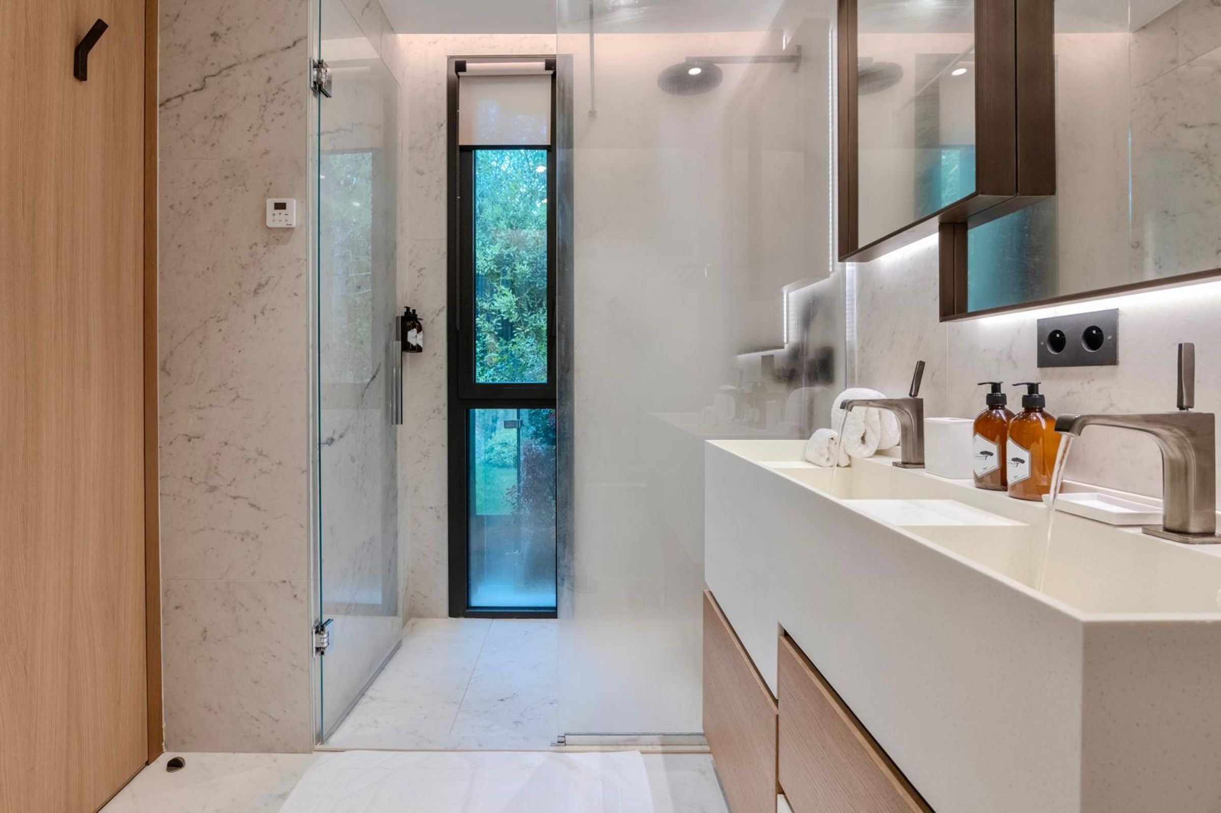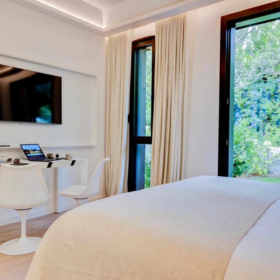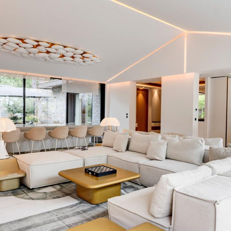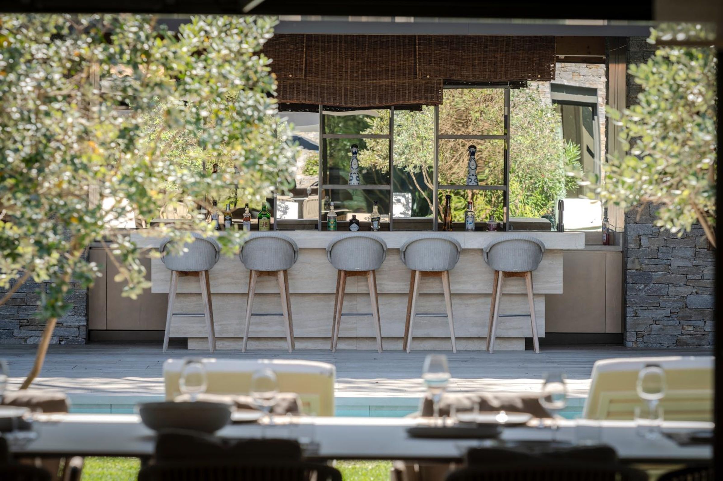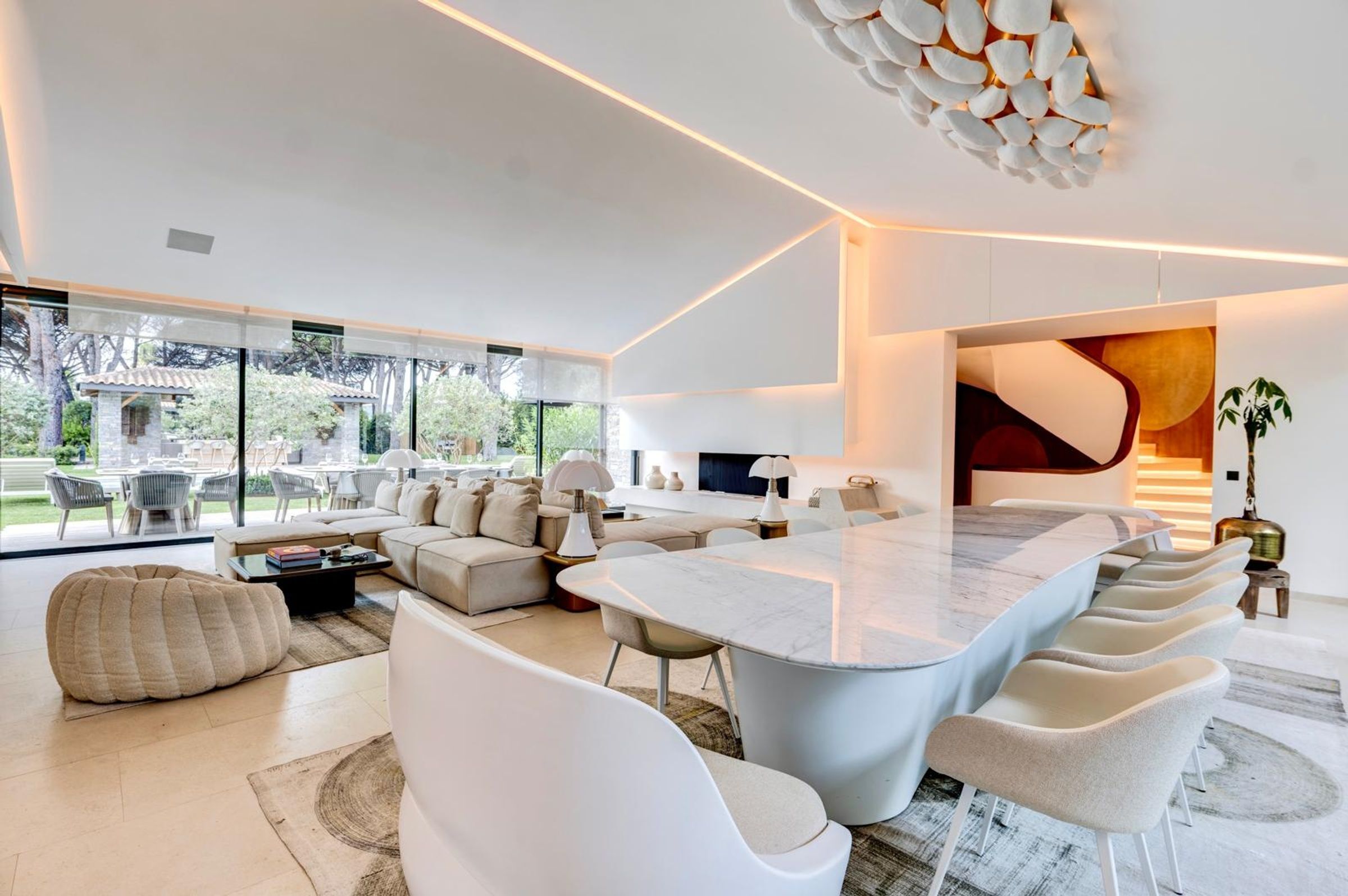 The villa showcases contemporary architecture with seamless indoor-outdoor living spaces, an open living plan and various outdoor dining and lounge areas. A calm and sun-drenched living room stretches out in delicate, neutral tones, complemented by a very spacious kitchen, modernly furnished and with all the utilities. Floor-to-ceiling glass doors open the room to a verdant courtyard, blurring the line between indoors and out. Beyond the open glass, a patio dining table and chairs sit under trees and shrubs, the greenery offering a cool, leafy backdrop that contrasts with the interior’s warm creams and tans.