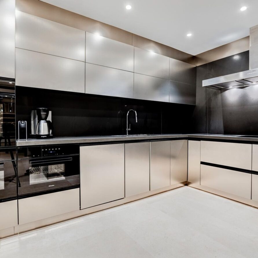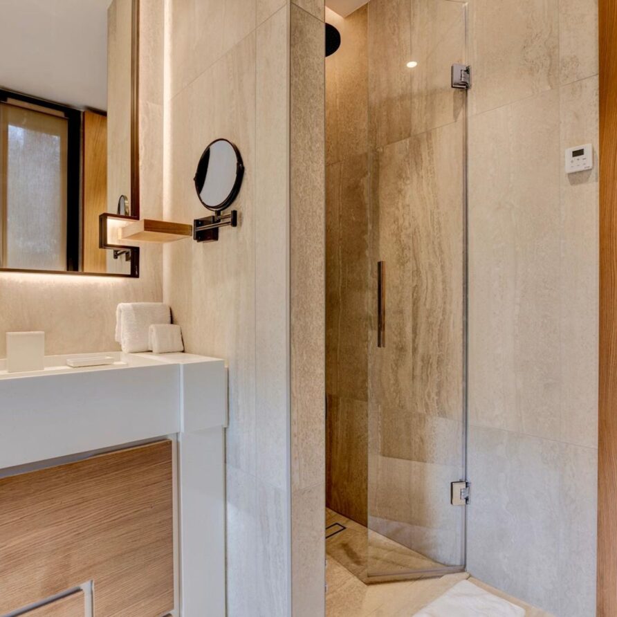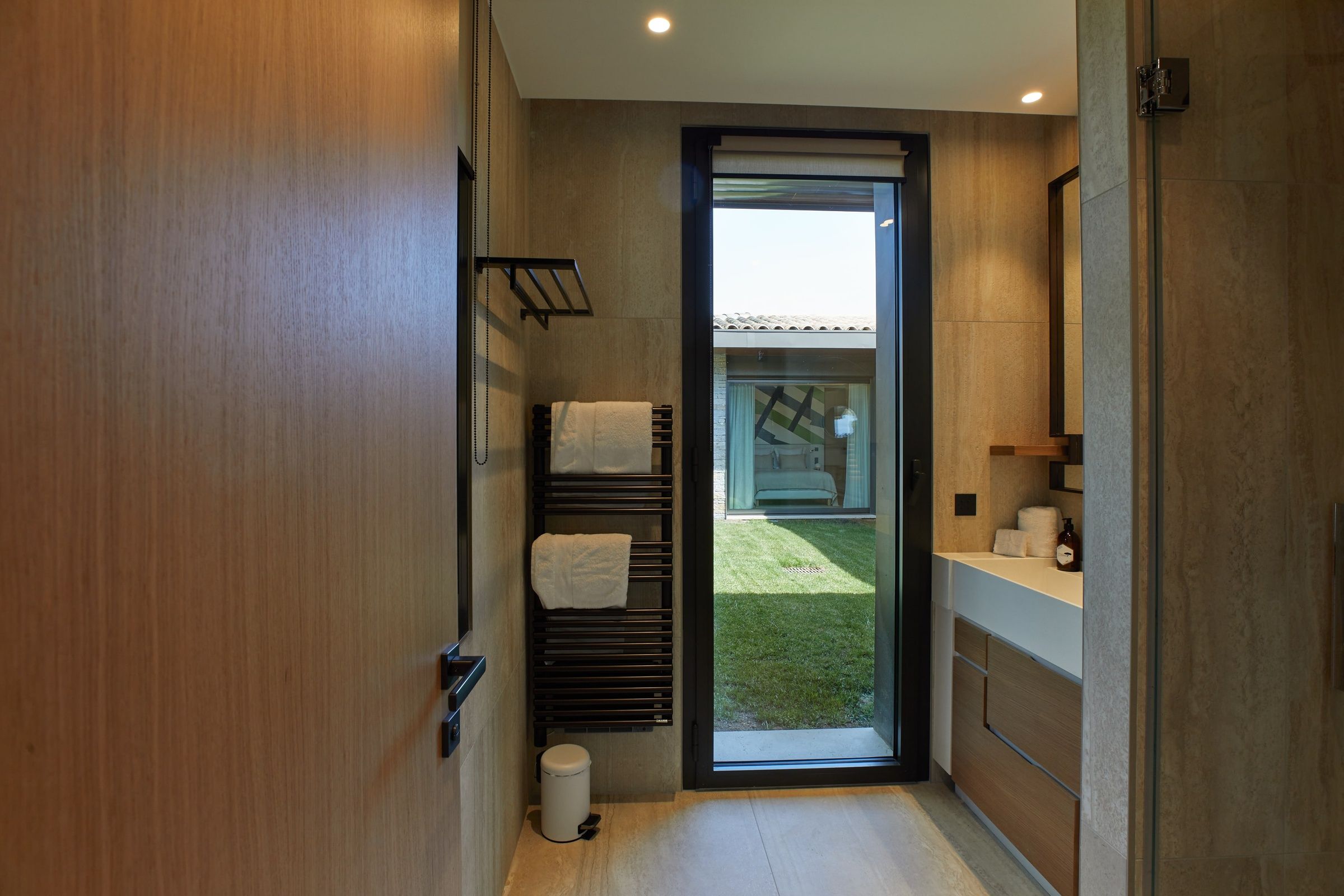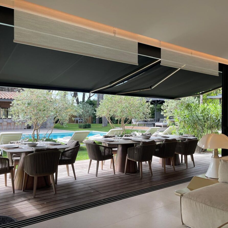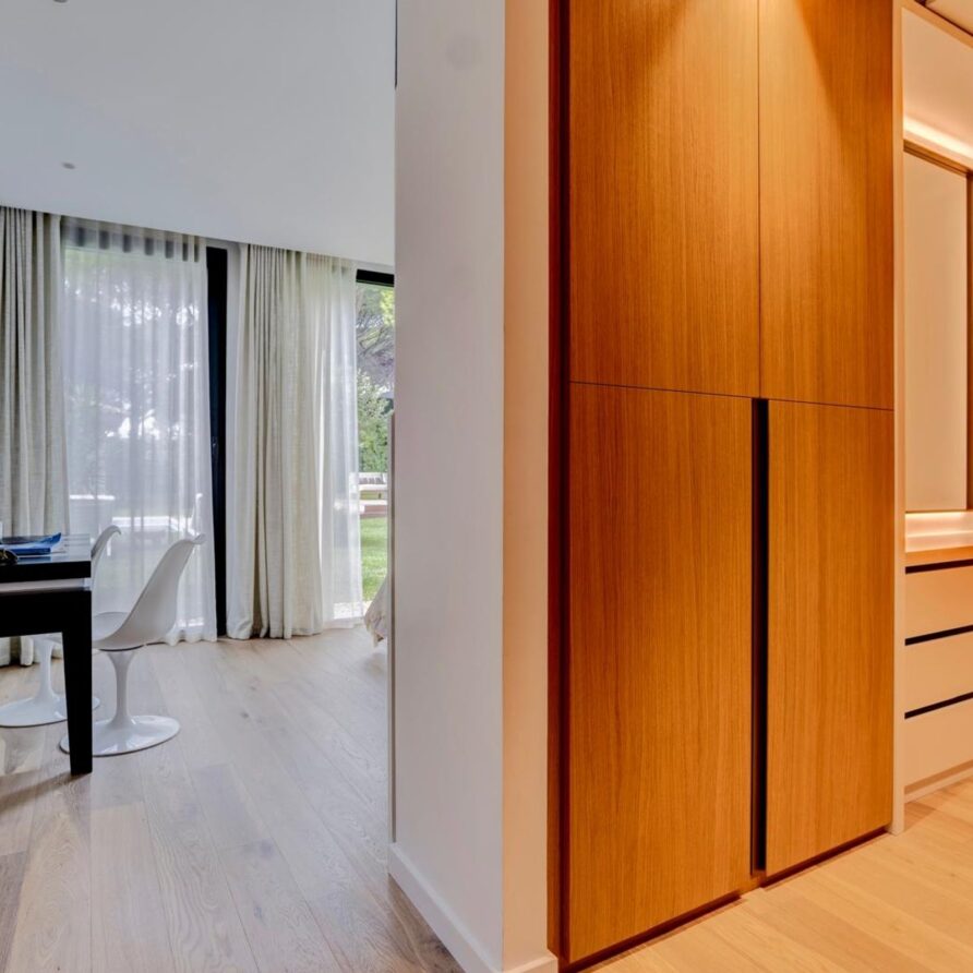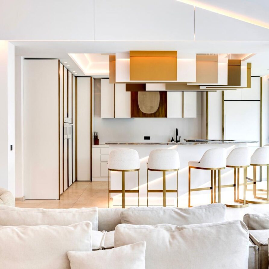 The villa showcases contemporary architecture with seamless indoor-outdoor living spaces, an open living plan and various outdoor dining and lounge areas. A calm and sun-drenched living room stretches out in delicate, neutral tones, complemented by a very spacious kitchen, modernly furnished and with all the utilities. Floor-to-ceiling glass doors open the room to a verdant courtyard, blurring the line between indoors and out. Beyond the open glass, a patio dining table and chairs sit under trees and shrubs, the greenery offering a cool, leafy backdrop that contrasts with the interior’s warm creams and tans.