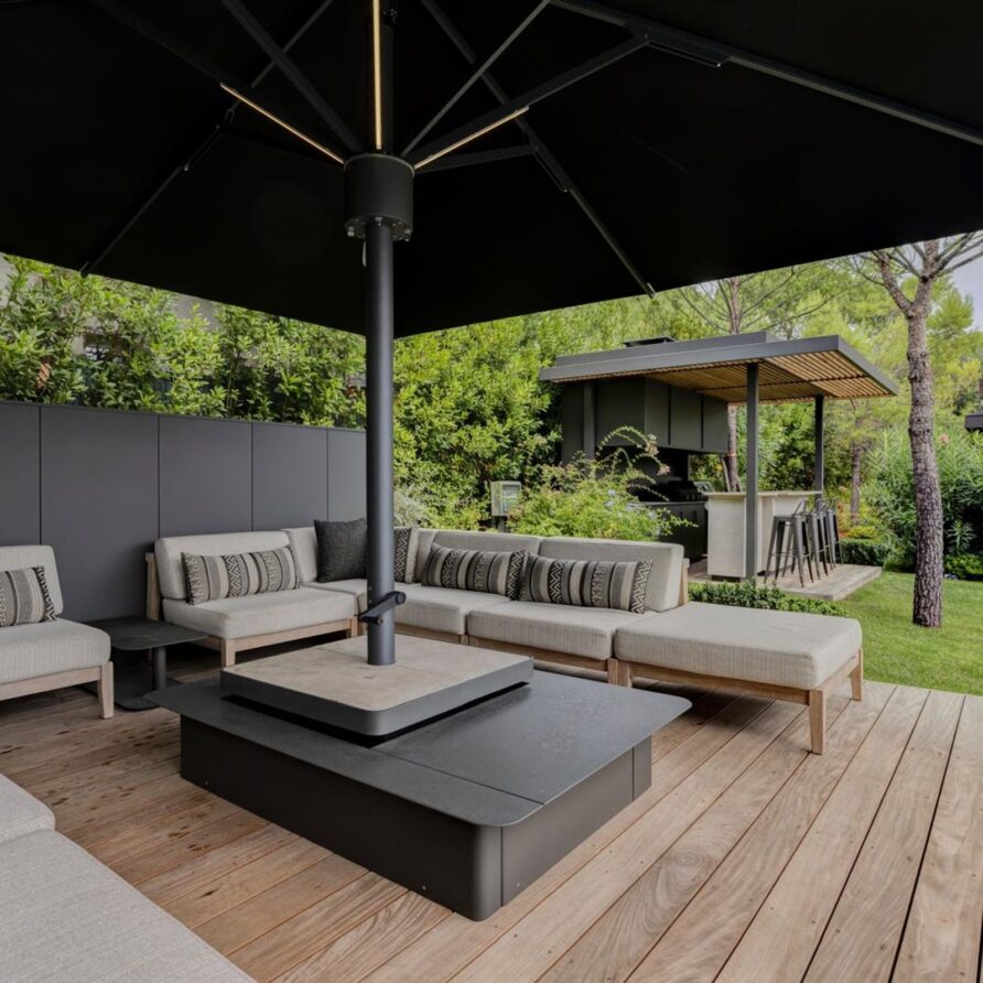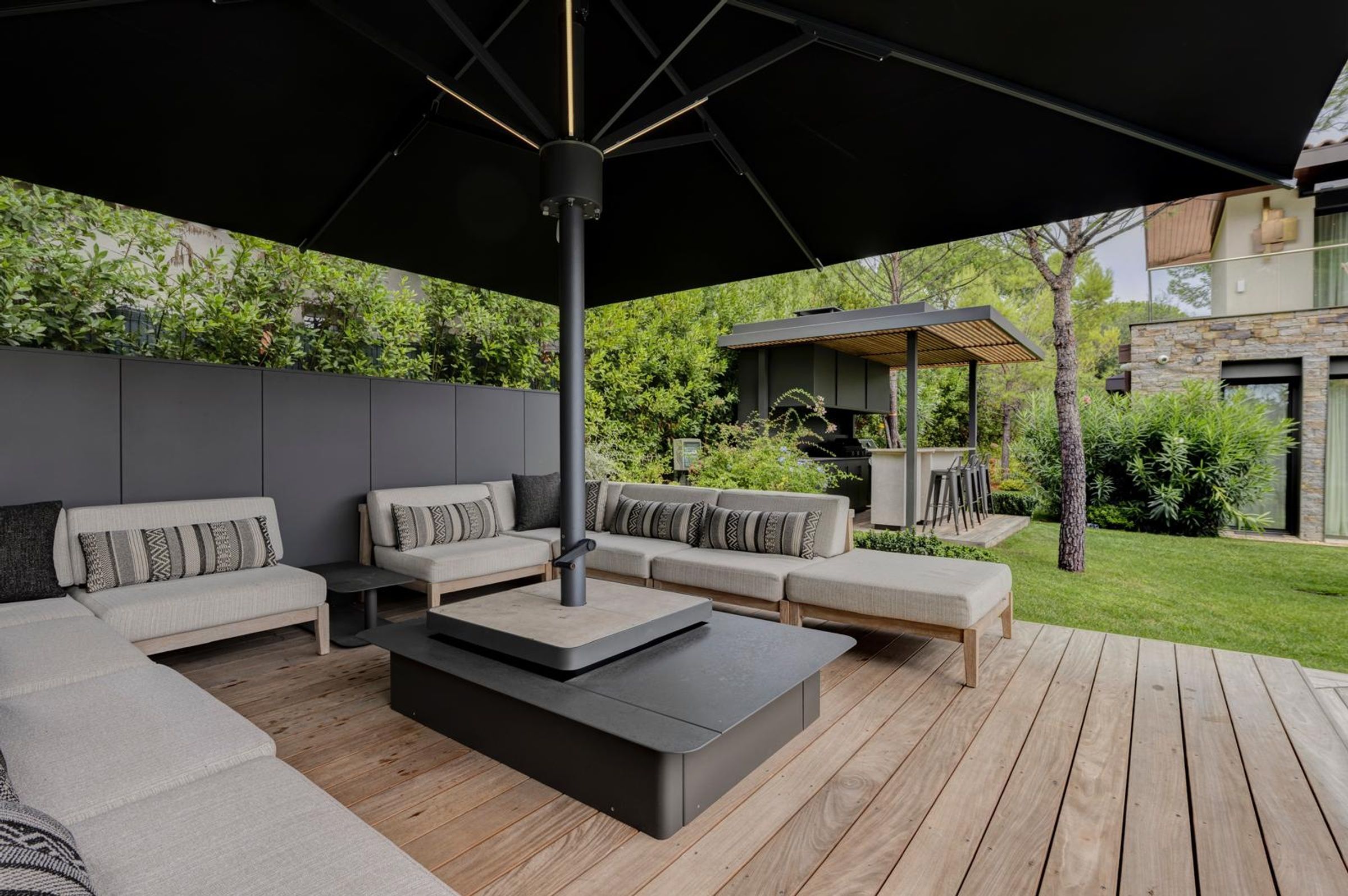 The overall impression is calm and inviting: a carefully designed domestic retreat that feels both elegant and intimate. The warm interior lights and the cool sheen of the pool create a pleasing contrast, suggesting an approaching night that promises quiet comfort and lingering outdoor hours. By the pool, a low, modern lounge area sits tucked into a backyard, its clean lines and soft neutrals creating a calm, almost hotel-like retreat. Pale wooden decking stretches out beneath a U-shaped arrangement of cushioned seating. At the center is a rectangular coffee table in a darker gray, pierced by the shaft of a large black umbrella that casts a cool, protective canopy over the whole conversation pit. The same setting includes a quiet outdoor bar, perfect for long conversations.