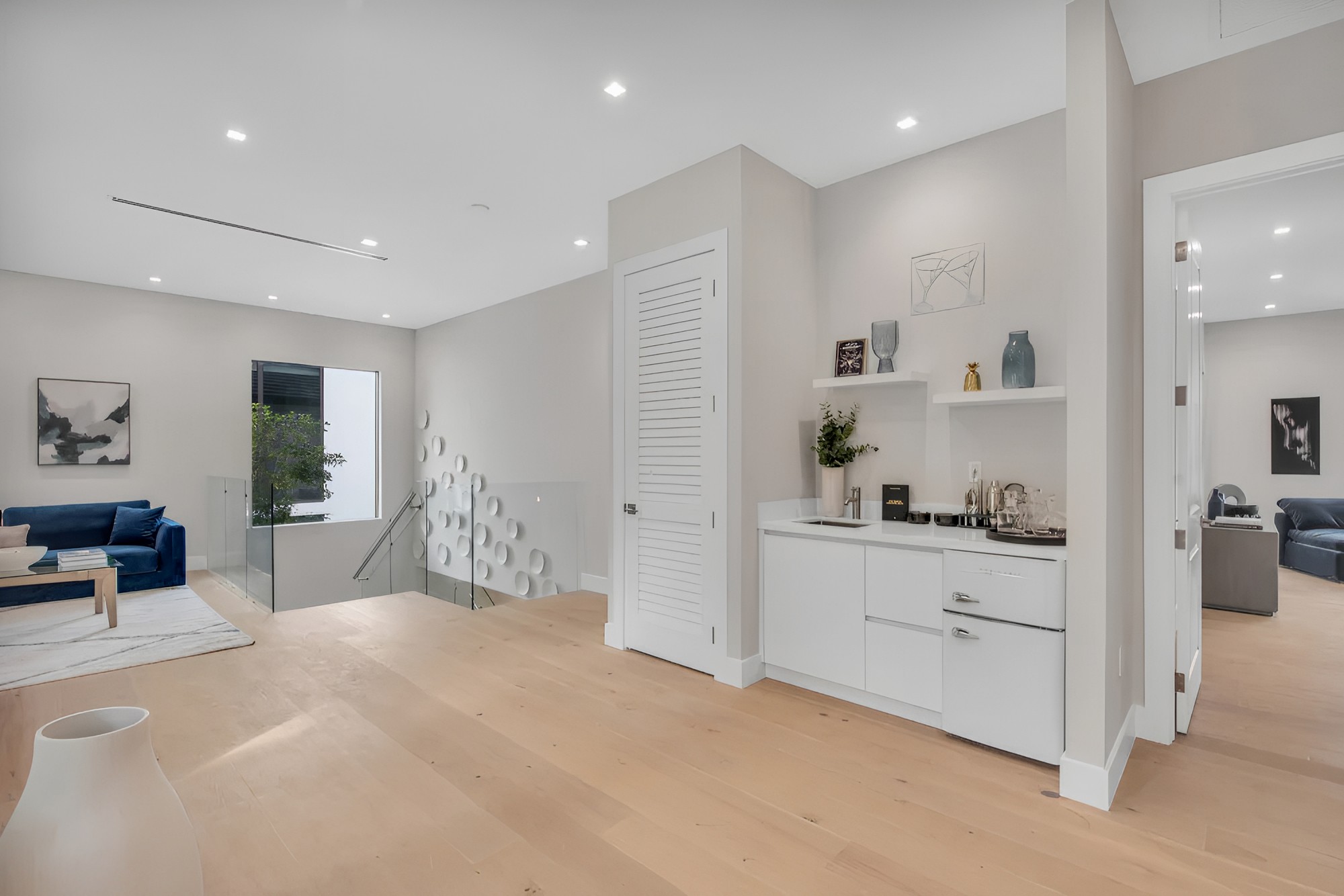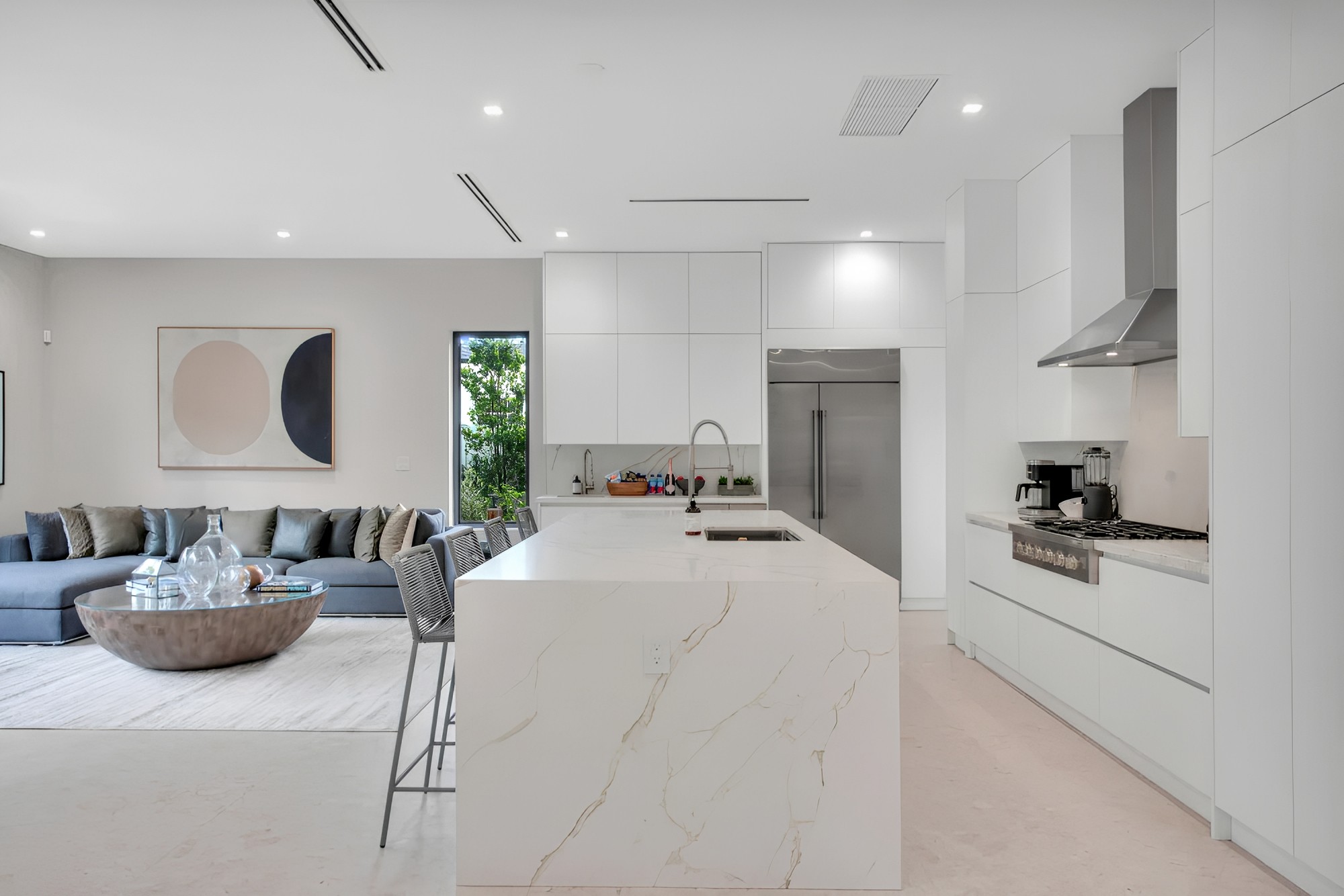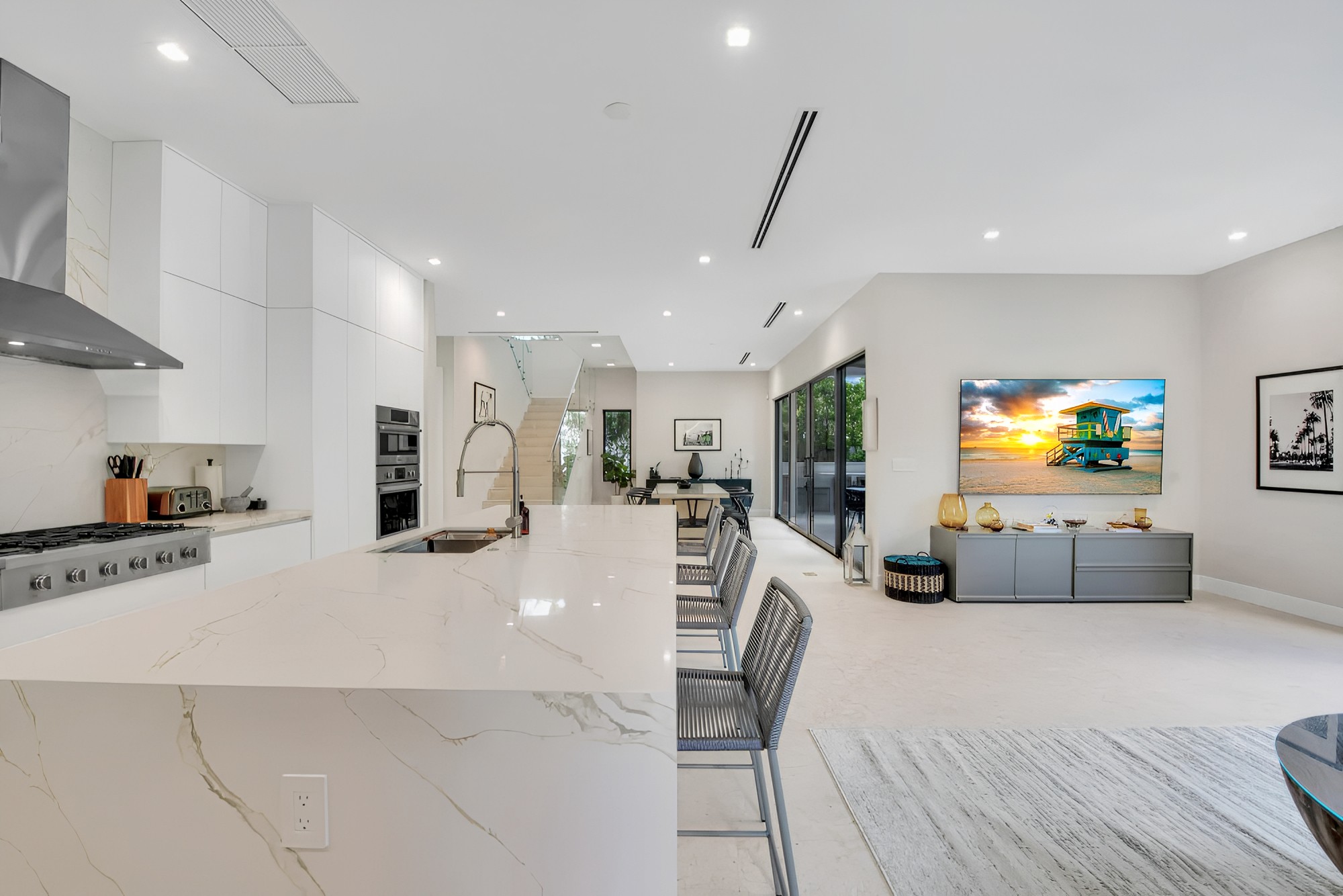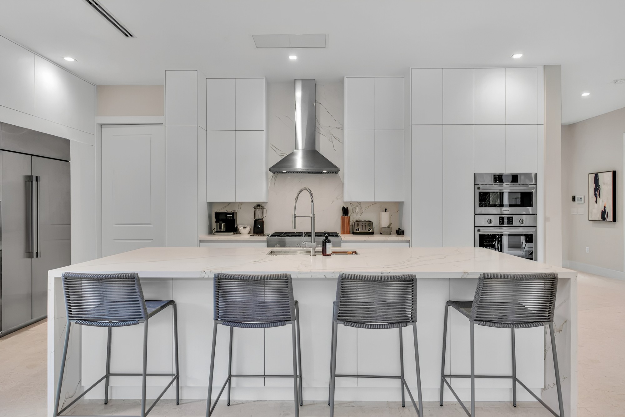 Inside, wood plank limestone tiles grace the floors, enhancing the modern and welcoming ambiance. The stunning custom kitchen boasts 12’ kitchen island quartz countertops with a waterfall finish, complemented by high-end stainless steel appliances. From built-in micro/oven combos to cook-tops, wall hoods, and wine coolers, this kitchen is a culinary haven, perfect for hosting private chef dinners.