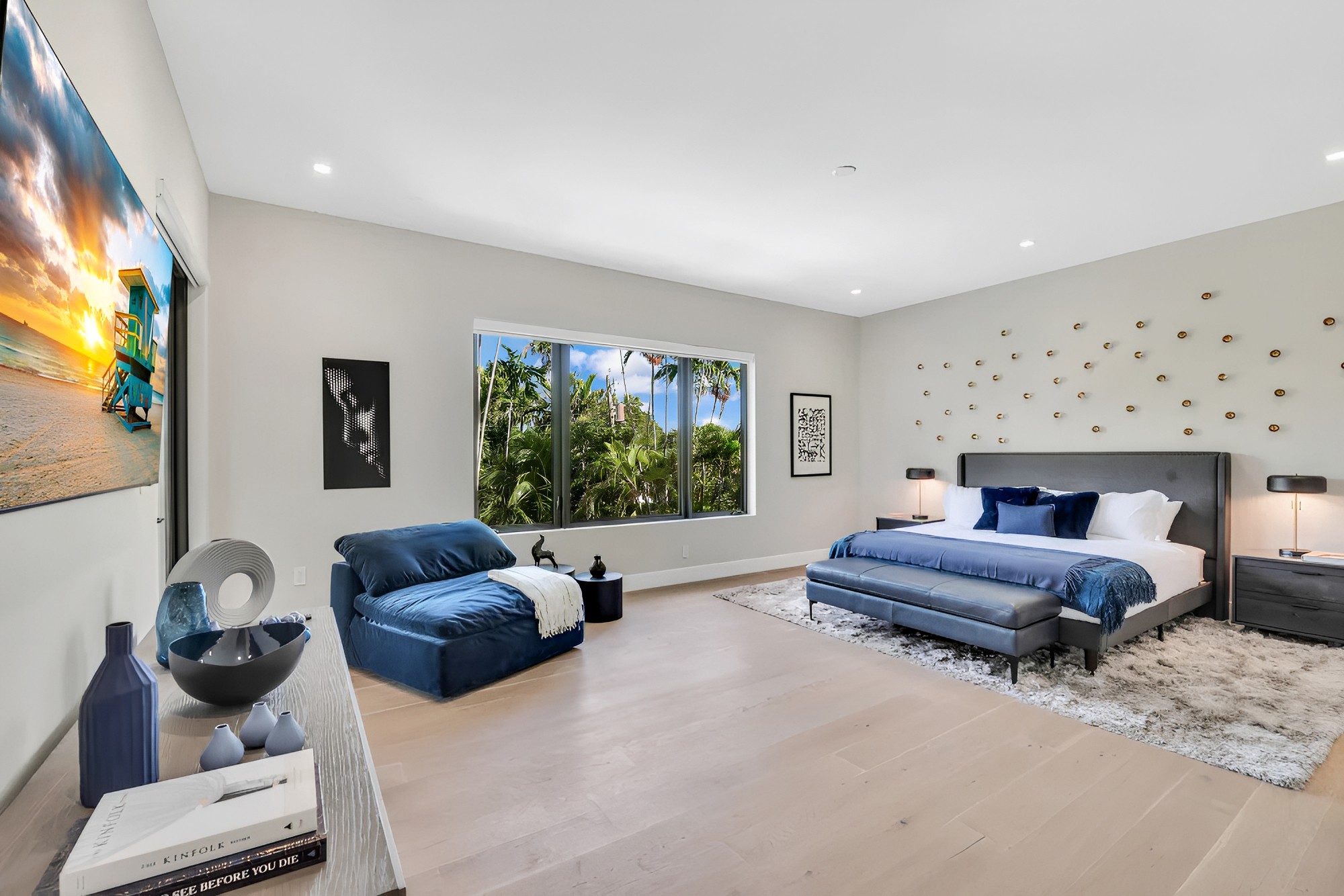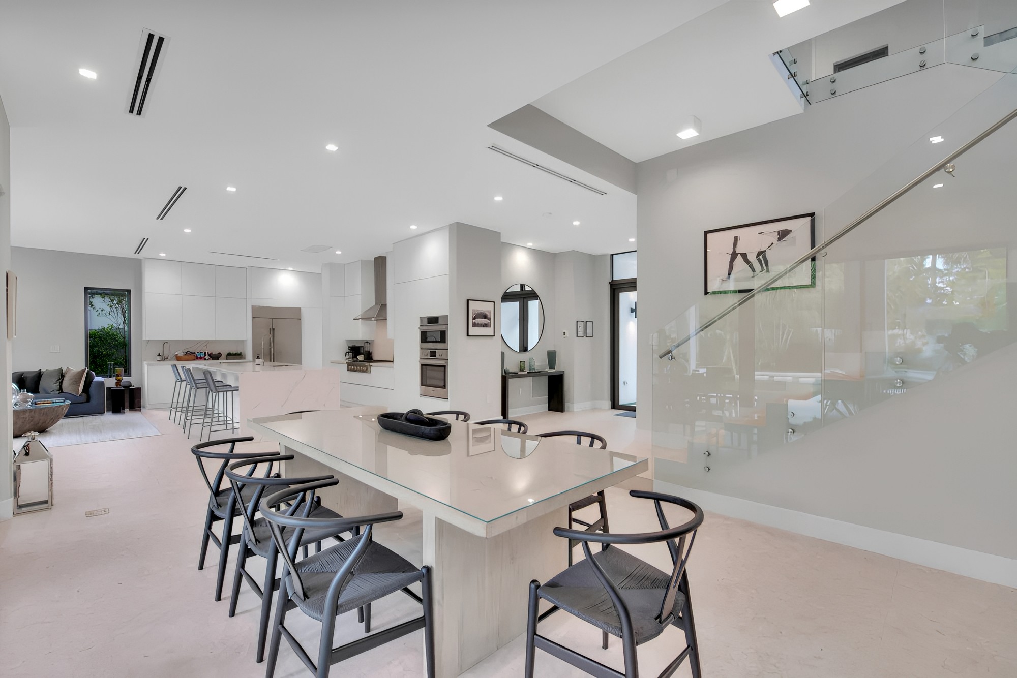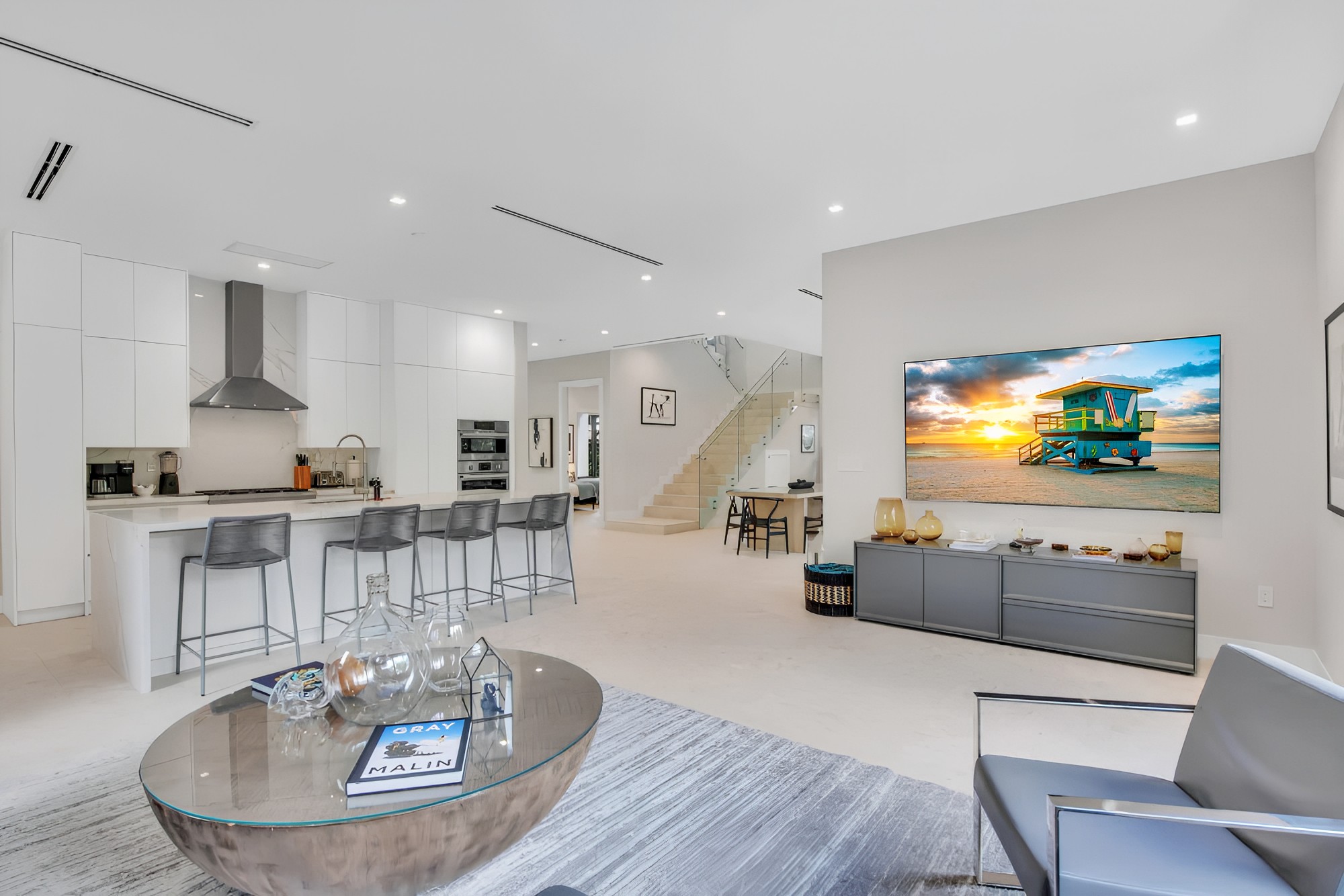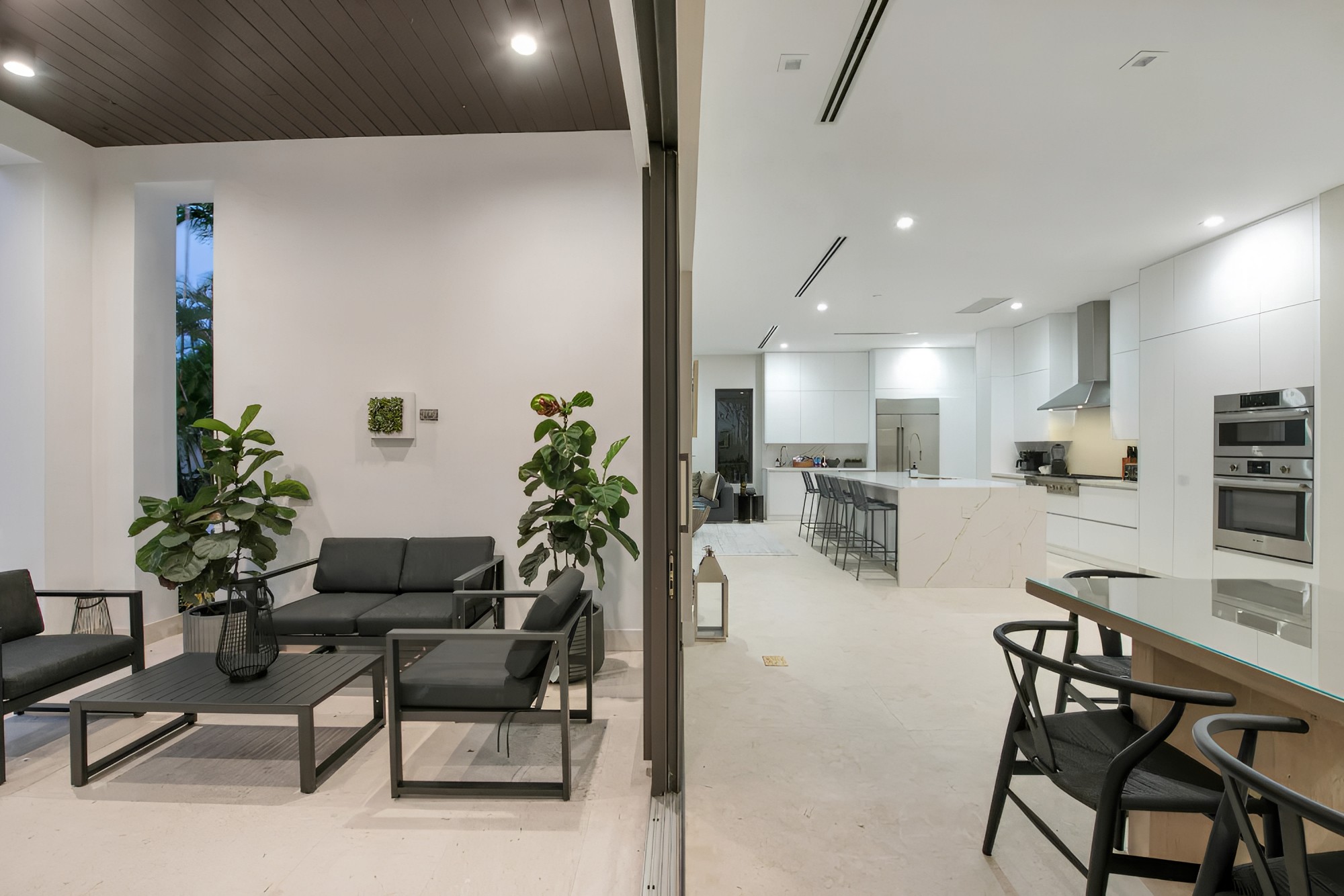 Inside, wood plank limestone tiles grace the floors, enhancing the modern and welcoming ambiance. The stunning custom kitchen boasts 12’ kitchen island quartz countertops with a waterfall finish, complemented by high-end stainless steel appliances. From built-in micro/oven combos to cook-tops, wall hoods, and wine coolers, this kitchen is a culinary haven, perfect for hosting private chef dinners.