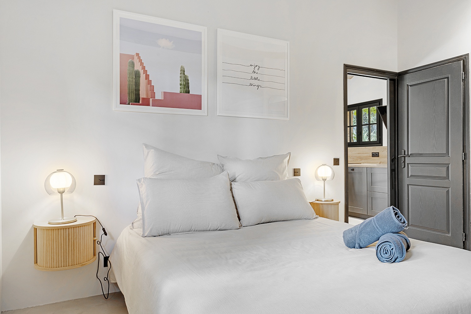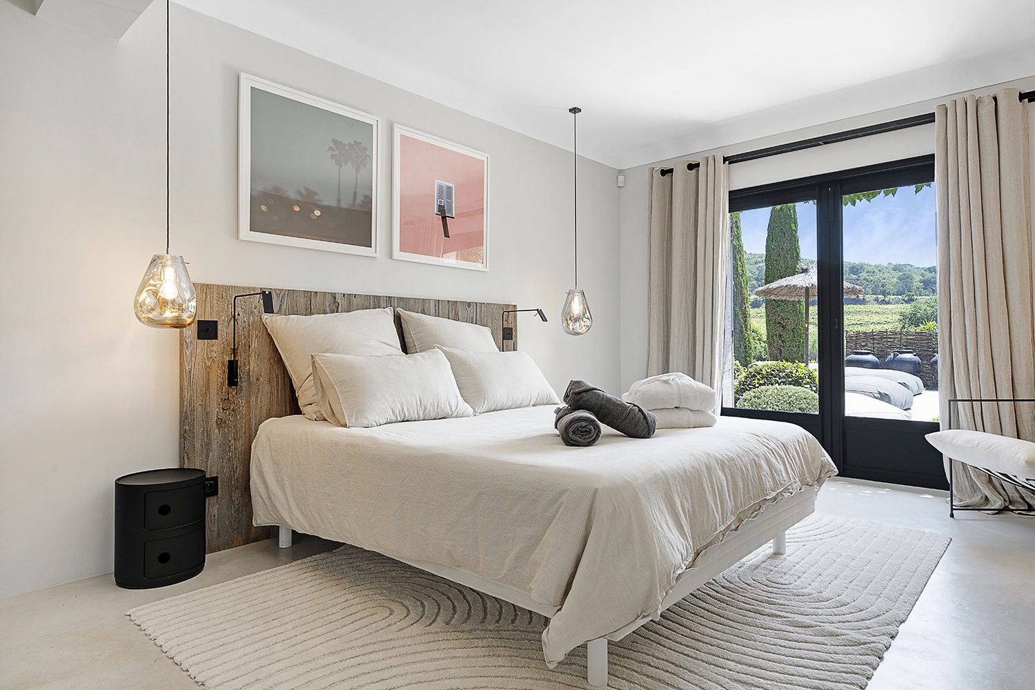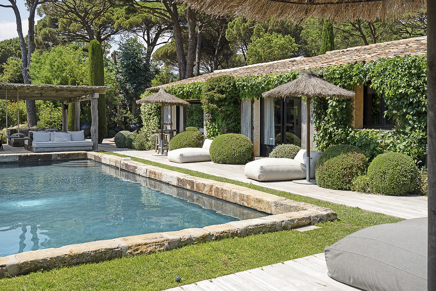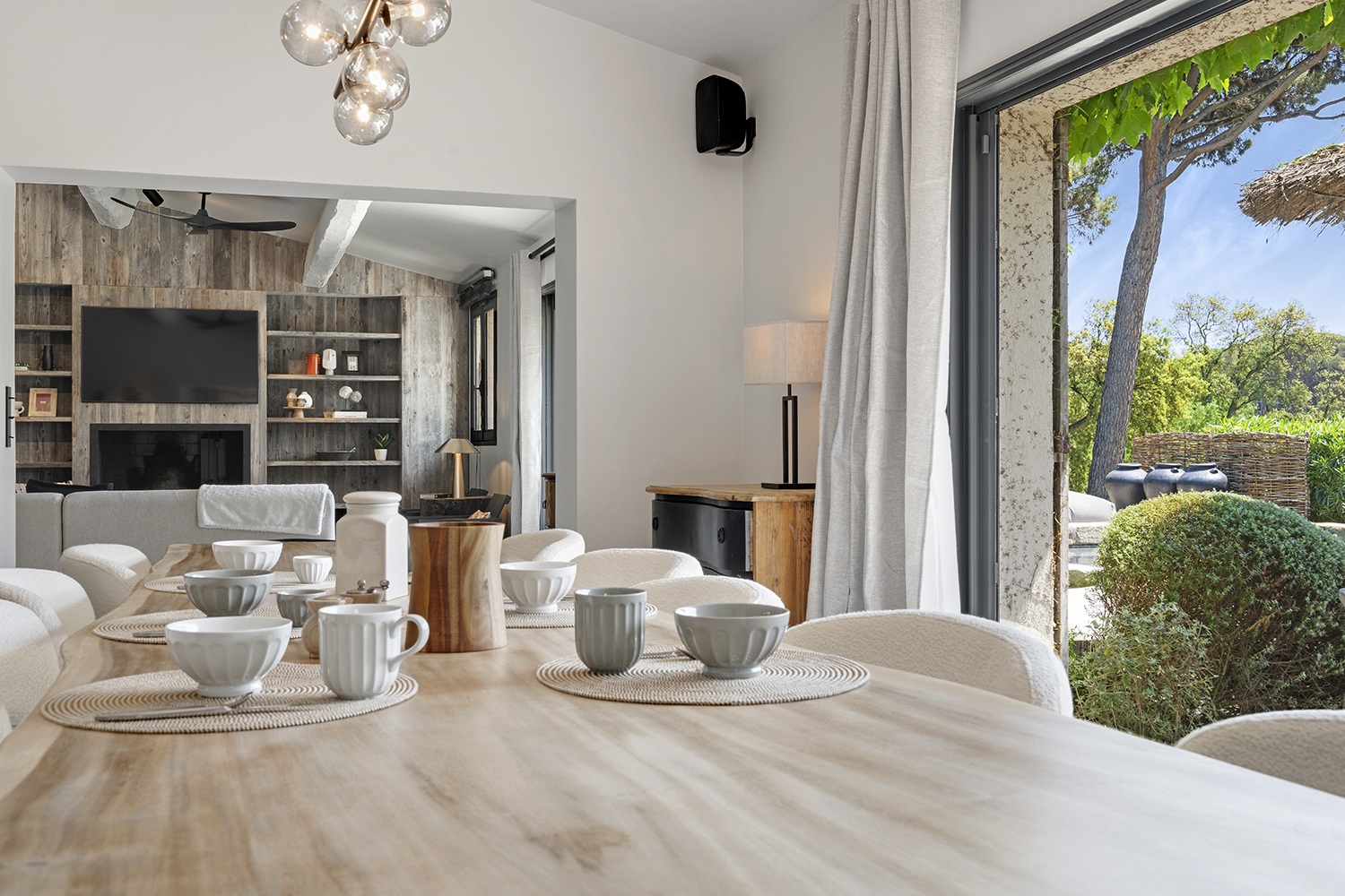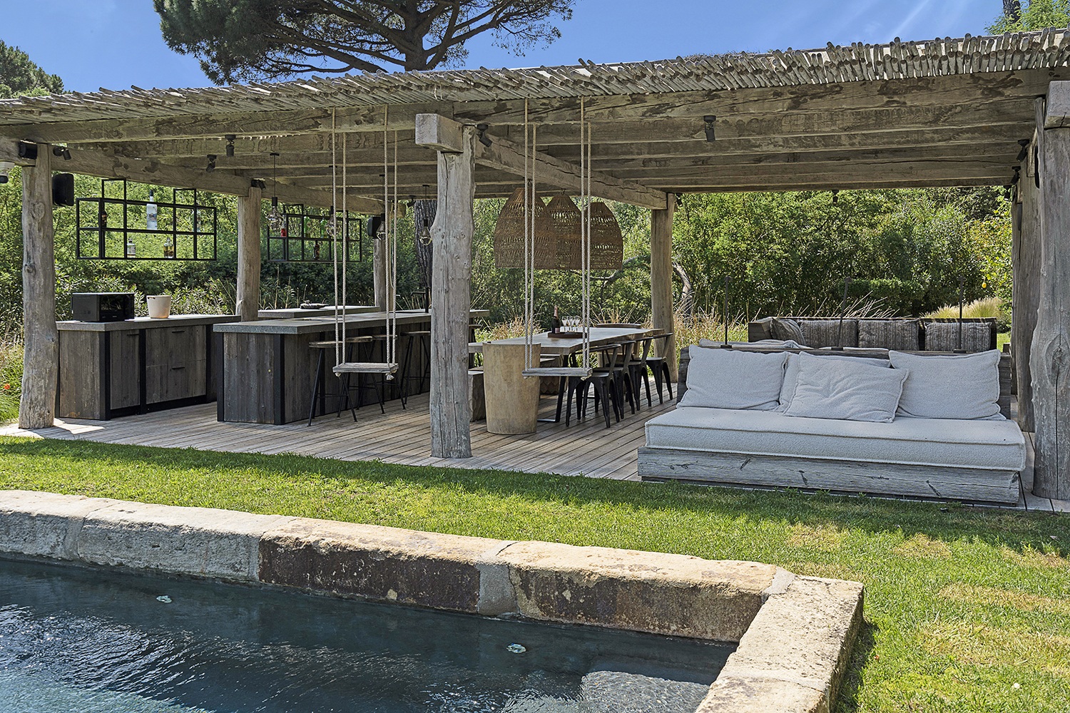 This villa is set in peaceful surroundings where birdsong reigns supreme. Here, Virginia creeper, bougainvillea and jasmine lick the exterior walls, offering a gentle pace of life all year round. Outside, fun and sharing are always the order of the day. In the pool house, with its natural materials, the bar, table, lounge and two swings are set out in the shade of the canisses. The pool house is the focal point of the villa, contributing to the pleasure of days spent around the heated swimming pool and extending the evenings in a warm atmosphere.