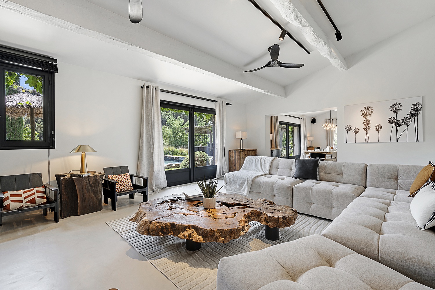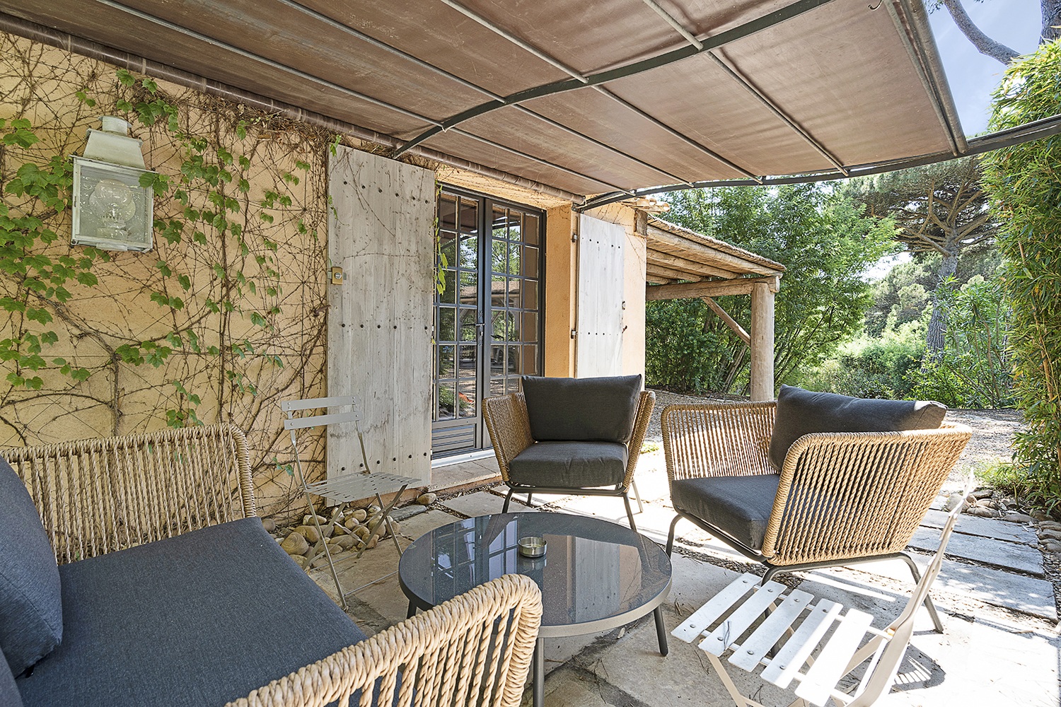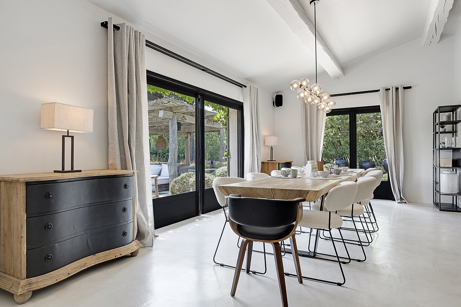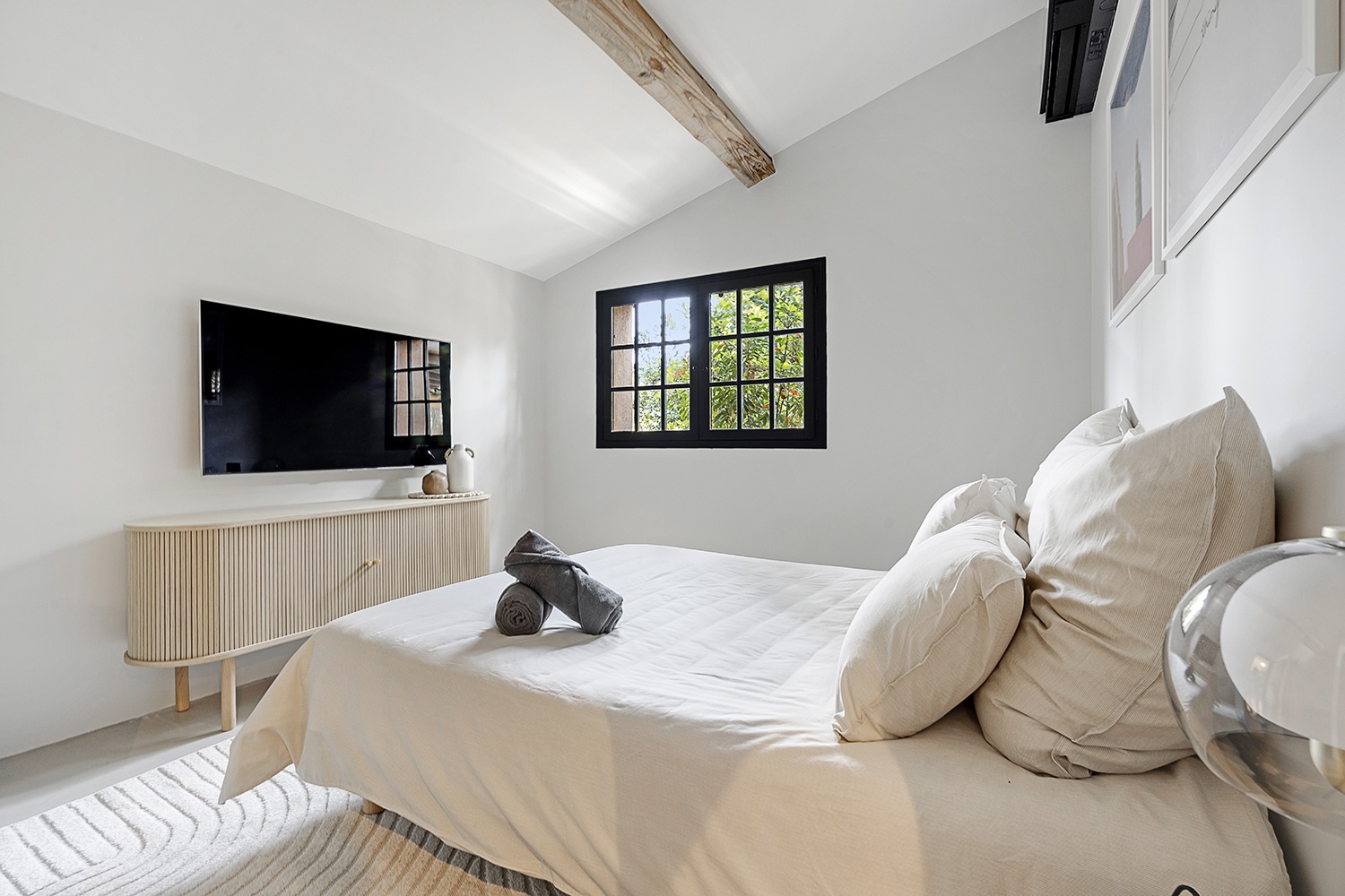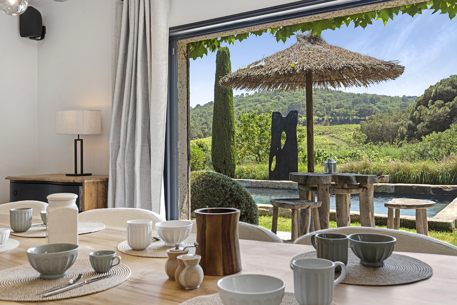 This villa is set in peaceful surroundings where birdsong reigns supreme. Here, Virginia creeper, bougainvillea and jasmine lick the exterior walls, offering a gentle pace of life all year round. Outside, fun and sharing are always the order of the day. In the pool house, with its natural materials, the bar, table, lounge and two swings are set out in the shade of the canisses. The pool house is the focal point of the villa, contributing to the pleasure of days spent around the heated swimming pool and extending the evenings in a warm atmosphere.
