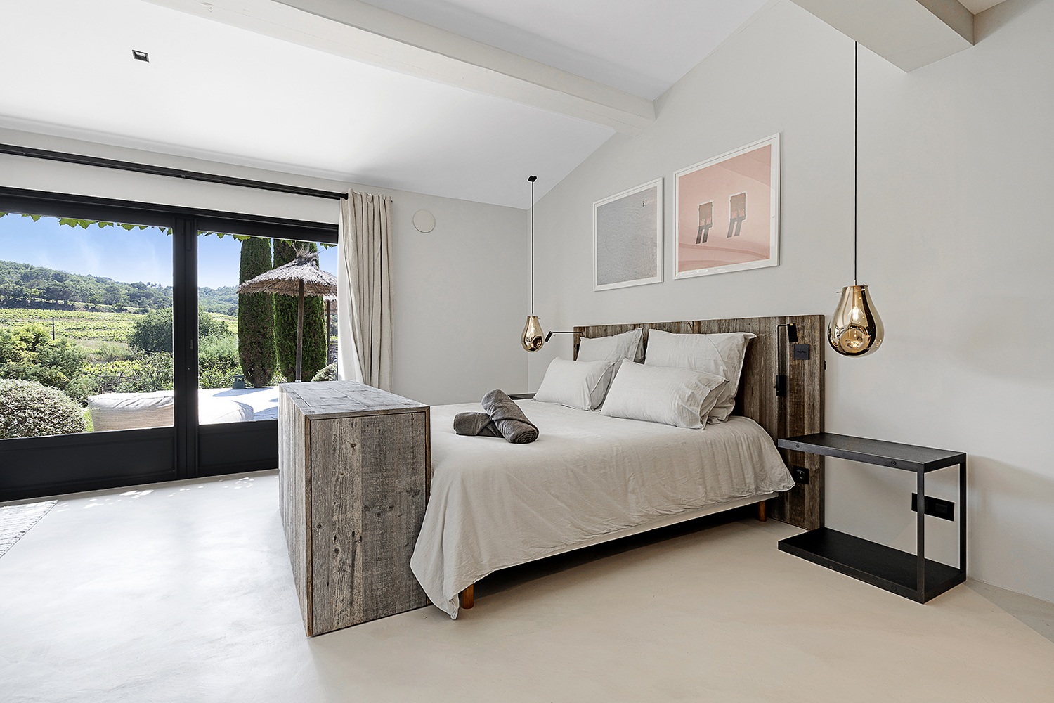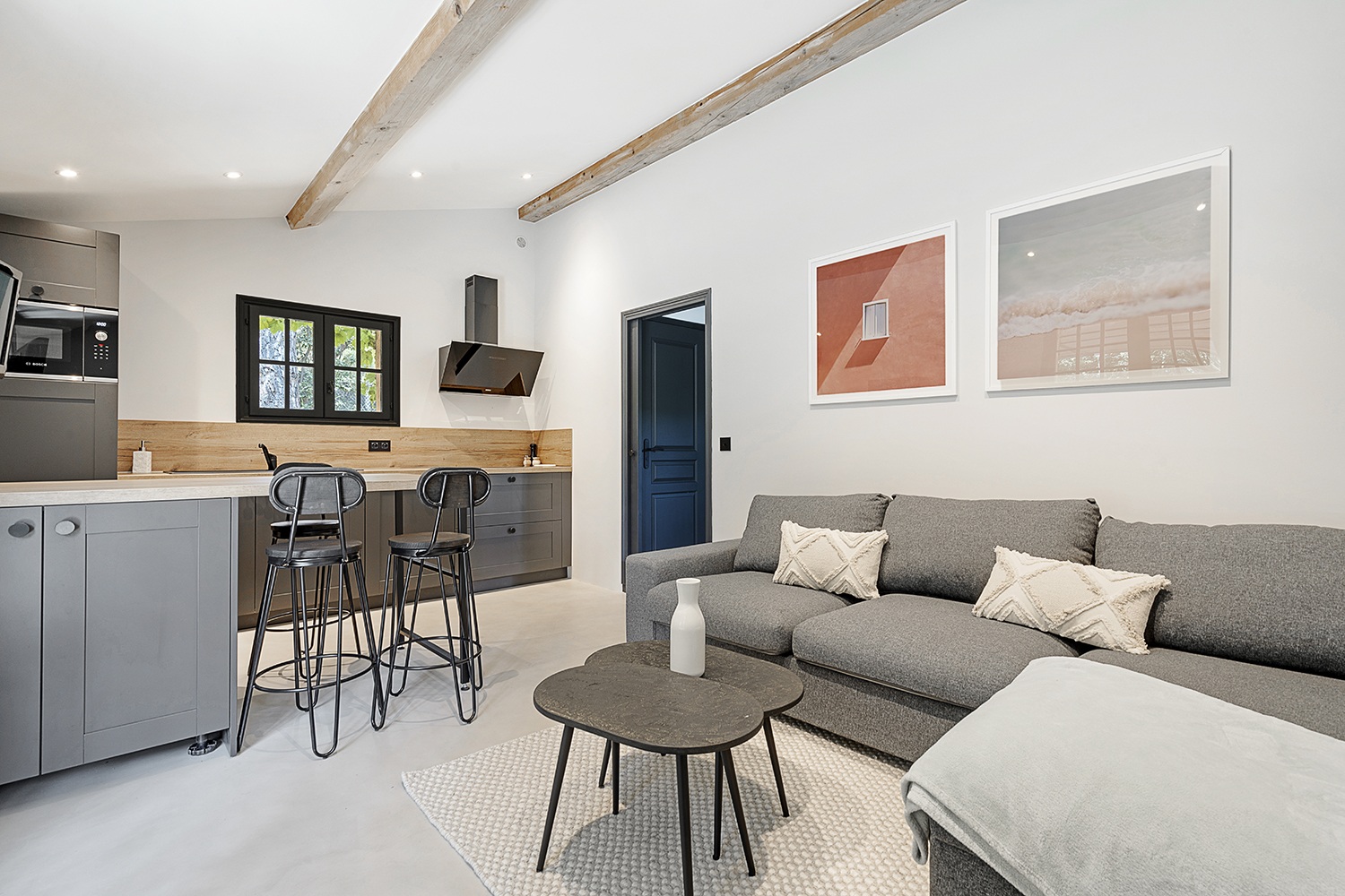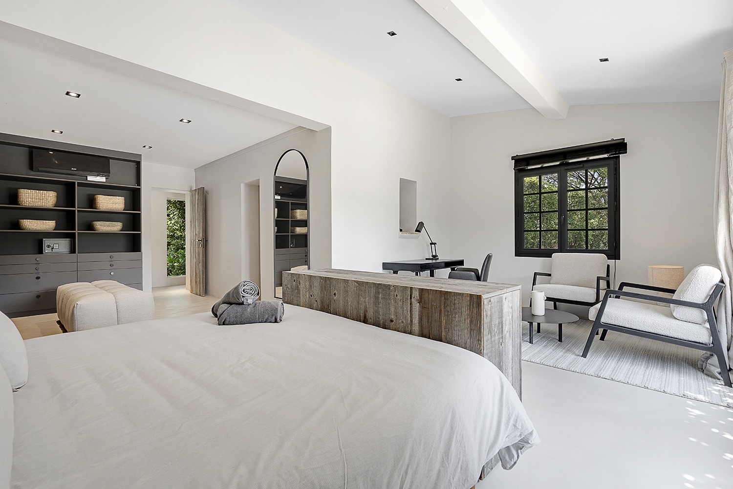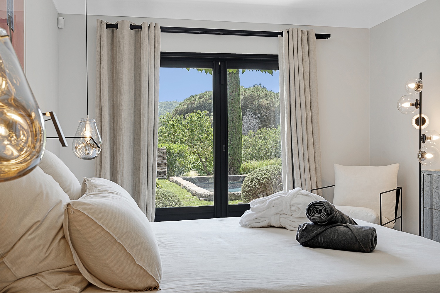 This villa is set in peaceful surroundings where birdsong reigns supreme. Here, Virginia creeper, bougainvillea and jasmine lick the exterior walls, offering a gentle pace of life all year round. Outside, fun and sharing are always the order of the day. In the pool house, with its natural materials, the bar, table, lounge and two swings are set out in the shade of the canisses. The pool house is the focal point of the villa, contributing to the pleasure of days spent around the heated swimming pool and extending the evenings in a warm atmosphere.