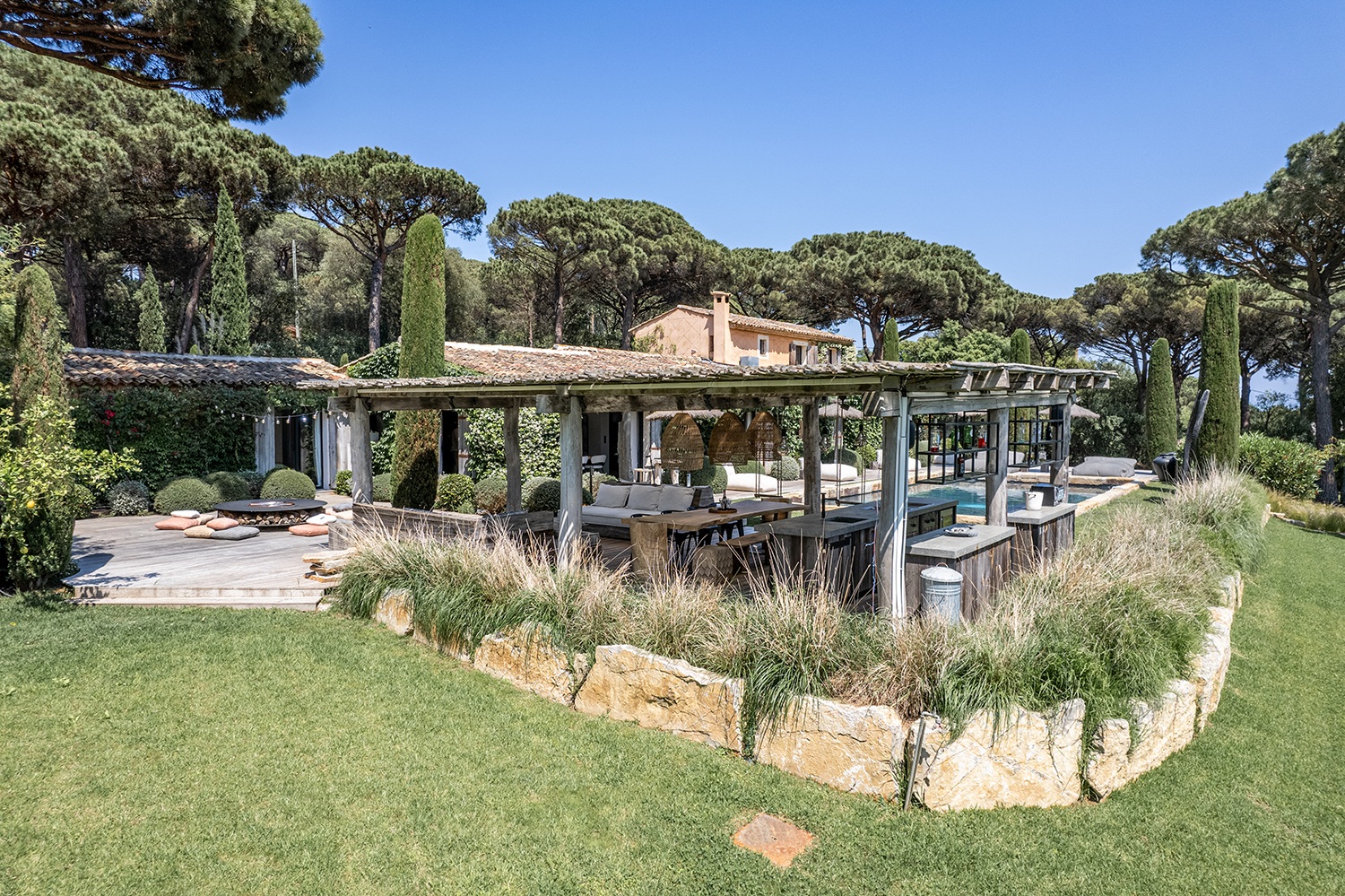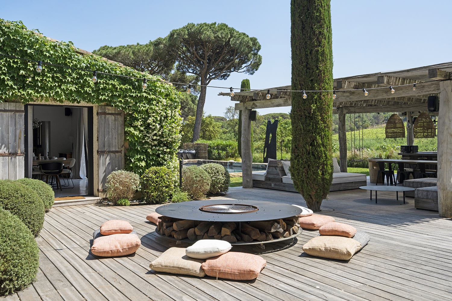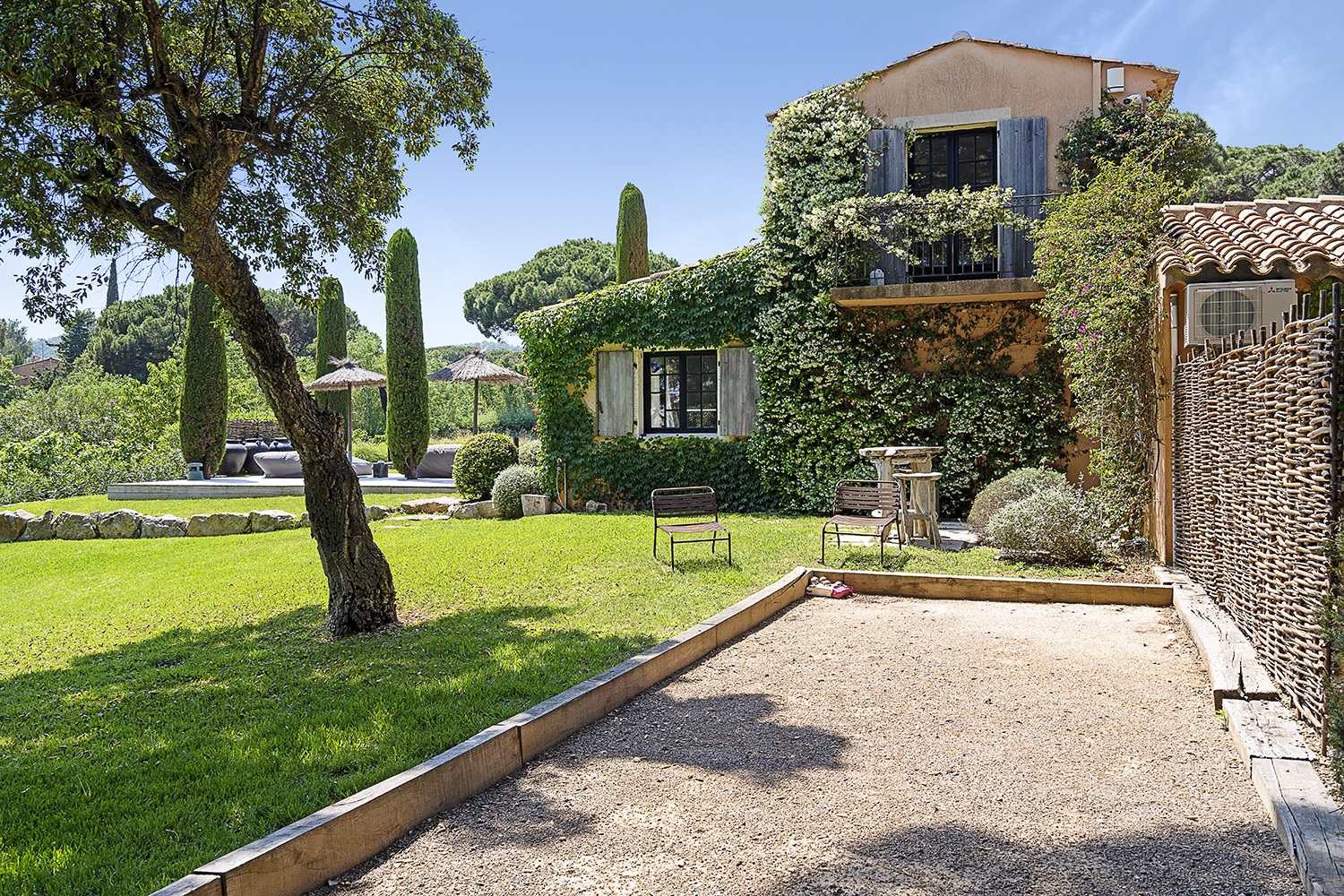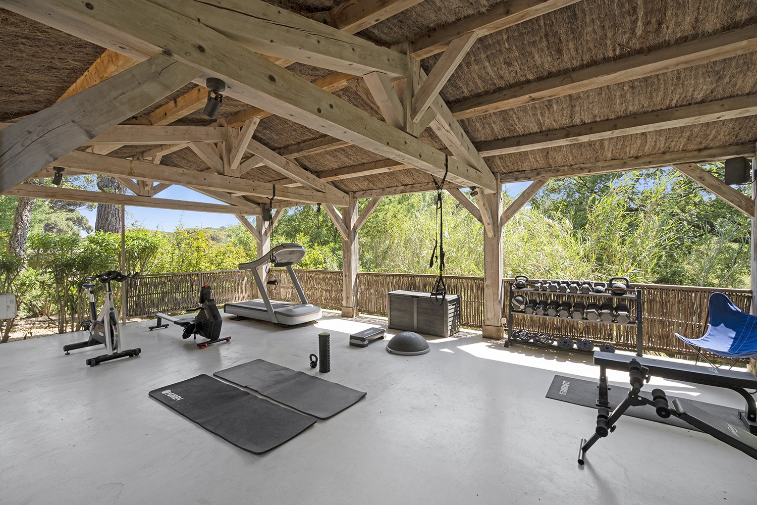 In the same spirit, between the villa and its pool house, a fire pit and cushions on the ground are ideal for convivial evenings around the barbecue. The pétanque court provides an intergenerational playground for the end of days in Ramatuelle. An open-air fitness area completes the range of outdoor entertainment and wellness facilities.