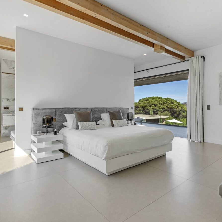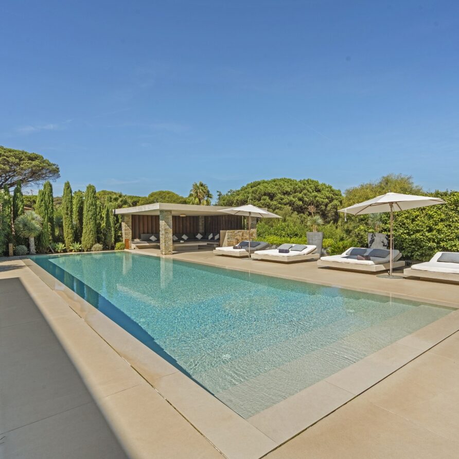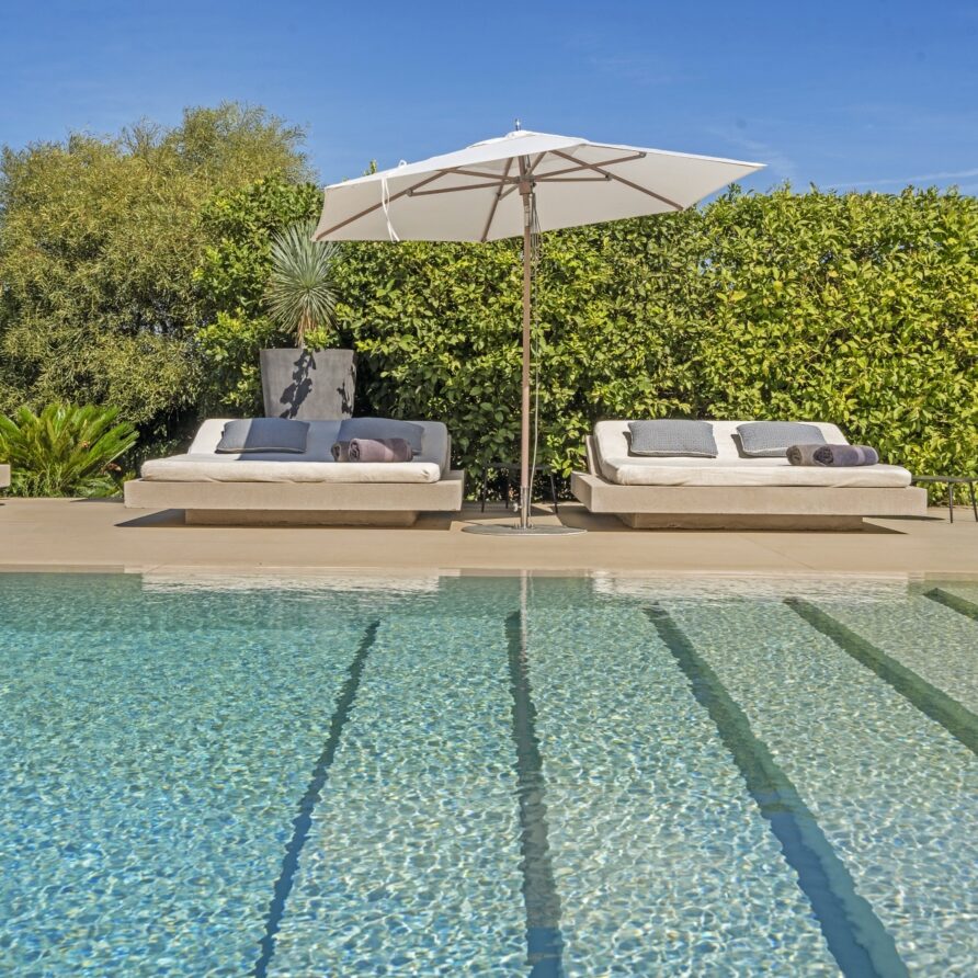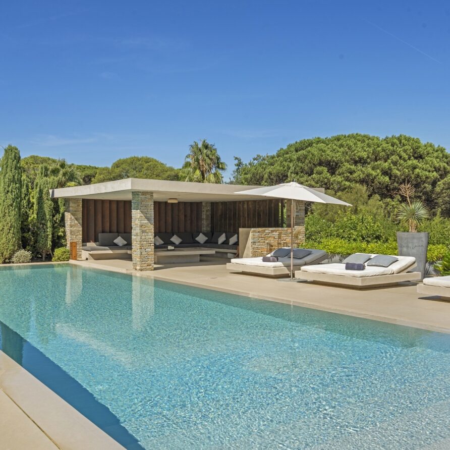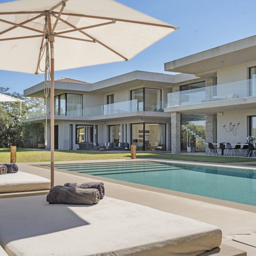 A quiet, sunlit scene of a luxury Villa stretches along the edge of a pale turquoise pool, its clean geometric lines softened by warm stone and glass. The villa offers five bedrooms, each with its own private bathroom, comfortably accommodating up to twelve guests. The clean and immaculate lines in which the bedrooms are arranged invite you to complete relaxation after a long and sunny day at the pool. They are very spacious, with a view of the pool and a sea of ​​greenery, and the bathrooms decorated with a modern touch make you want nothing more.