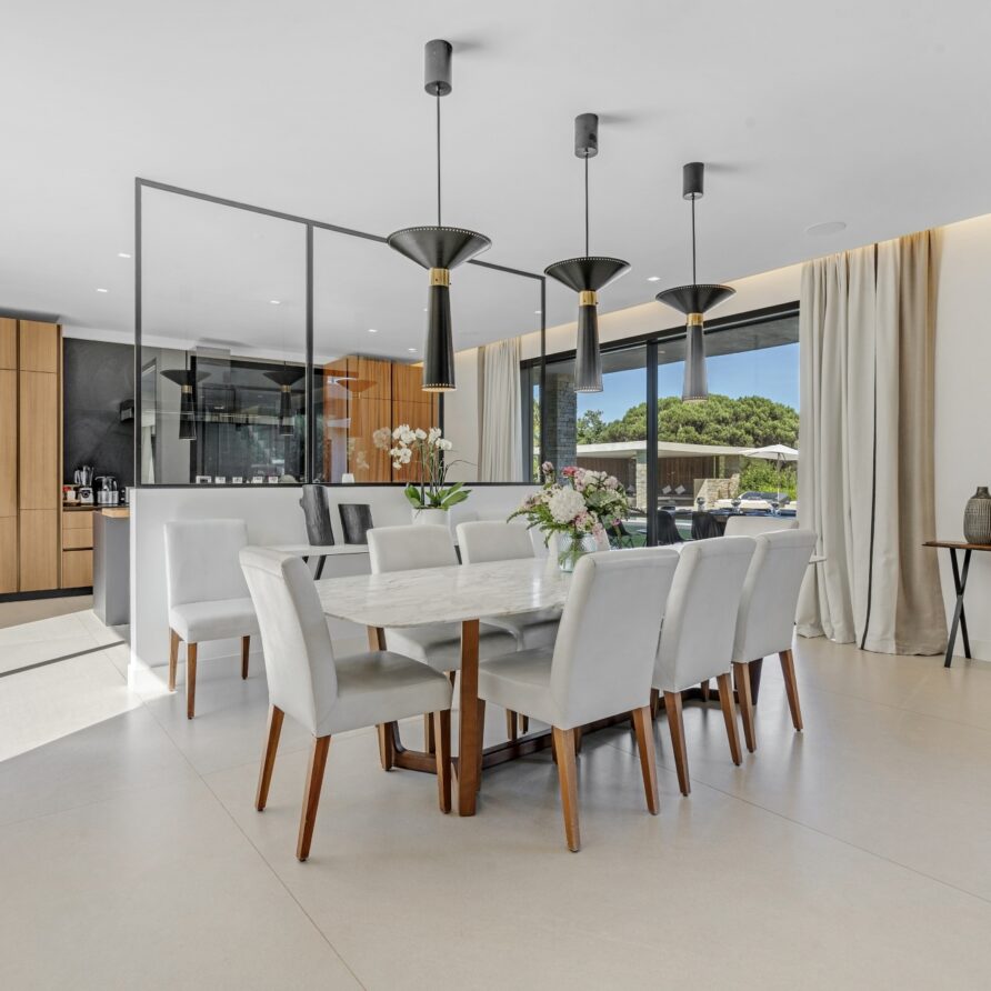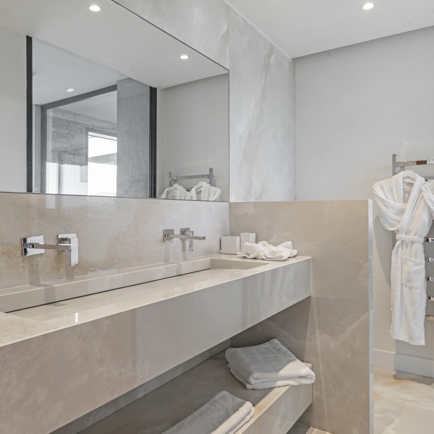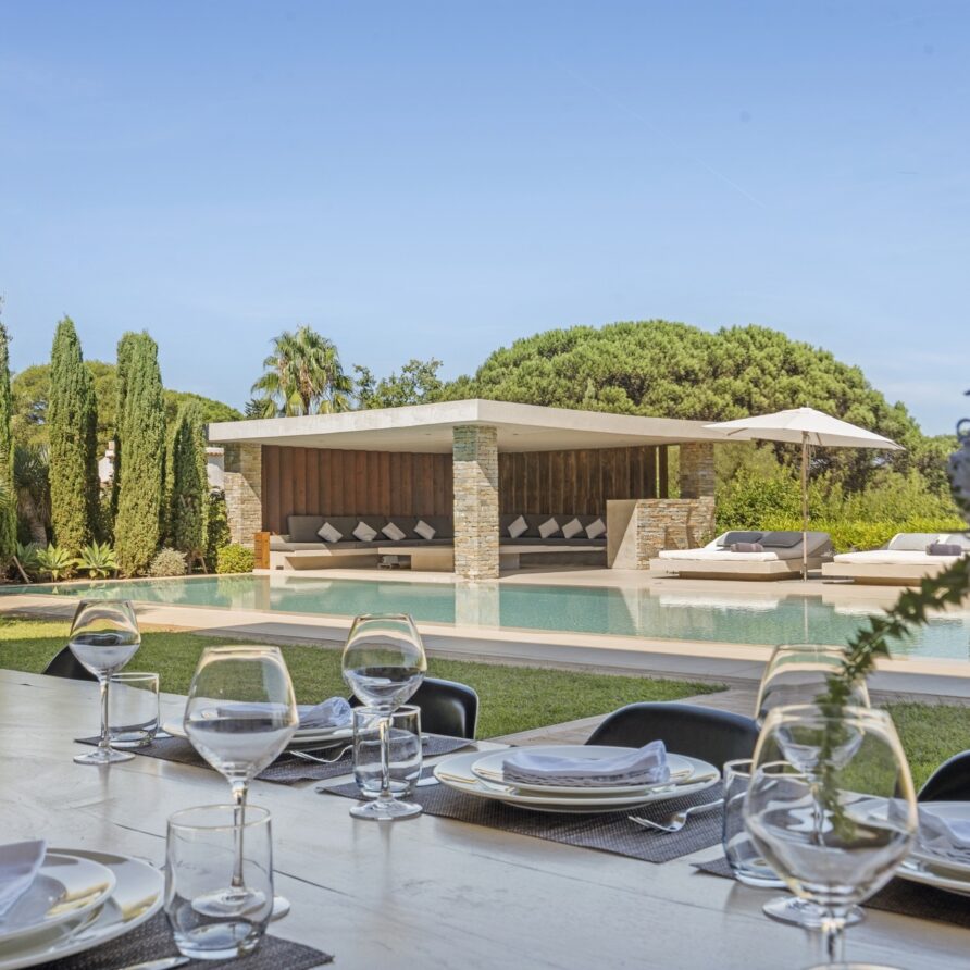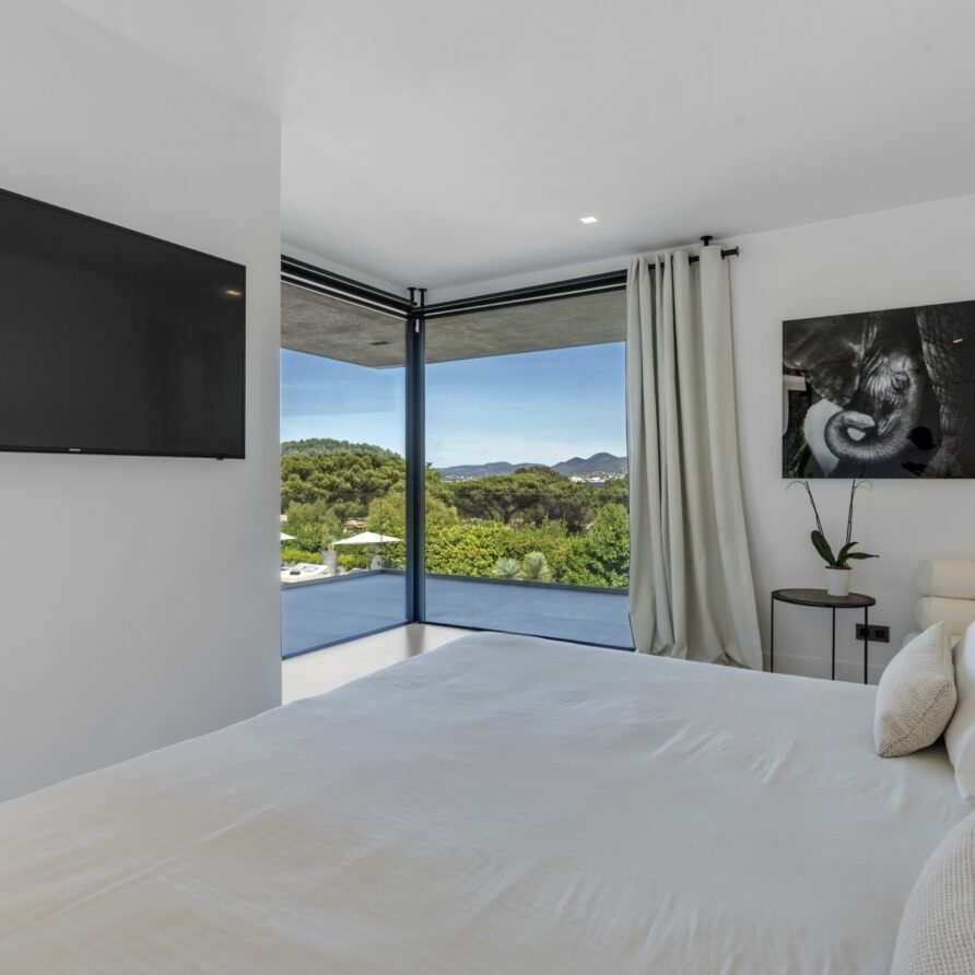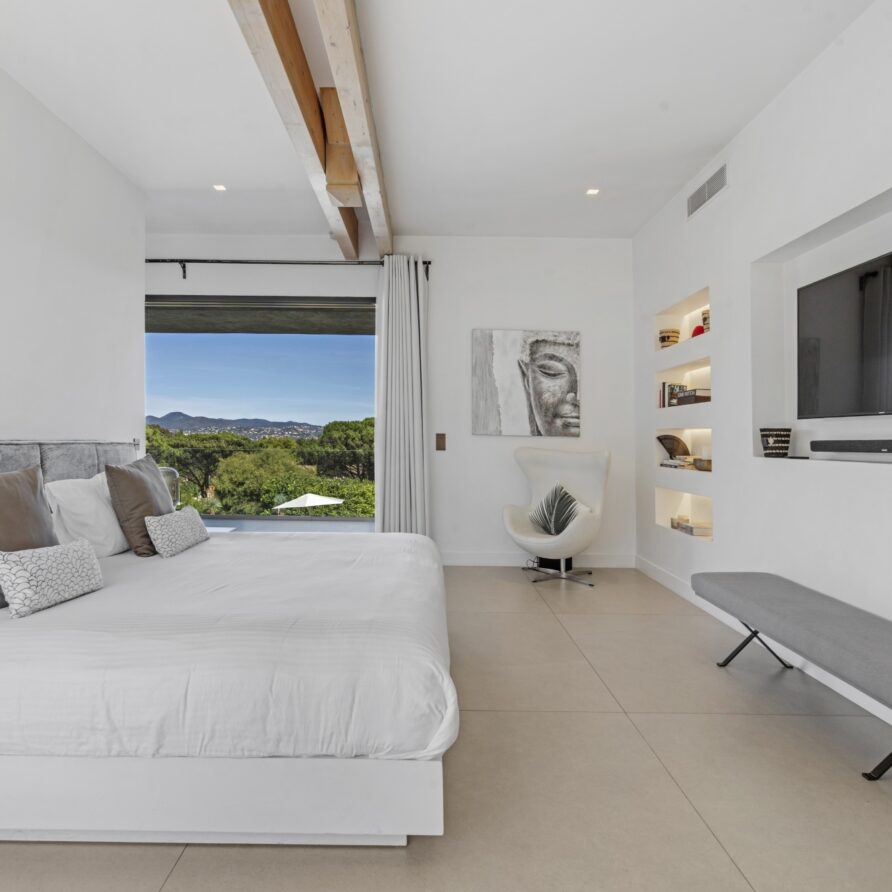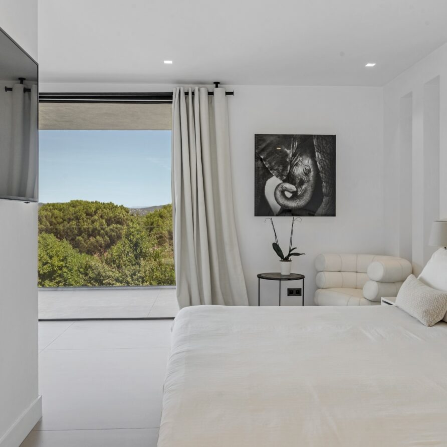 A quiet, sunlit scene of a luxury Villa stretches along the edge of a pale turquoise pool, its clean geometric lines softened by warm stone and glass. The villa offers five bedrooms, each with its own private bathroom, comfortably accommodating up to twelve guests. The clean and immaculate lines in which the bedrooms are arranged invite you to complete relaxation after a long and sunny day at the pool. They are very spacious, with a view of the pool and a sea of ​​greenery, and the bathrooms decorated with a modern touch make you want nothing more.