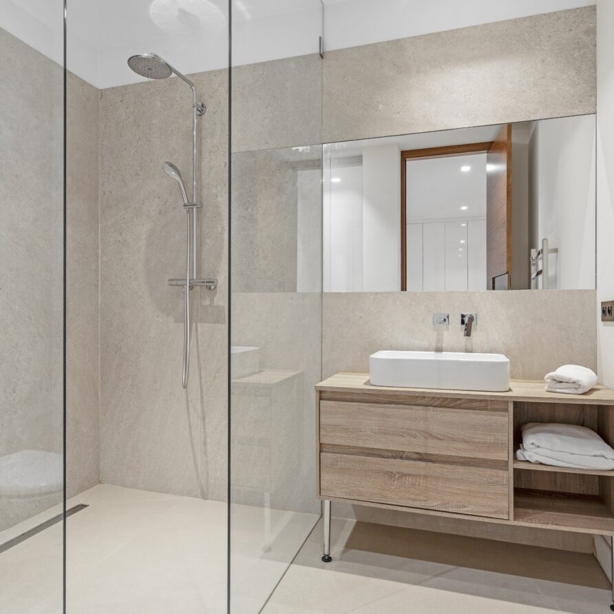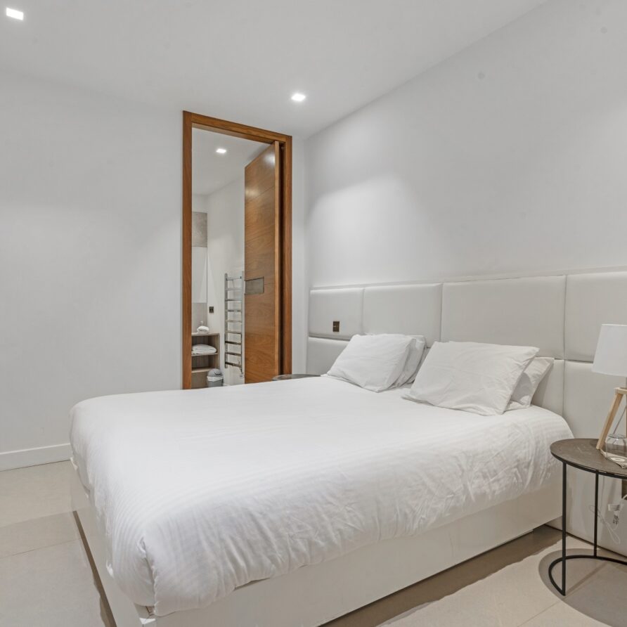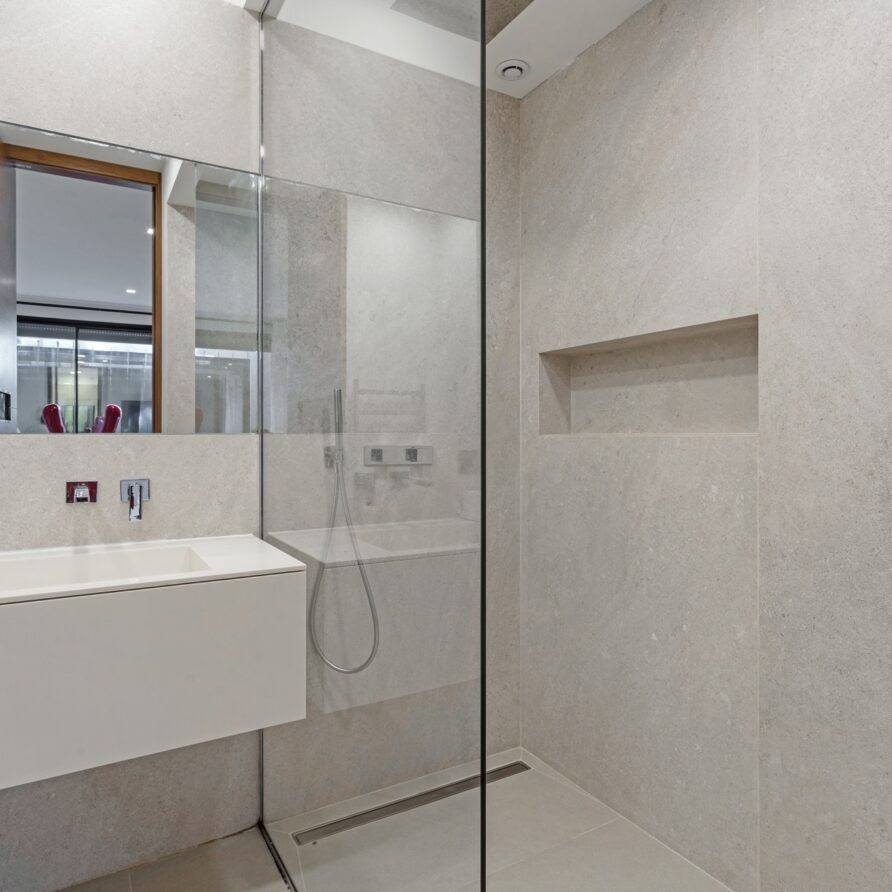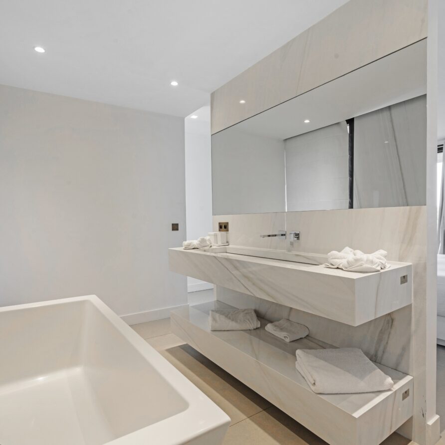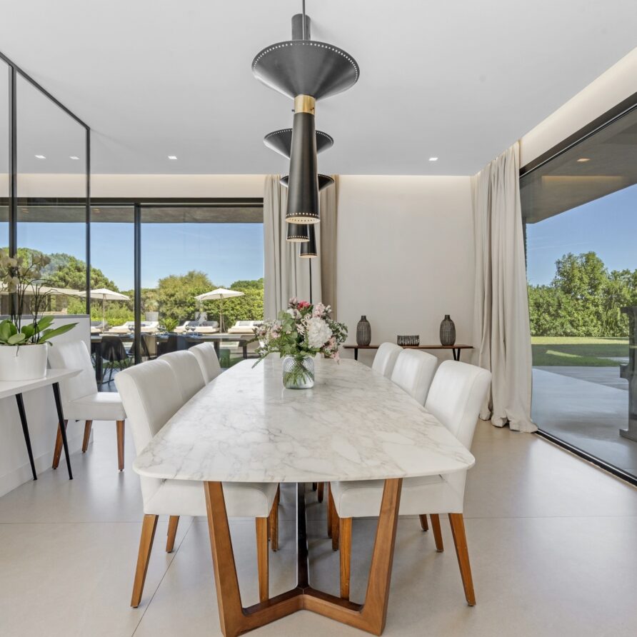 A quiet, sunlit scene of a luxury Villa stretches along the edge of a pale turquoise pool, its clean geometric lines softened by warm stone and glass. The villa offers five bedrooms, each with its own private bathroom, comfortably accommodating up to twelve guests. The clean and immaculate lines in which the bedrooms are arranged invite you to complete relaxation after a long and sunny day at the pool. They are very spacious, with a view of the pool and a sea of ​​greenery, and the bathrooms decorated with a modern touch make you want nothing more.