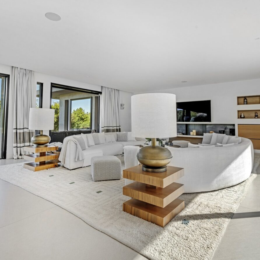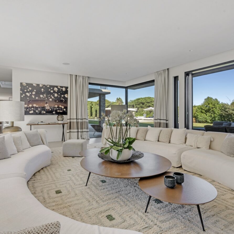 Large picture windows on two sides flood the space with daylight and frame a tranquil, green landscape outside, visually extending the room into the garden and reinforcing the room’s light, open feel. Slim black frames and simple drapery keep the window treatments understated so the view remains the star. The overall effect is serene and social at once—a thoughtfully curated space that feels both luxurious and very livable.