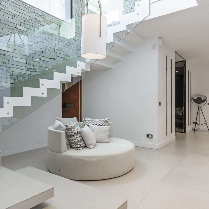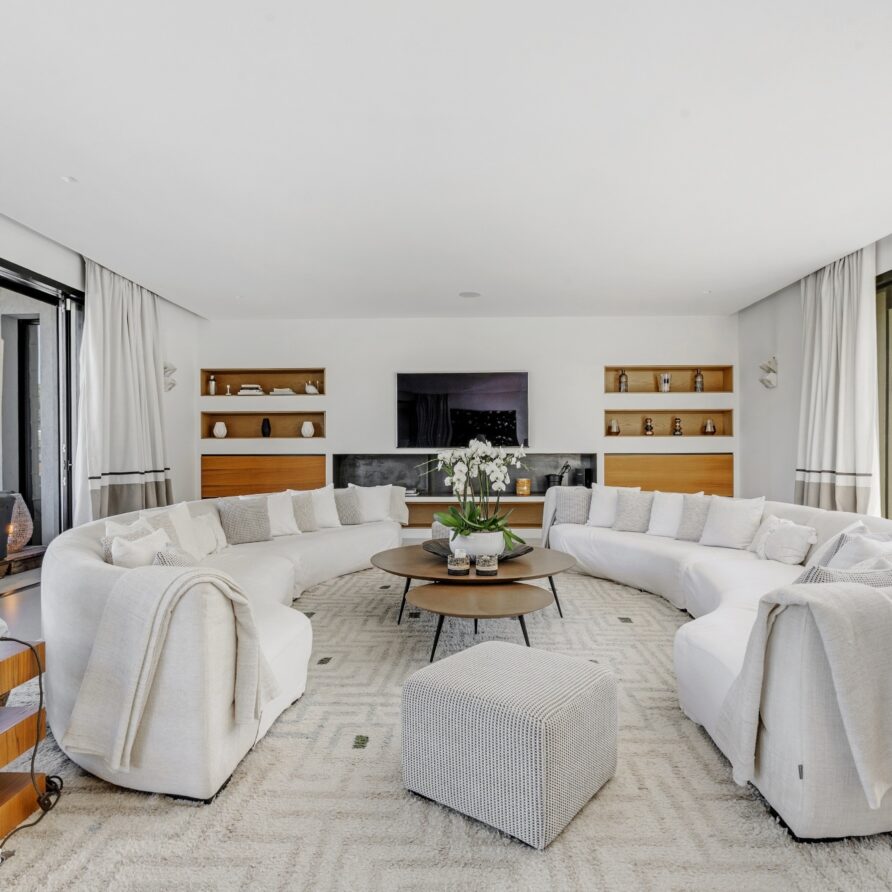 On the ground floor, a covered patio with simple outdoor furniture and potted plants forms an inviting outdoor living room. A calm, airy living room unfolds in soft, neutral tones. A low, curved sectional in a creamy linen hugs the room’s center, forming an embracing crescent that invites conversation and lingering.