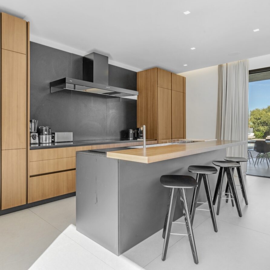 Sunlight pours through a wide sliding glass wall, opening the kitchen onto an airy patio and a swath of green beyond. Inside, the room feels composed and calm: floor-to-ceiling natural wood cabinets line one wall with flush, minimalist fronts, their warm grain contrasting with a deep slate backsplash behind the cooktop. A stainless-steel range hood and matching appliances add a cool, industrial edge that balances the wood’s warmth, while in the center, a streamlined island anchors the space — a soft gray base topped with a lighter wooden counter that extends slightly as a casual breakfast bar.