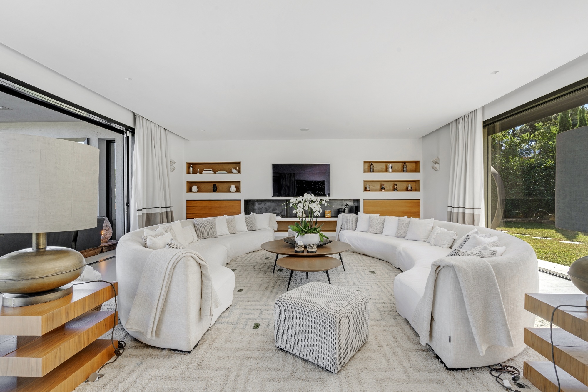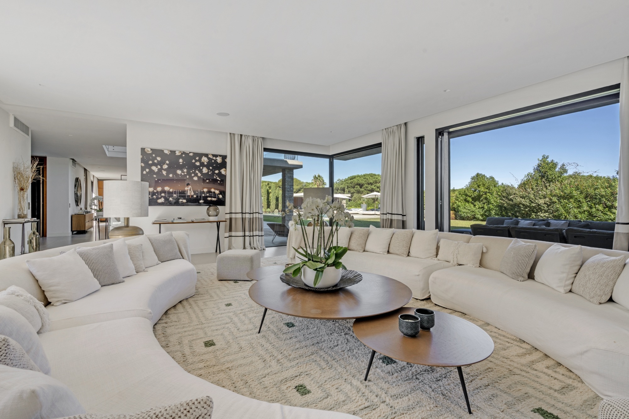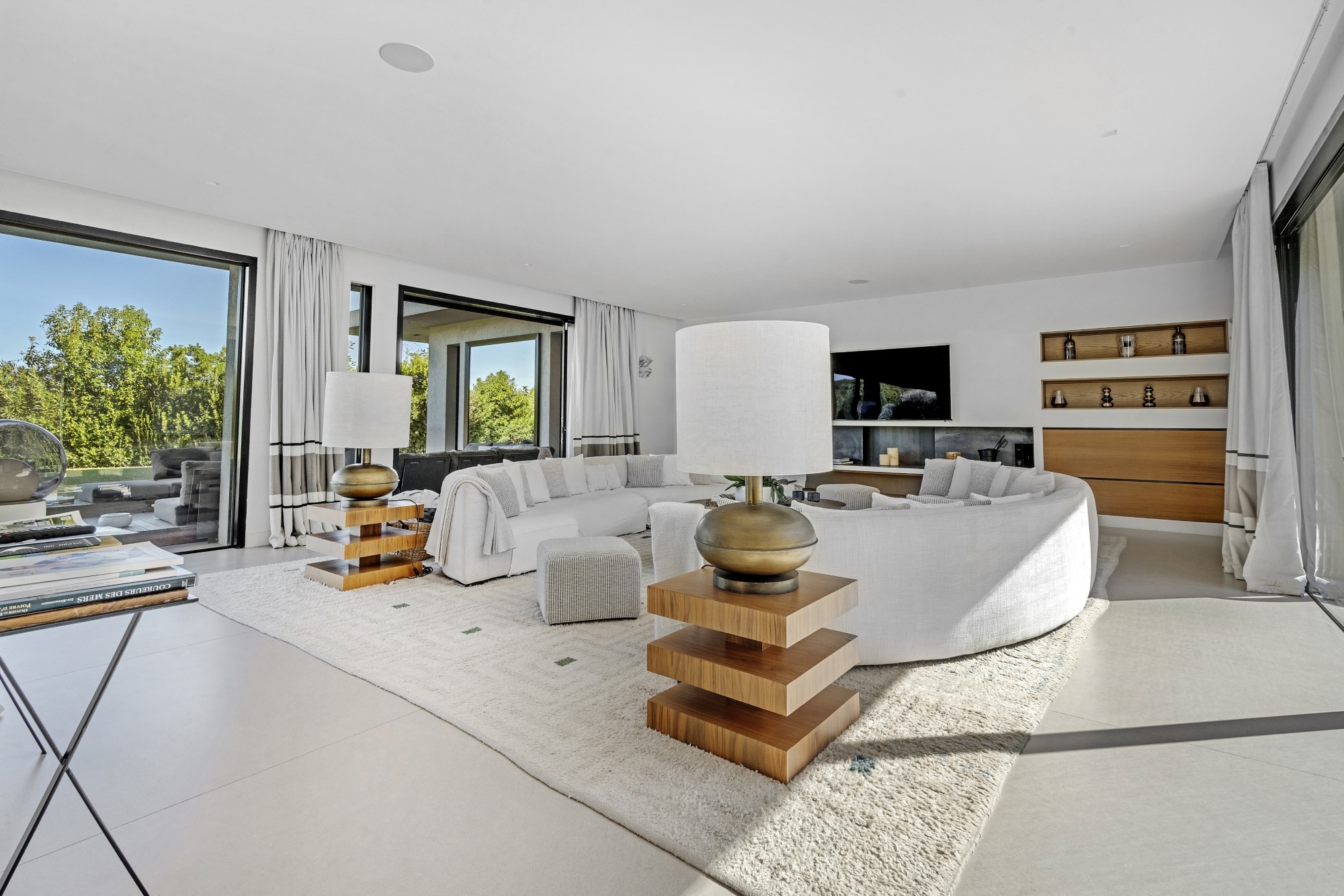 Large picture windows on two sides flood the space with daylight and frame a tranquil, green landscape outside, visually extending the room into the garden and reinforcing the room’s light, open feel. Slim black frames and simple drapery keep the window treatments understated so the view remains the star. The overall effect is serene and social at once—a thoughtfully curated space that feels both luxurious and very livable.