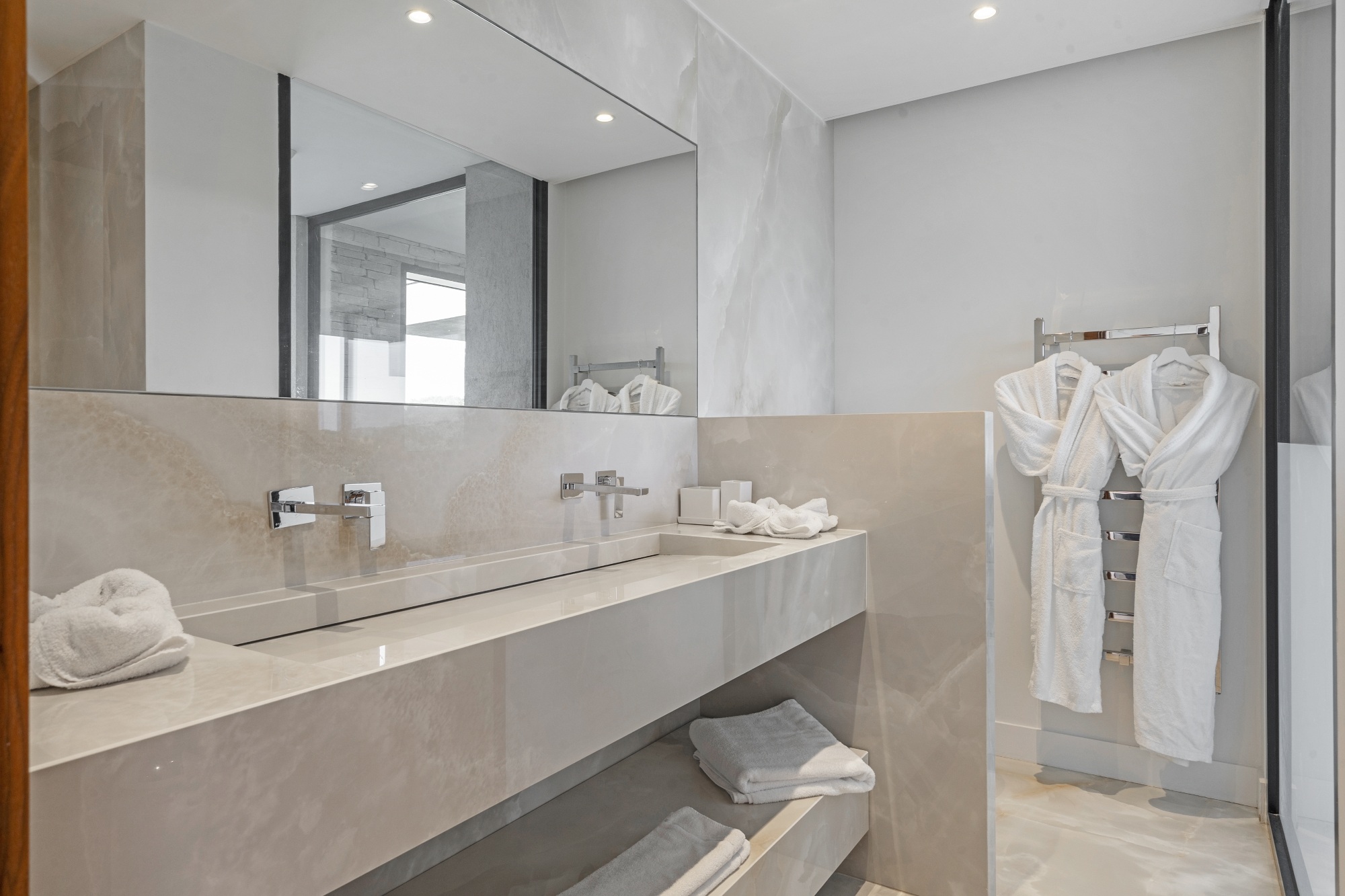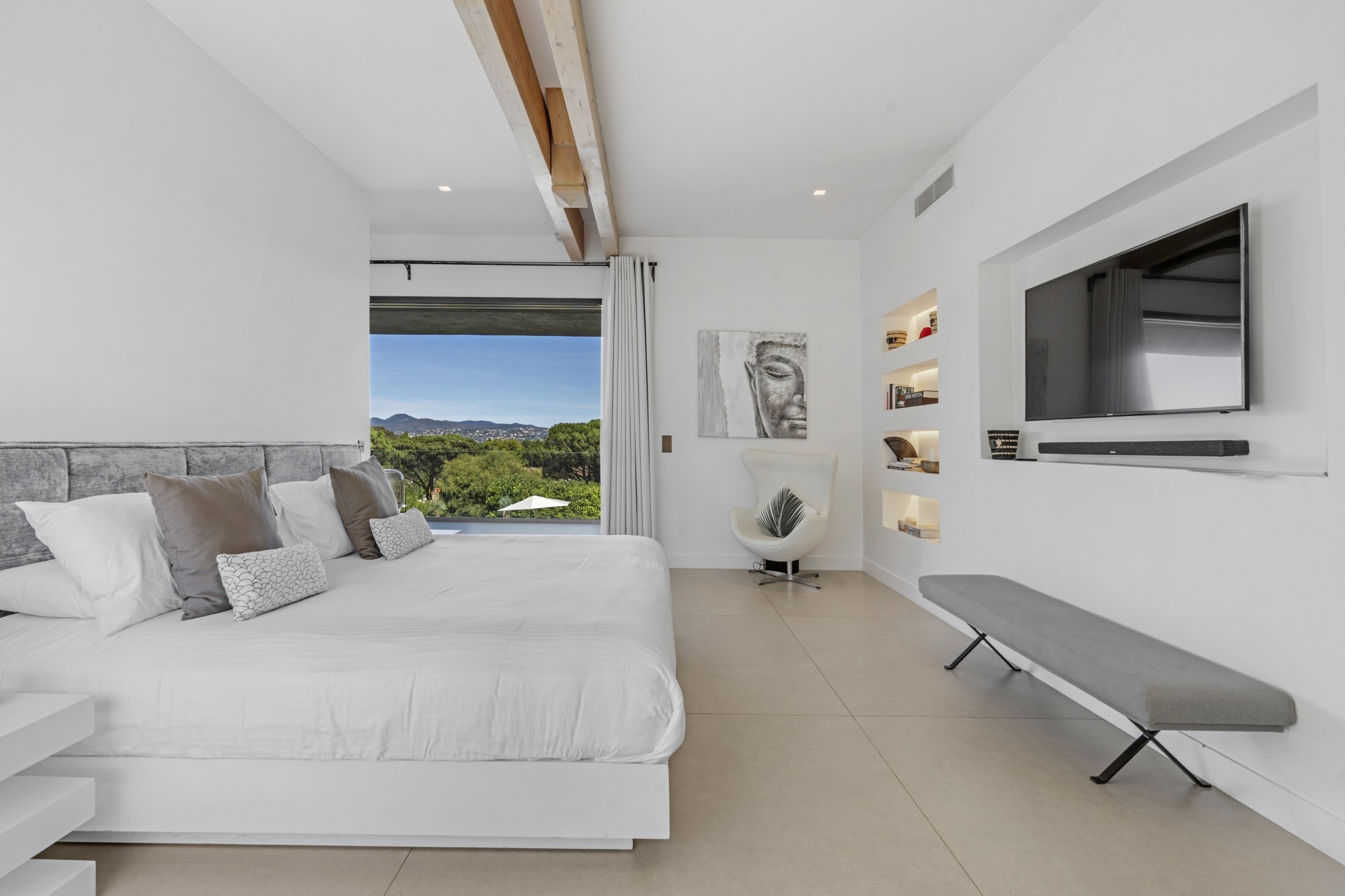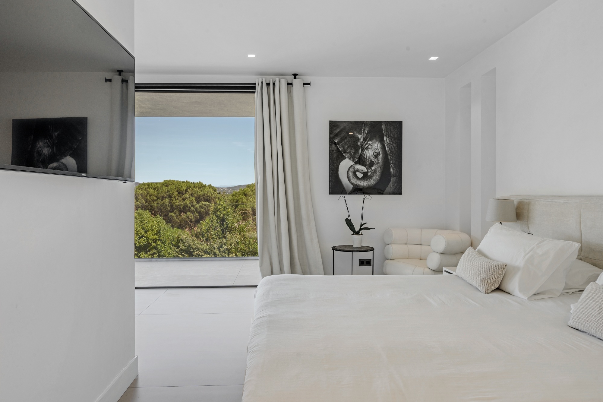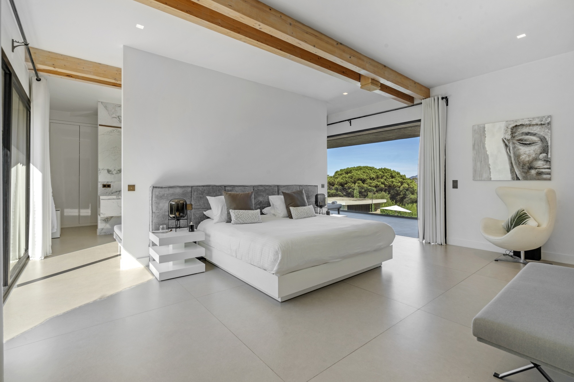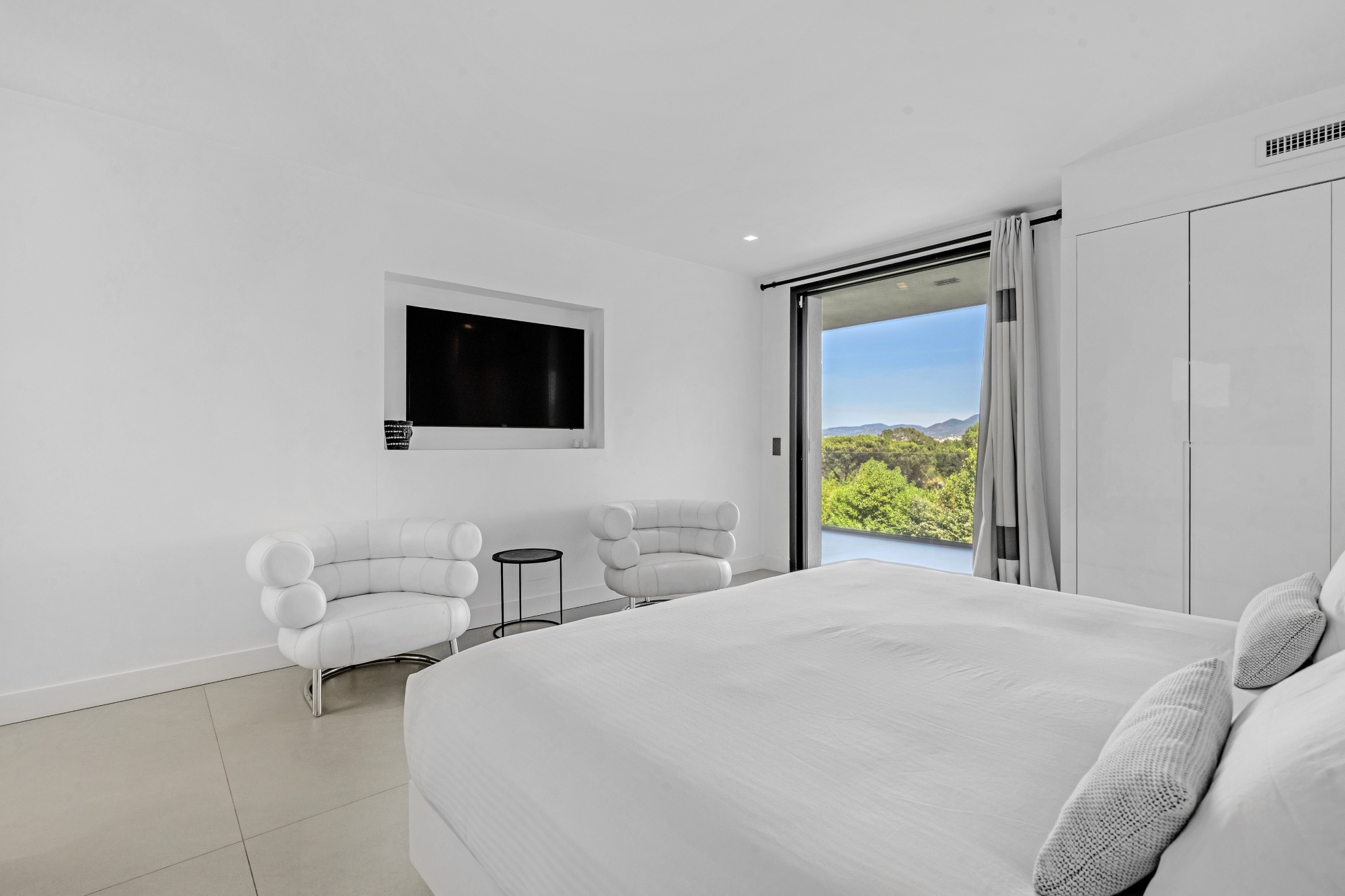 A quiet, sunlit scene of a luxury Villa stretches along the edge of a pale turquoise pool, its clean geometric lines softened by warm stone and glass. The villa offers five bedrooms, each with its own private bathroom, comfortably accommodating up to twelve guests. The clean and immaculate lines in which the bedrooms are arranged invite you to complete relaxation after a long and sunny day at the pool. They are very spacious, with a view of the pool and a sea of ​​greenery, and the bathrooms decorated with a modern touch make you want nothing more.