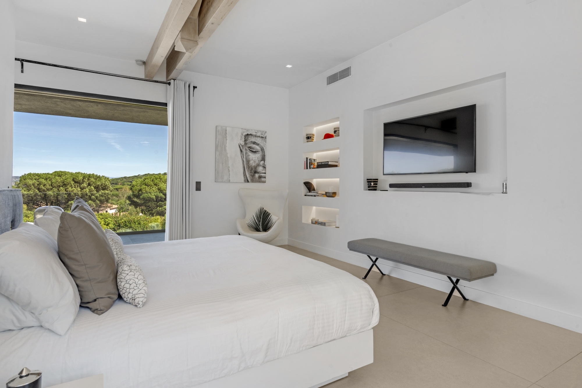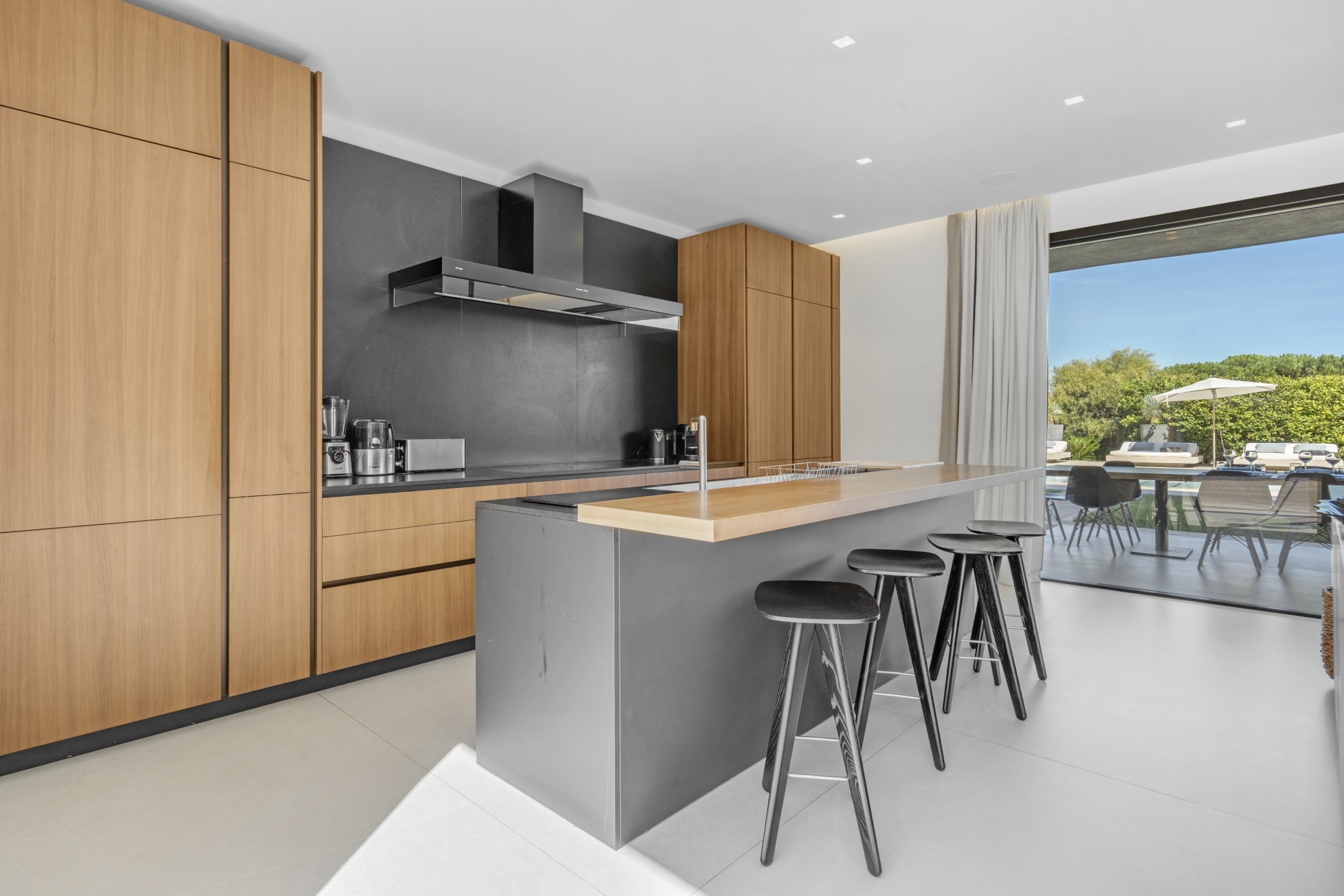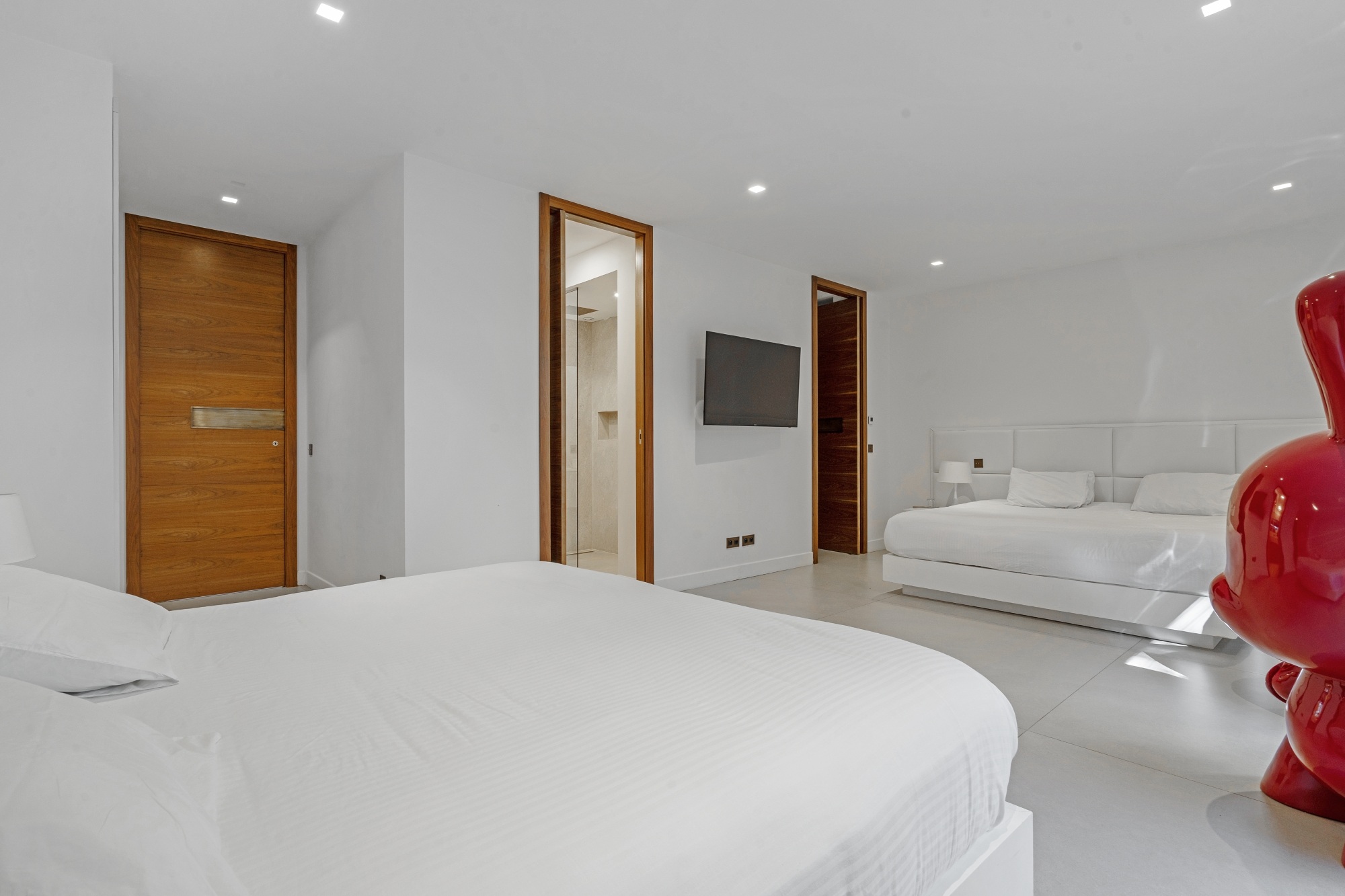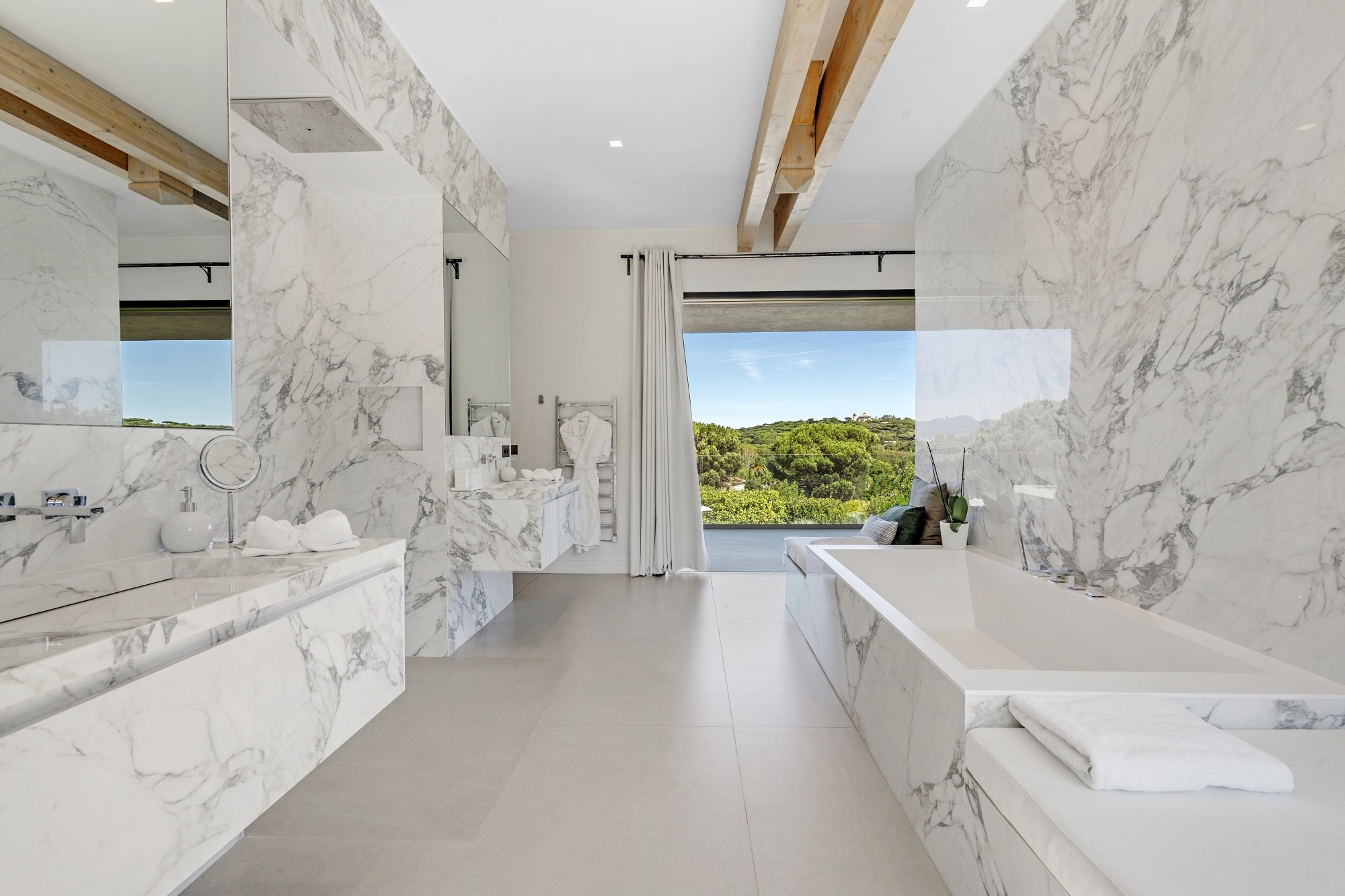 A quiet, sunlit scene of a luxury Villa stretches along the edge of a pale turquoise pool, its clean geometric lines softened by warm stone and glass. The villa offers five bedrooms, each with its own private bathroom, comfortably accommodating up to twelve guests. The clean and immaculate lines in which the bedrooms are arranged invite you to complete relaxation after a long and sunny day at the pool. They are very spacious, with a view of the pool and a sea of ​​greenery, and the bathrooms decorated with a modern touch make you want nothing more.