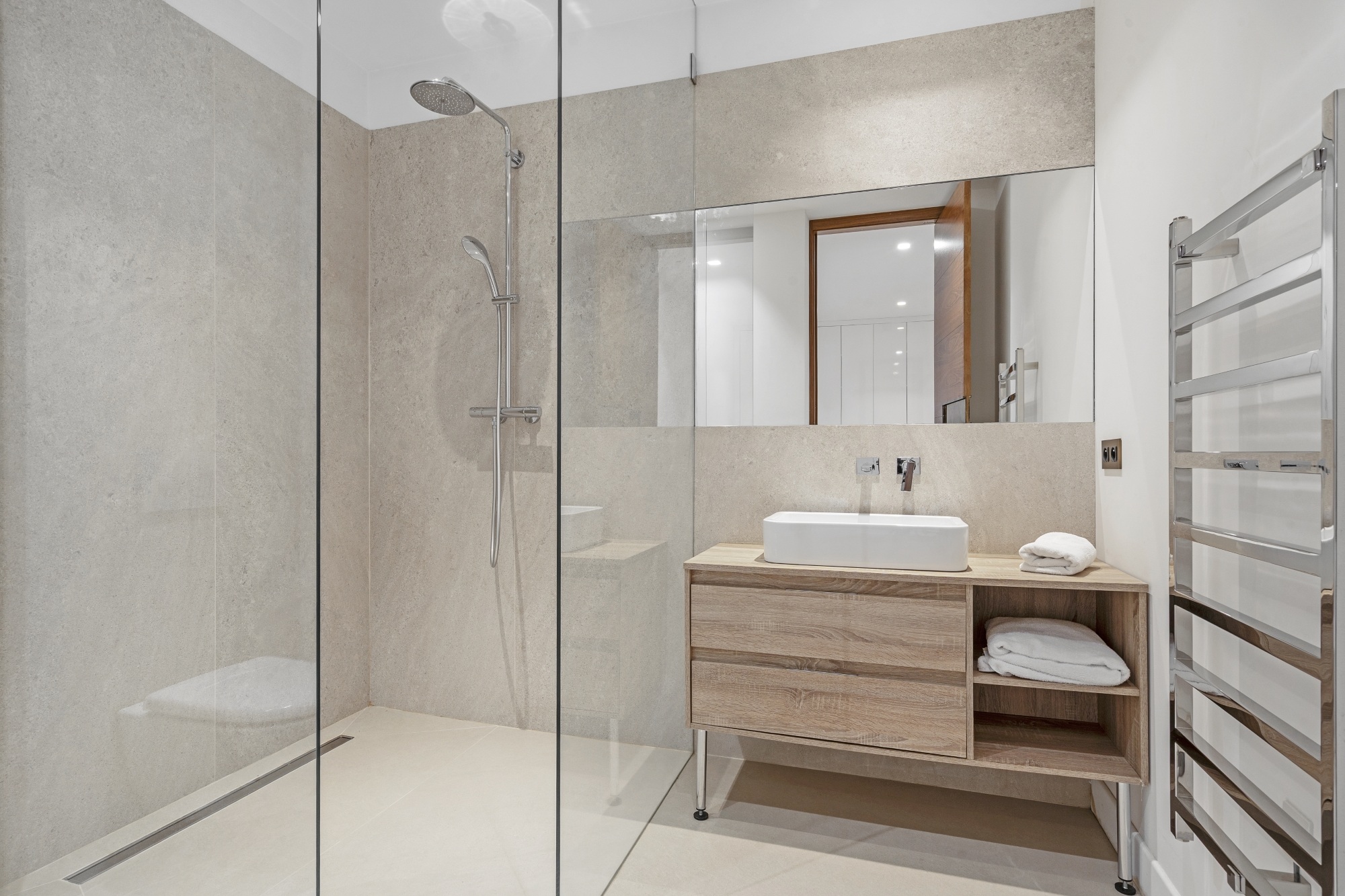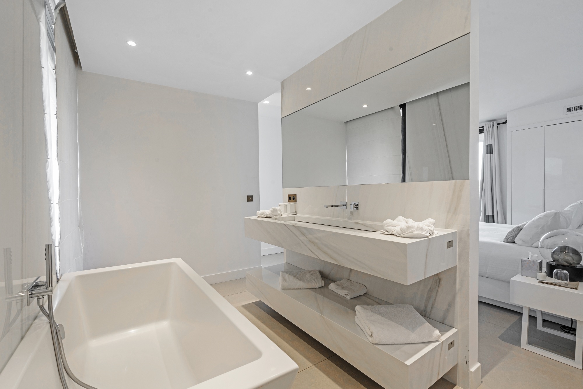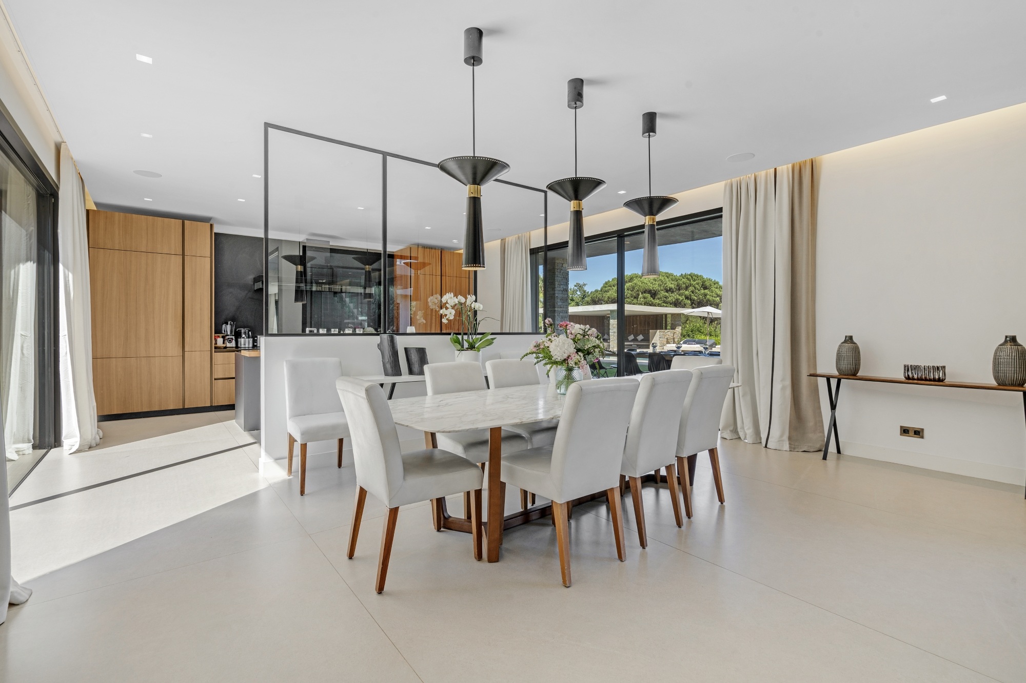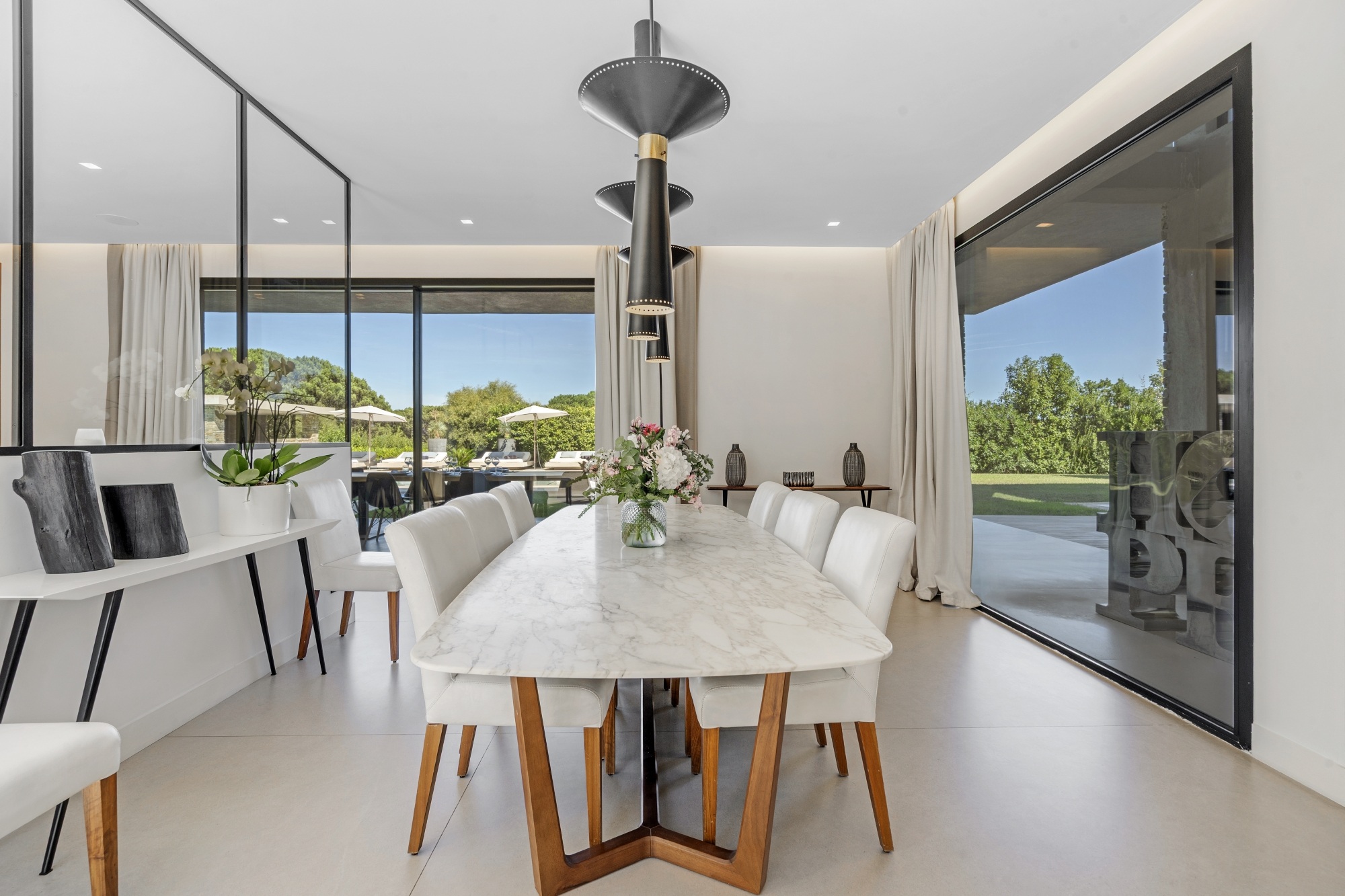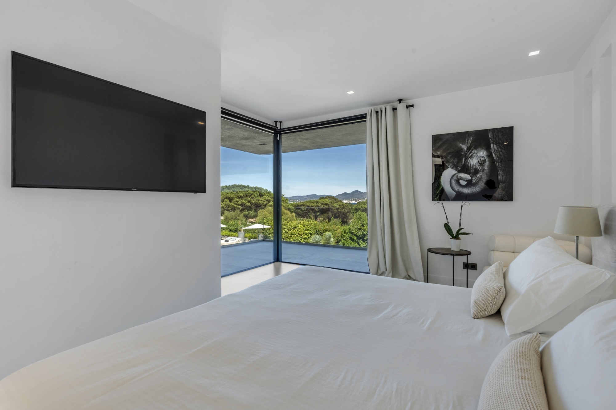 A quiet, sunlit scene of a luxury Villa stretches along the edge of a pale turquoise pool, its clean geometric lines softened by warm stone and glass. The villa offers five bedrooms, each with its own private bathroom, comfortably accommodating up to twelve guests. The clean and immaculate lines in which the bedrooms are arranged invite you to complete relaxation after a long and sunny day at the pool. They are very spacious, with a view of the pool and a sea of ​​greenery, and the bathrooms decorated with a modern touch make you want nothing more.
