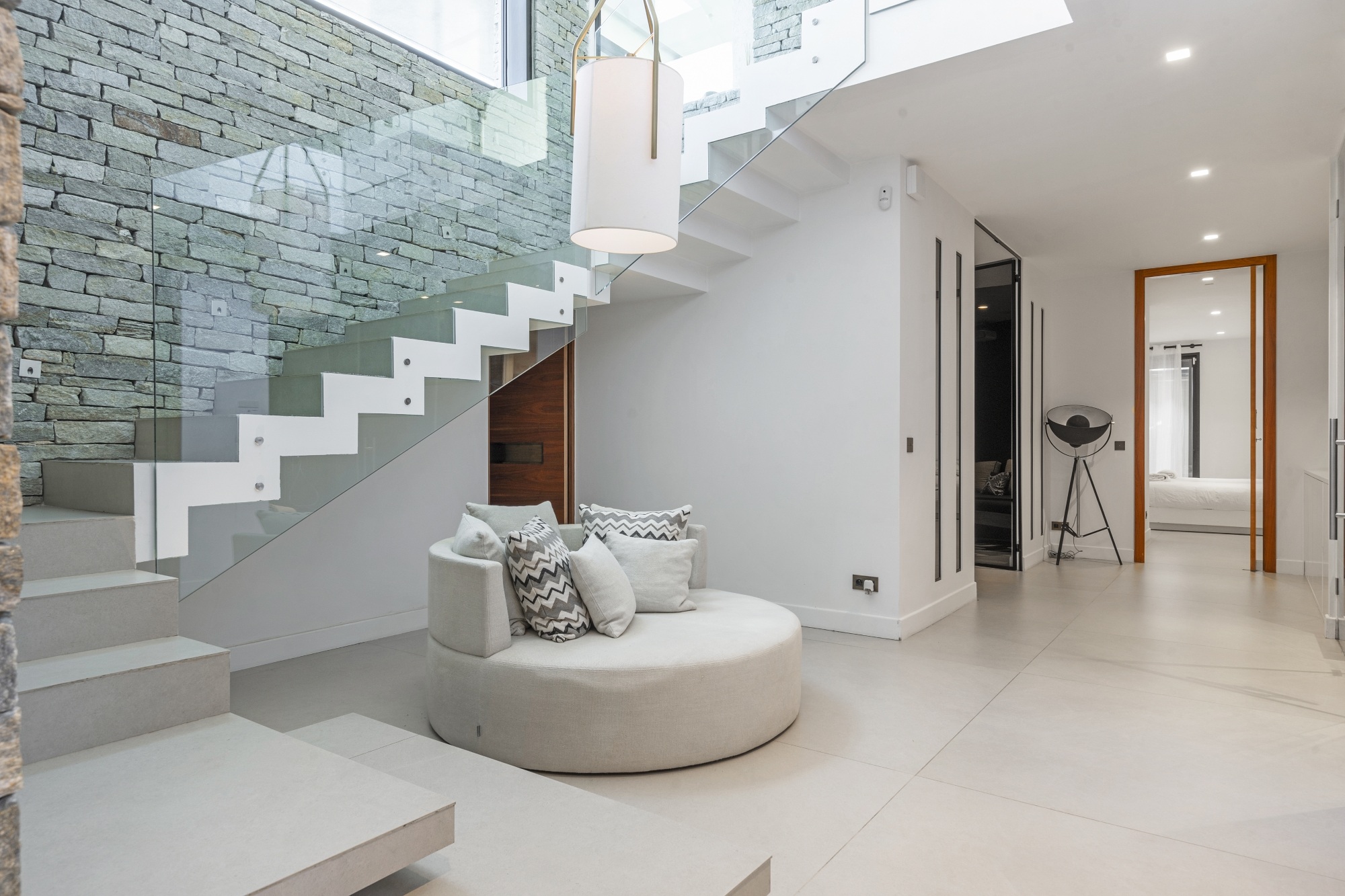 On the ground floor, a covered patio with simple outdoor furniture and potted plants forms an inviting outdoor living room. A calm, airy living room unfolds in soft, neutral tones. A low, curved sectional in a creamy linen hugs the room’s center, forming an embracing crescent that invites conversation and lingering.